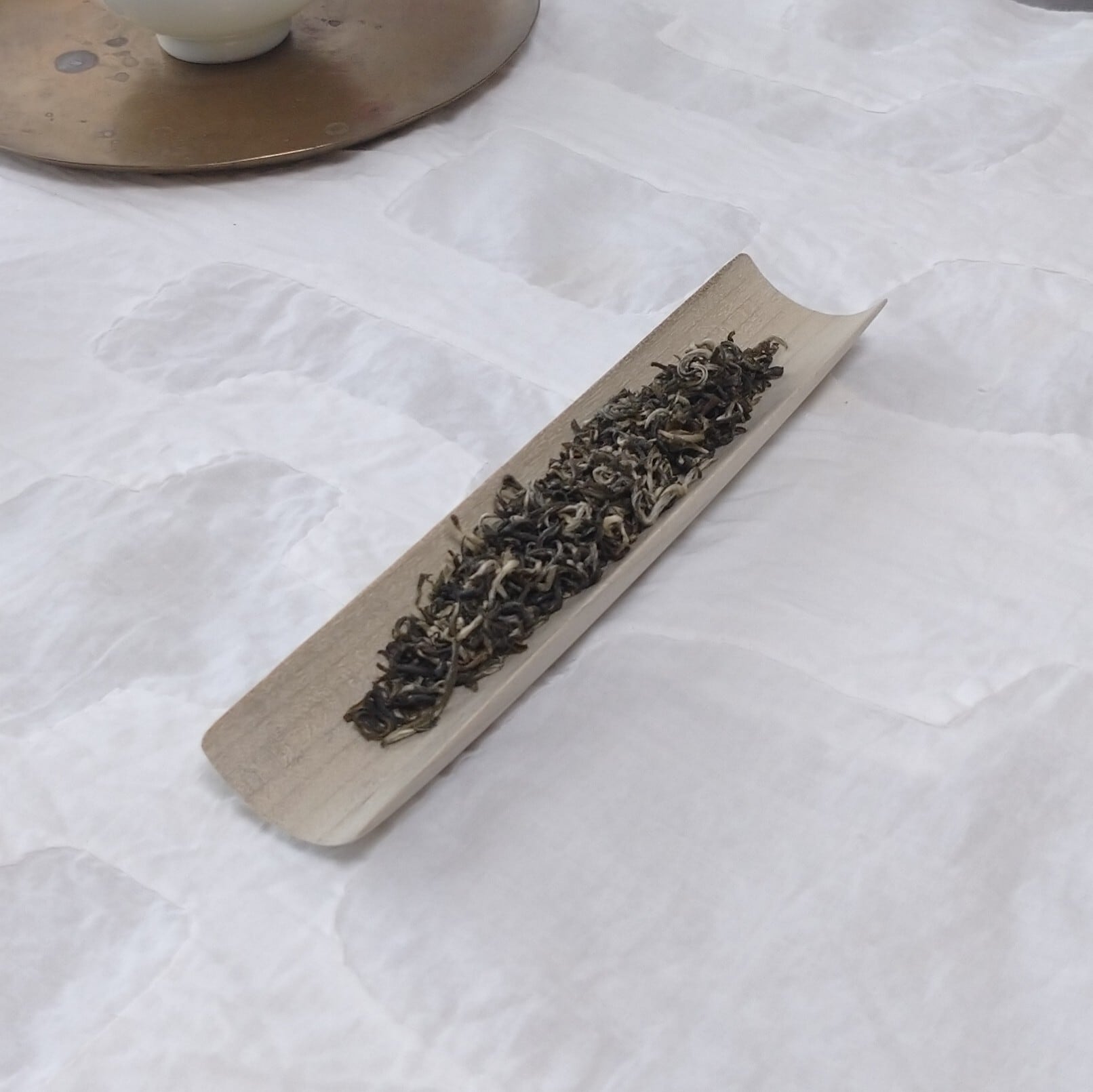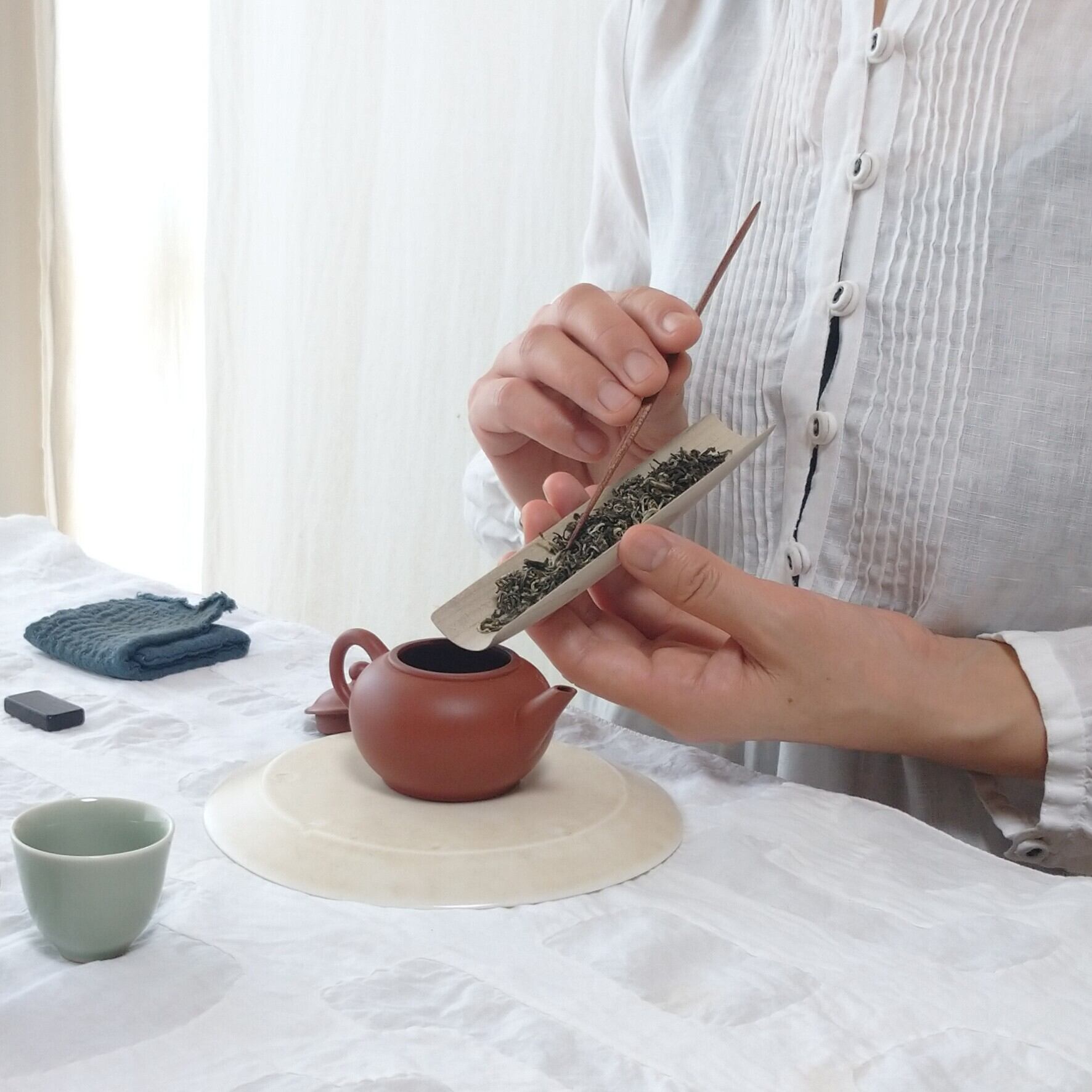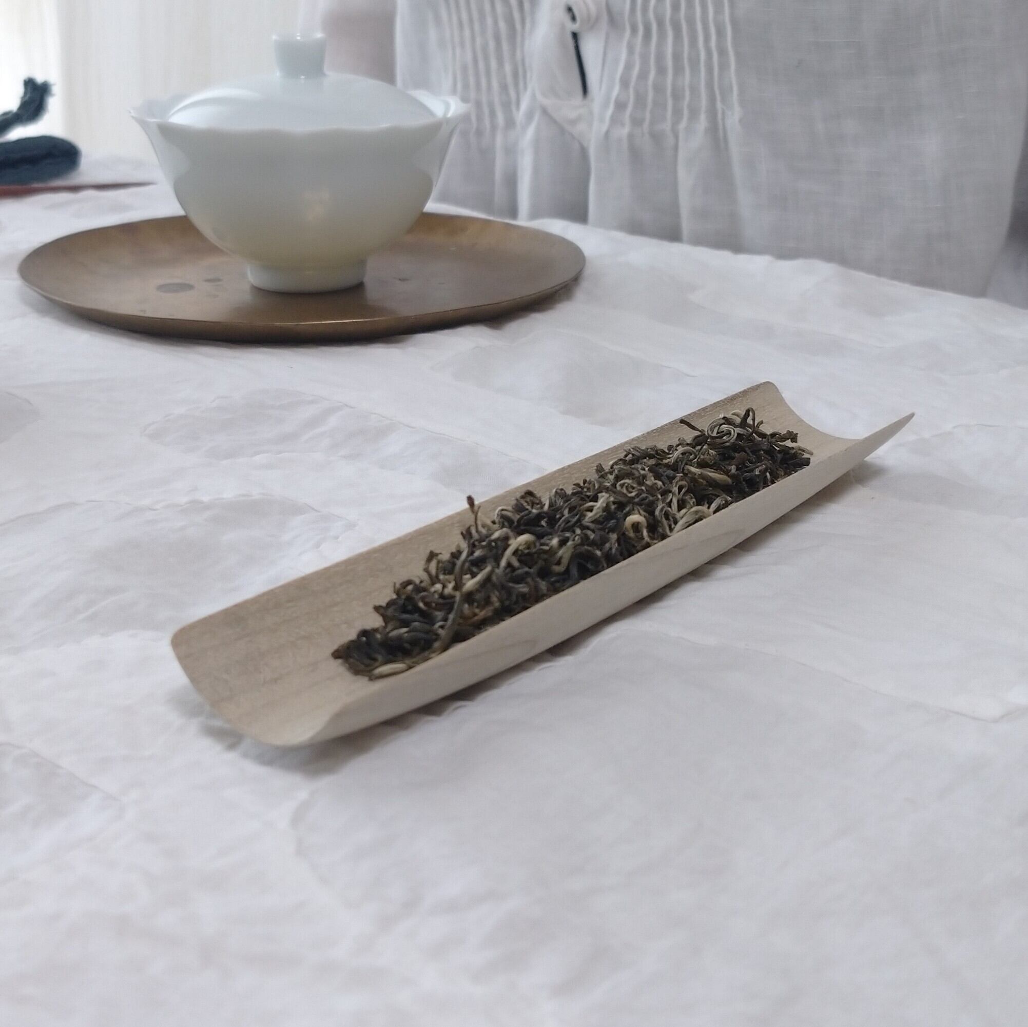 丸まった茶葉や小さめの茶葉を載せるのにぴったりです (写真では梔子雪芽を3g載せています)。