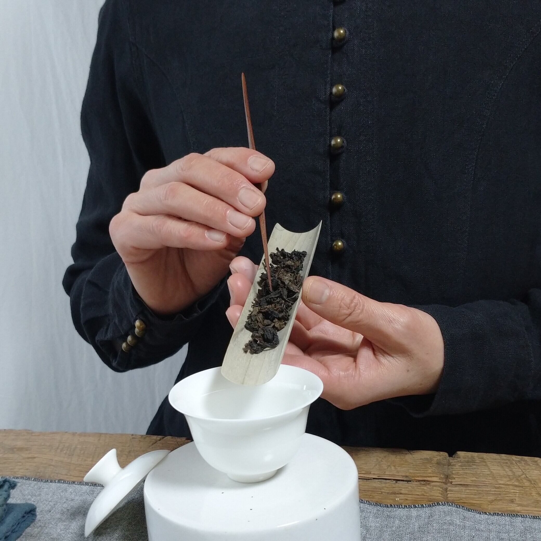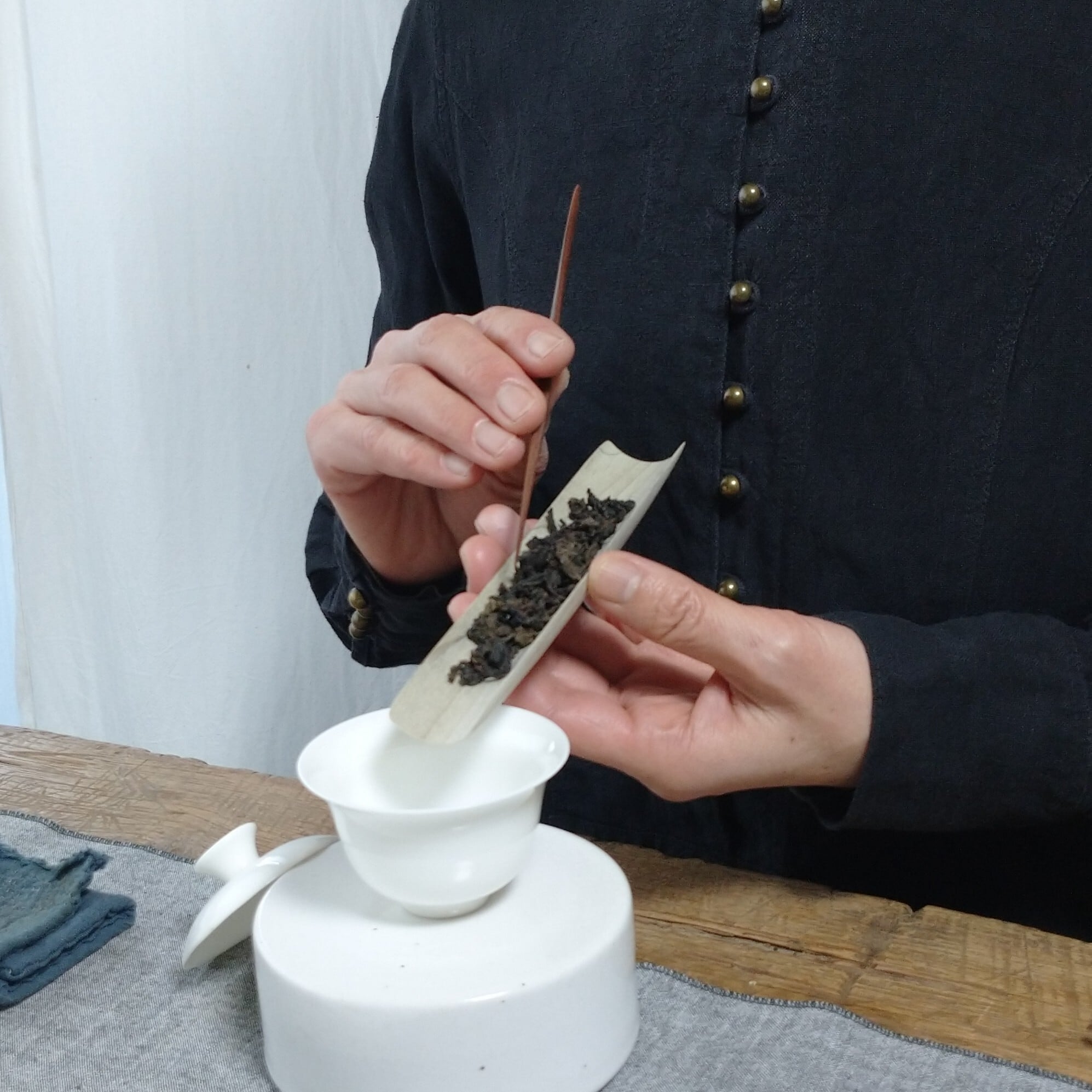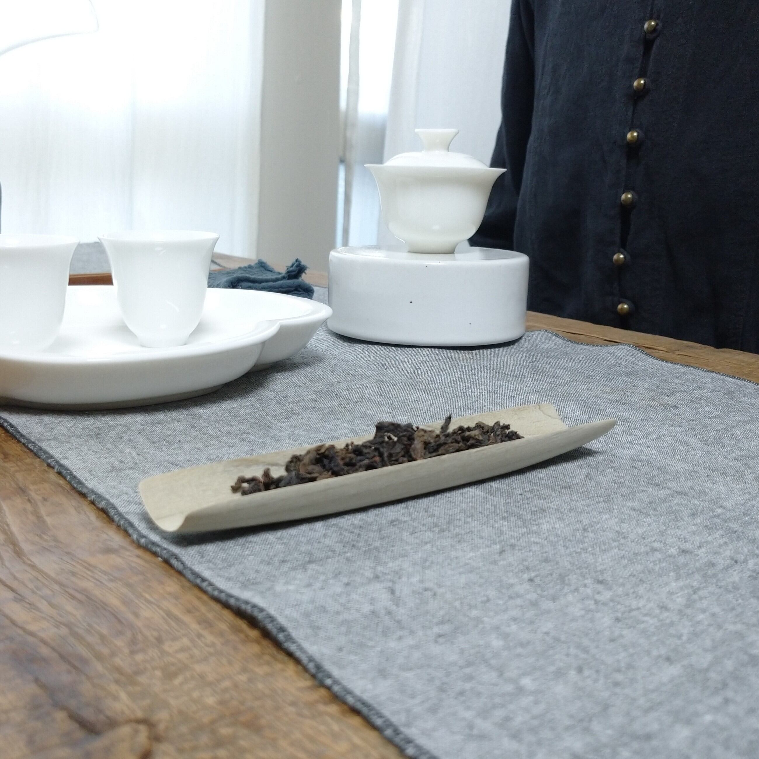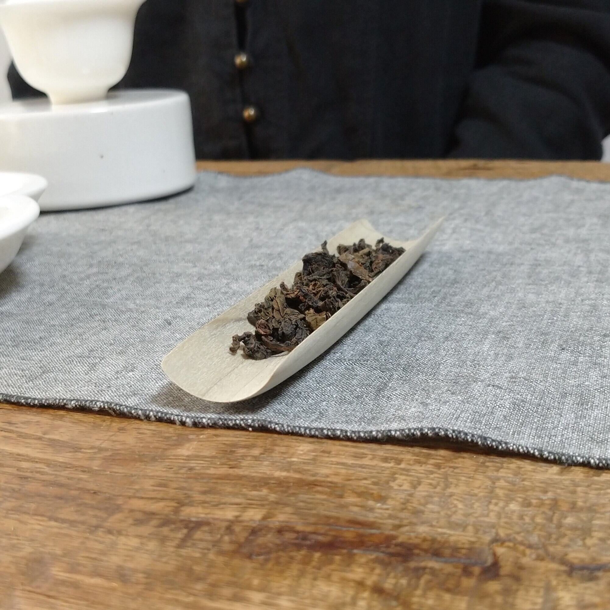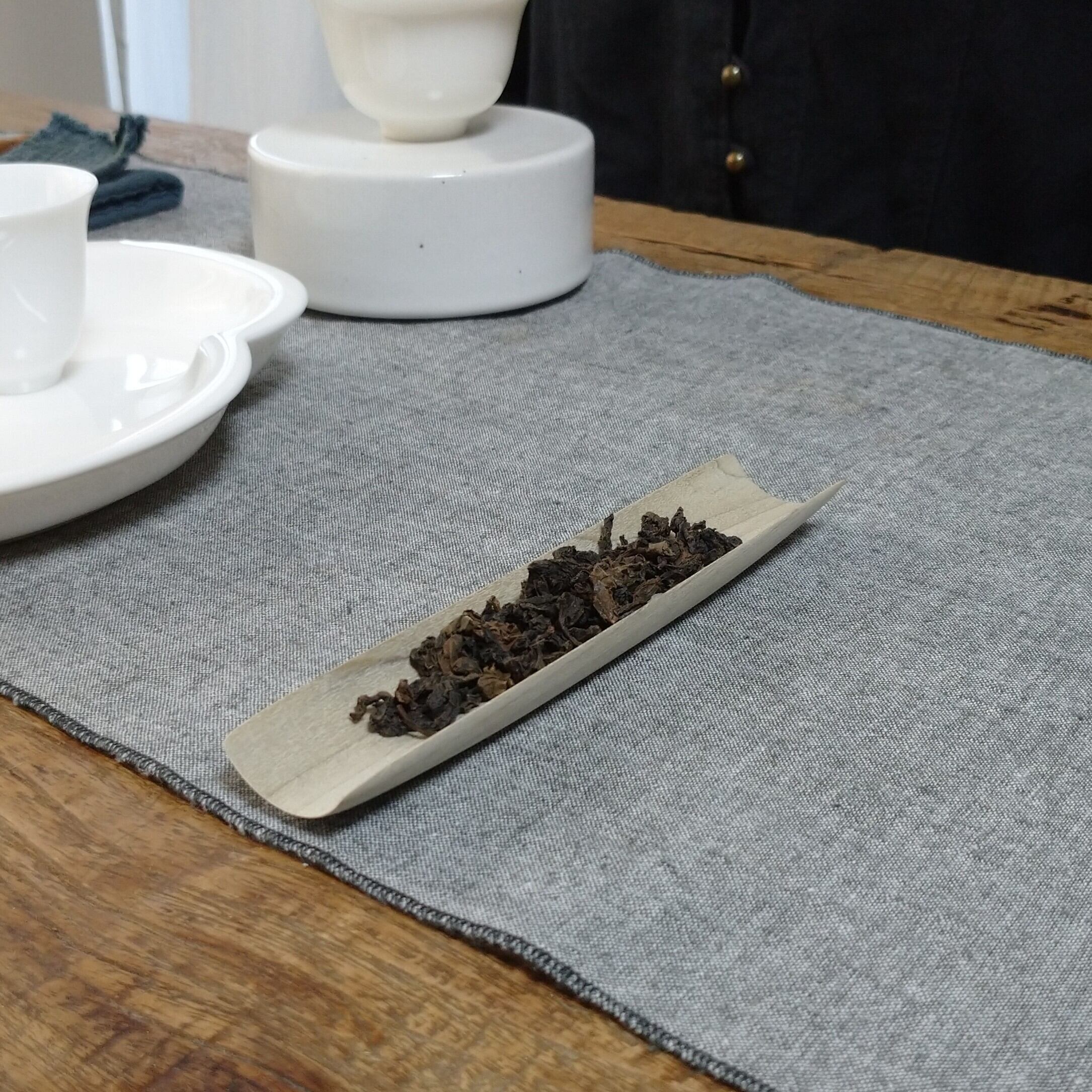 丸まった茶葉や小さめの茶葉を載せるのにぴったりです (写真では安渓肉桂を3g載せています)。