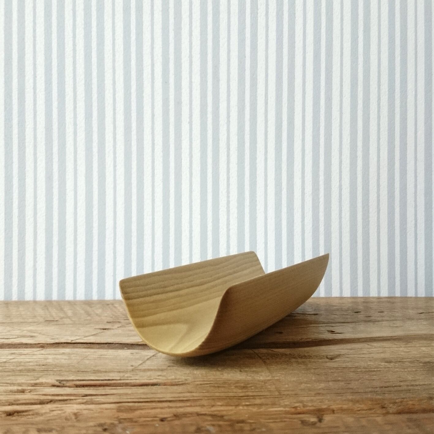ノミなどを使って削り出した後にサンドペーパーをかけ、最後に食用の亜麻仁油を塗って仕上げました。