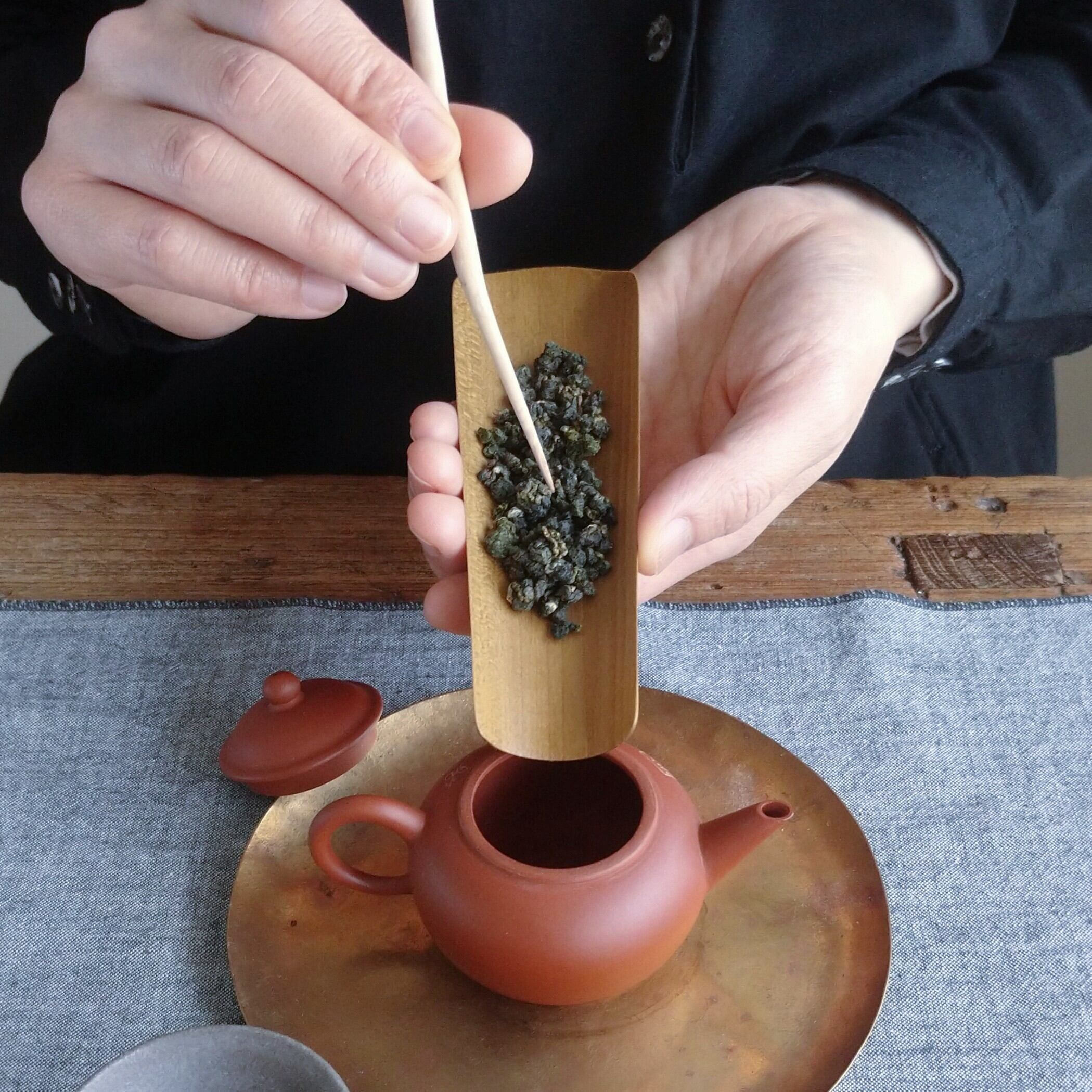 口の小さな茶壺には狭い側から、大きな茶壺や蓋碗には広い側から茶葉を移すと入れやすいと思います。(写真の茶壺の口径は35mmです。)