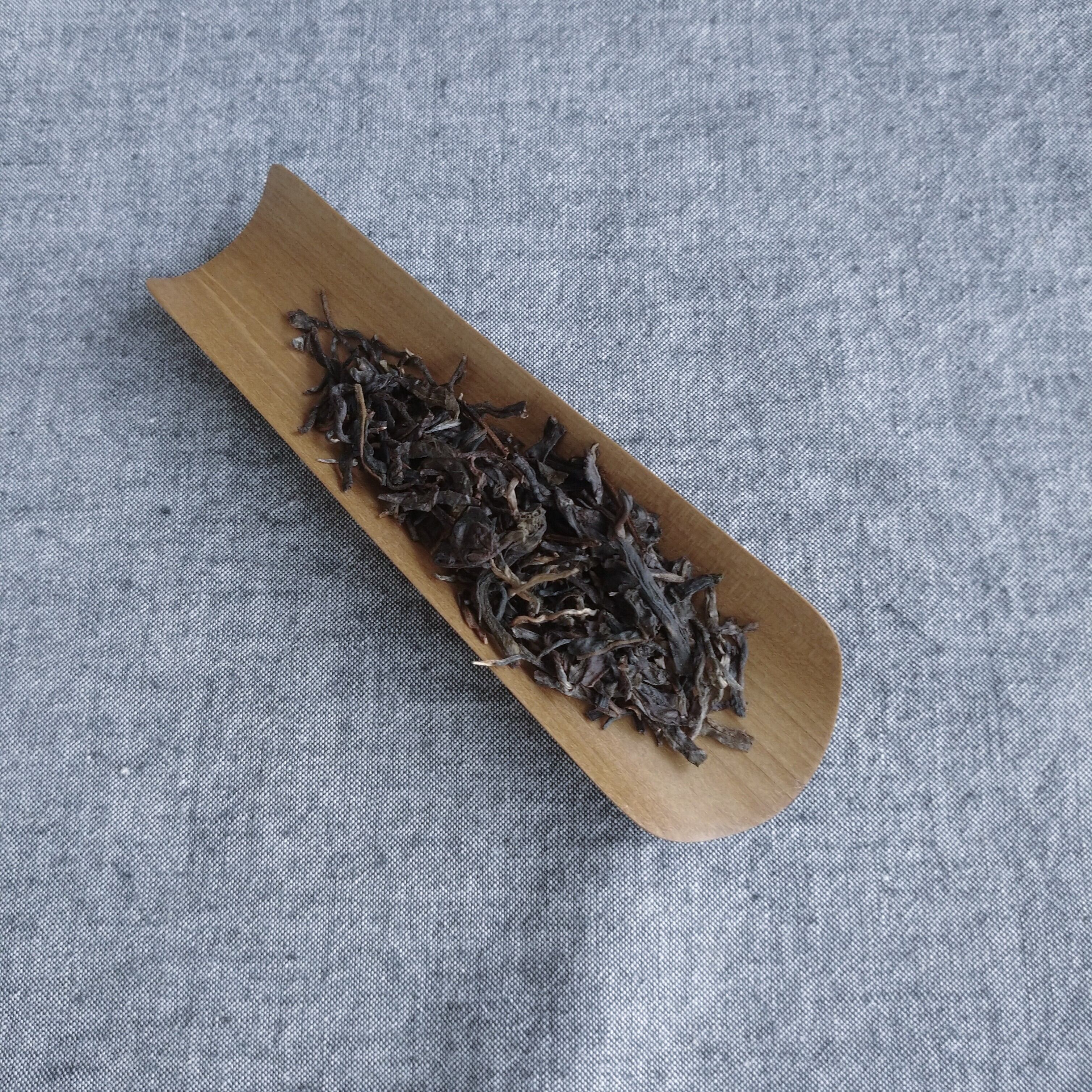 浅めの茶則なので、大きな茶葉はあまり沢山載せられませんが、鉄観音のように丸まった茶葉や、金駿眉のような小さな茶葉を淹れる際にはとても便利です。(写真はそれぞれ、景邁山を5g、阿里山高山金萱茶を5g載せています。)