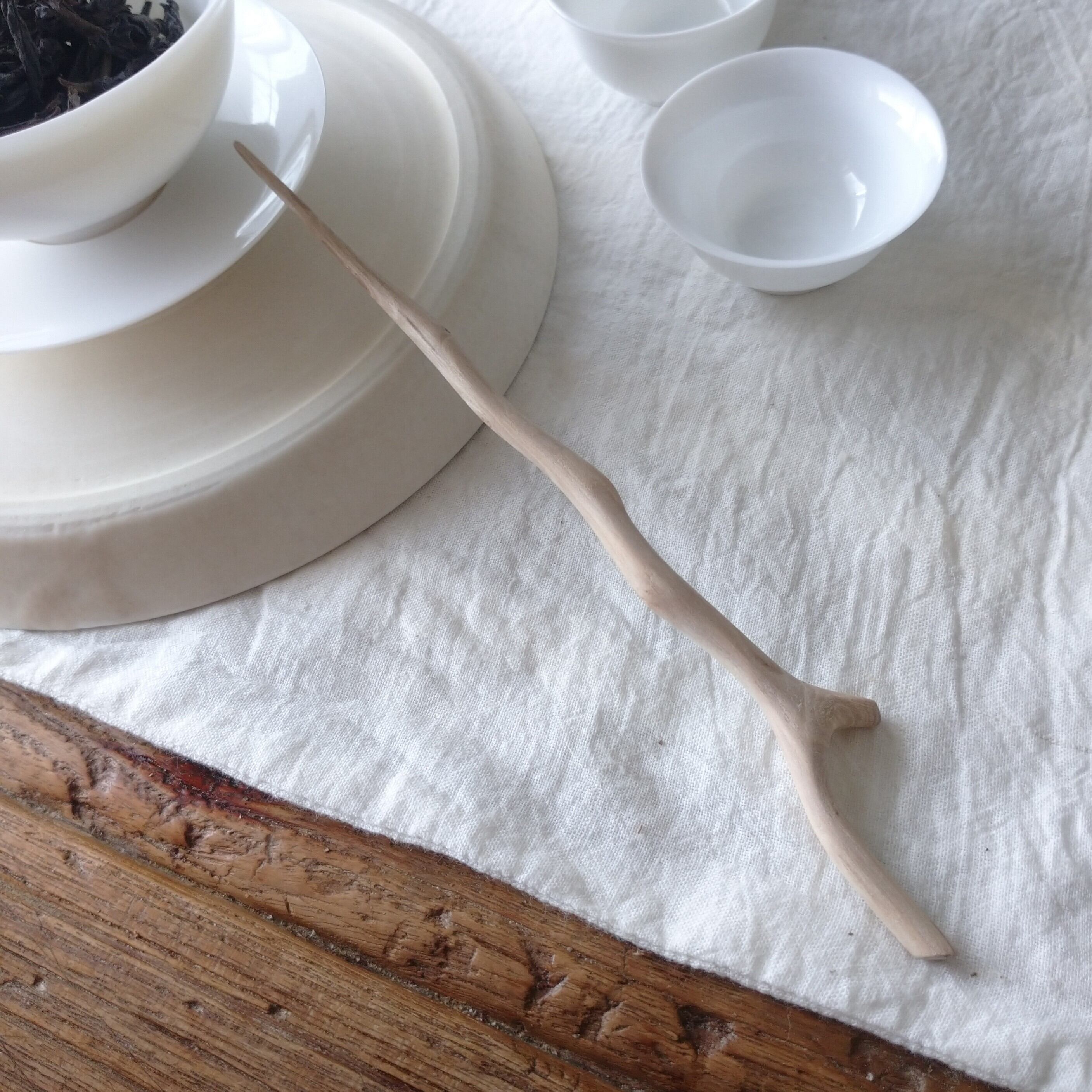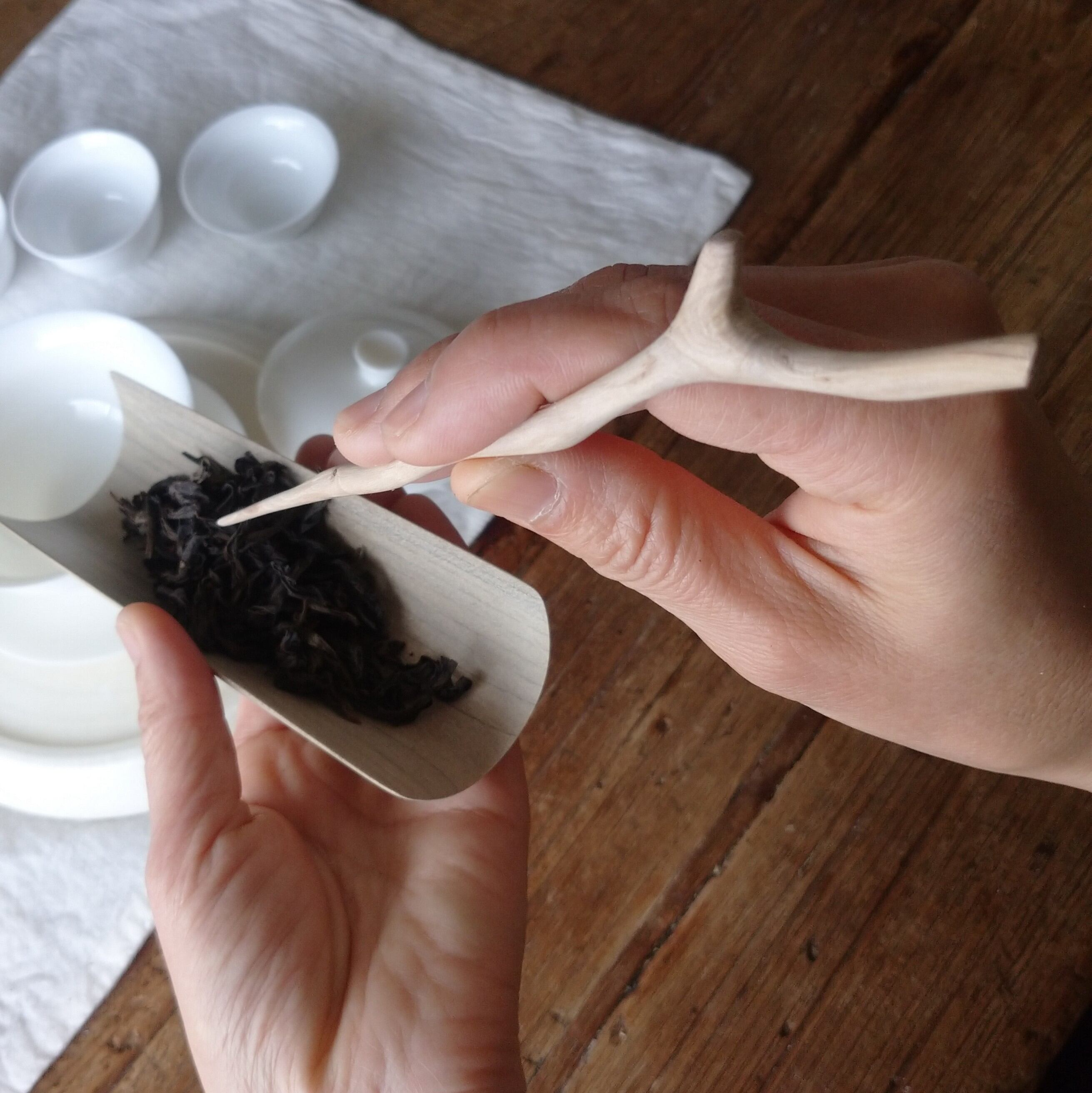 茶通(ちゃどおし)は、茶壺の注ぎ口が詰まった時に使う道具とされていますが、他にも、茶則を使って茶壺に茶葉を入れる際に添えたり、一煎淹れた後に茶壺の中で偏った茶葉を馴らしたりすることができます。