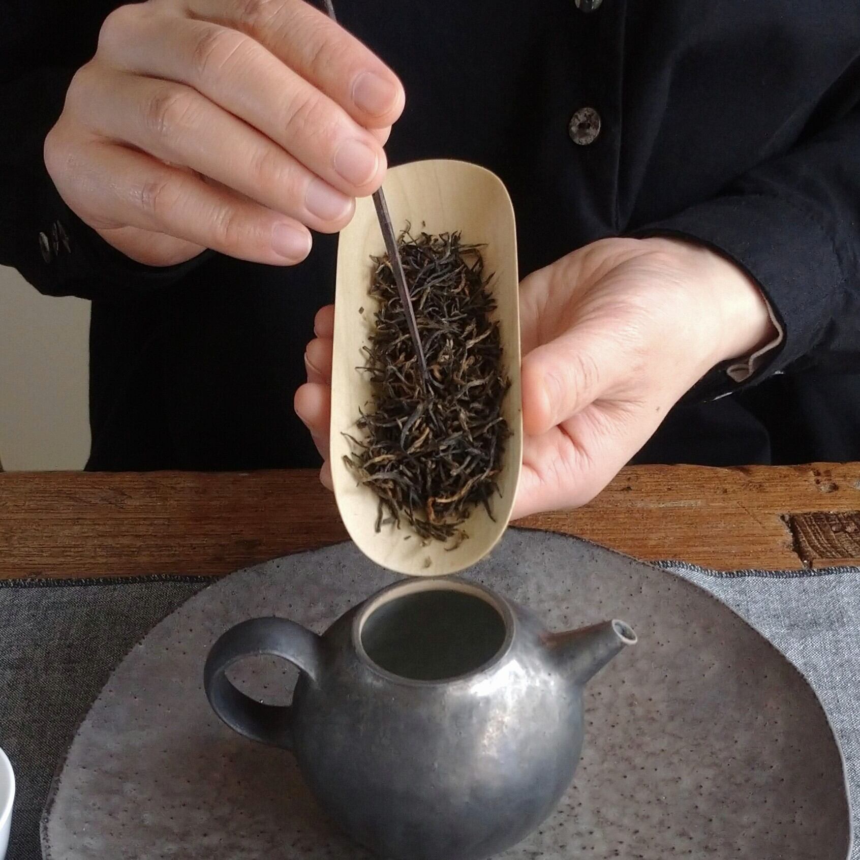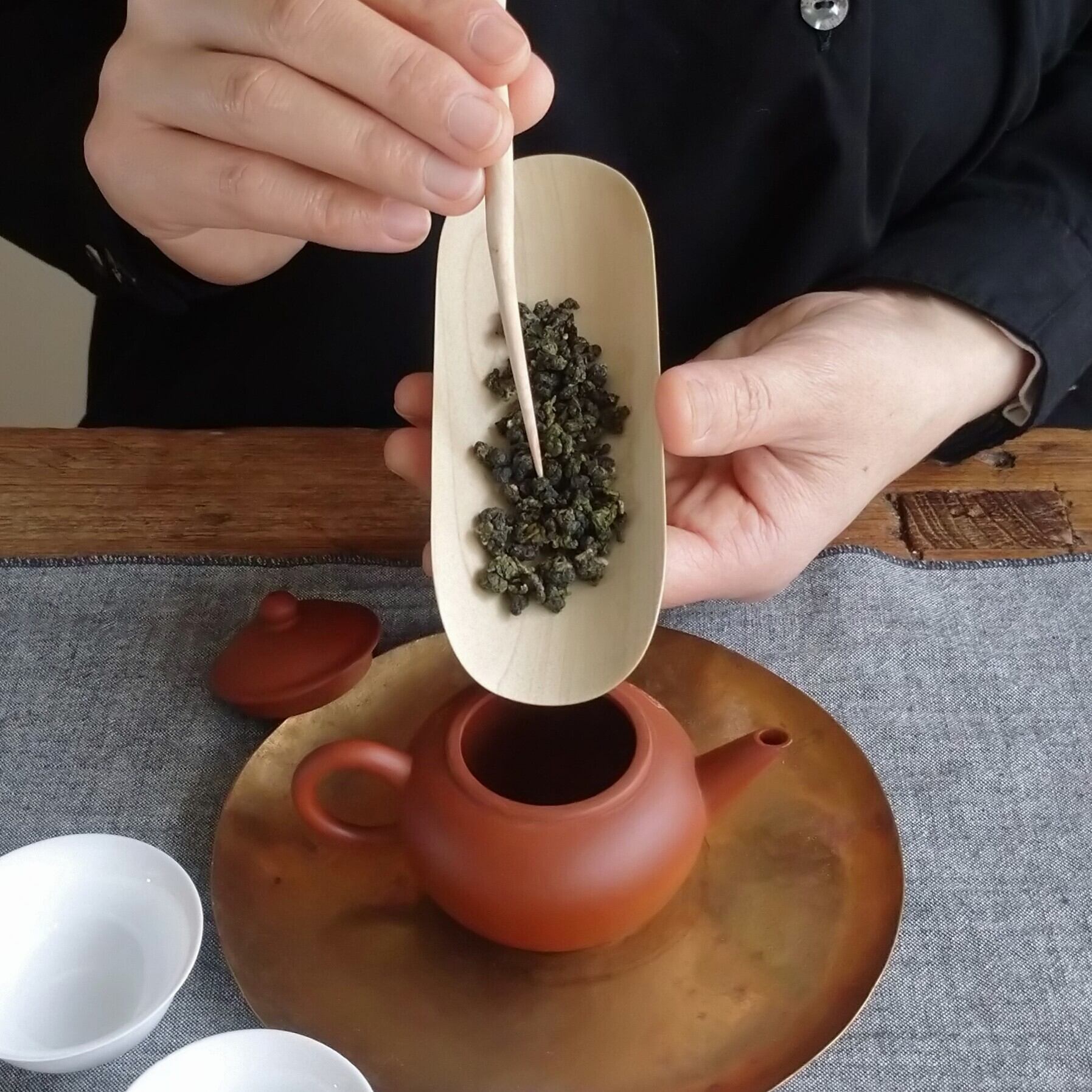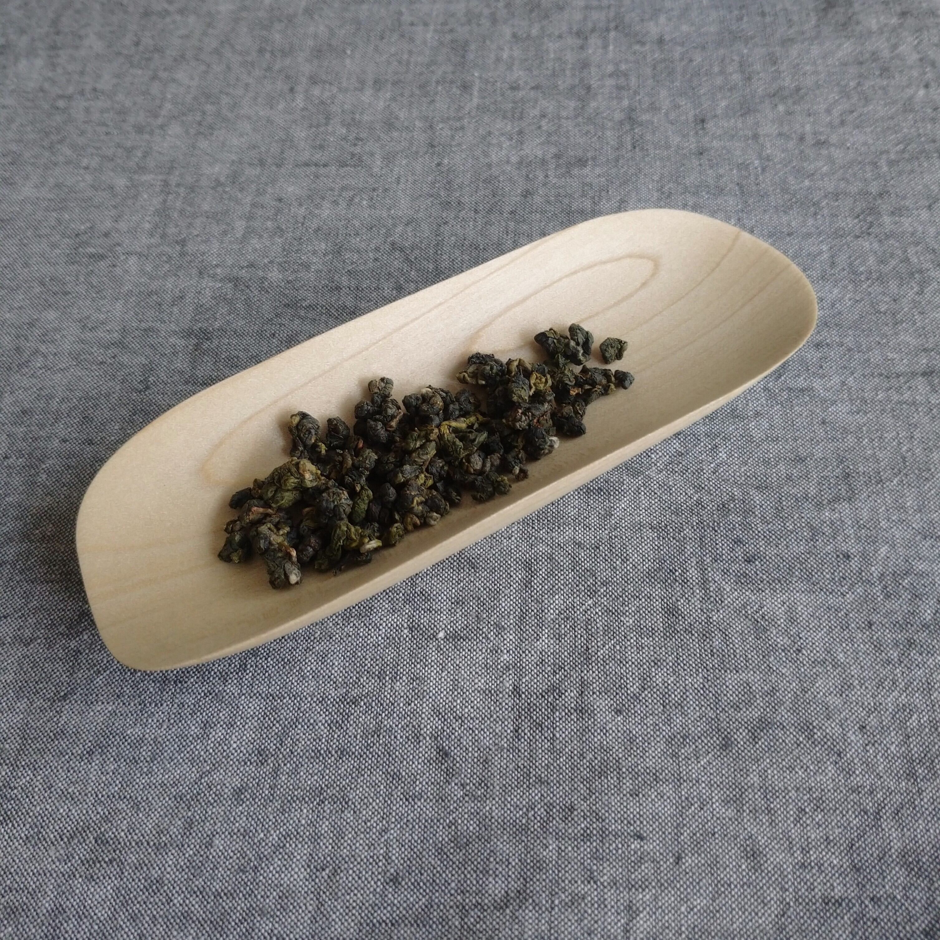やや浅めの茶則なので、鉄観音のように丸まった茶葉や、金駿眉のような小さめの茶葉を載せるのに向いています。(写真はそれぞれ、金駿眉を5g、阿里山高山金萱を5g載せています。)
