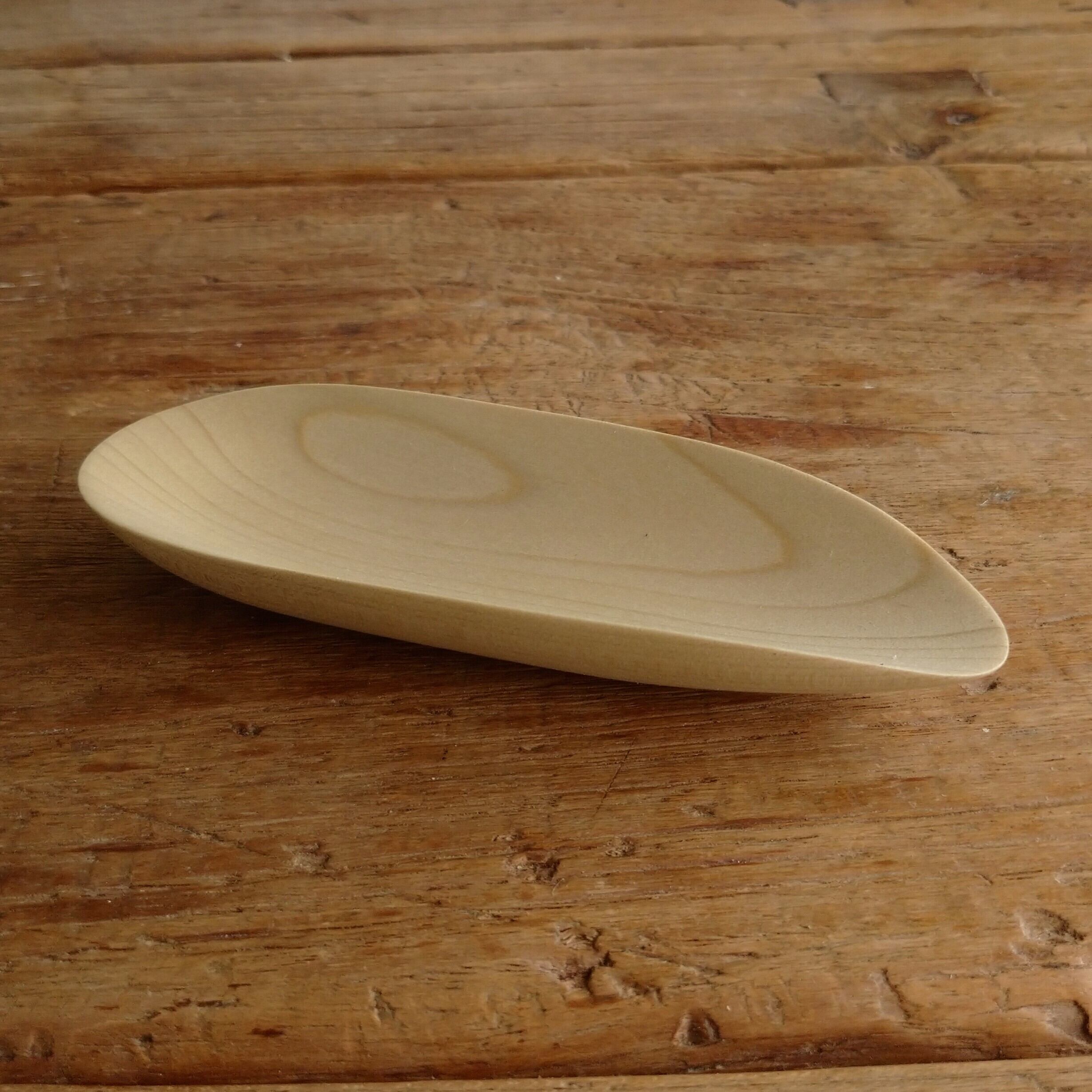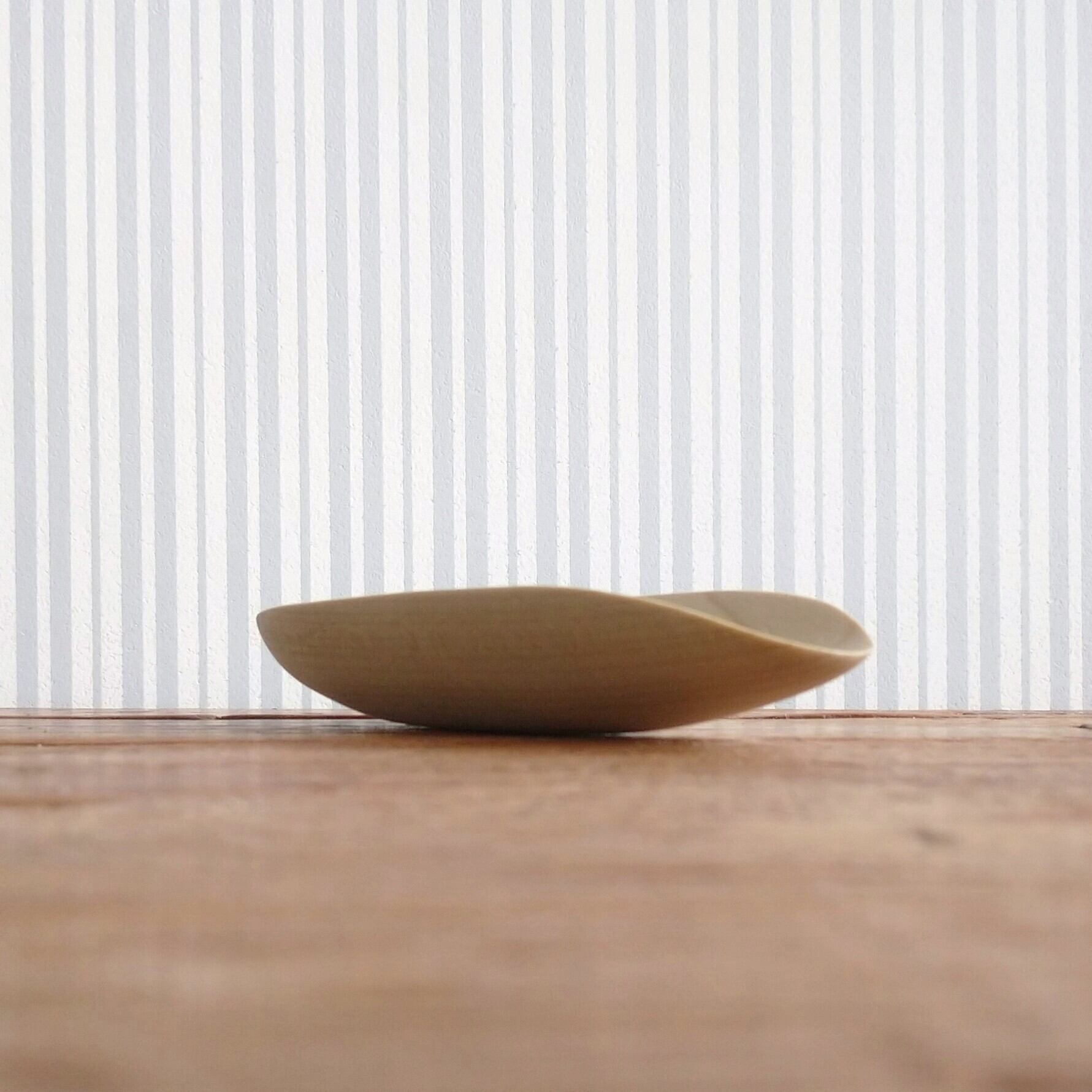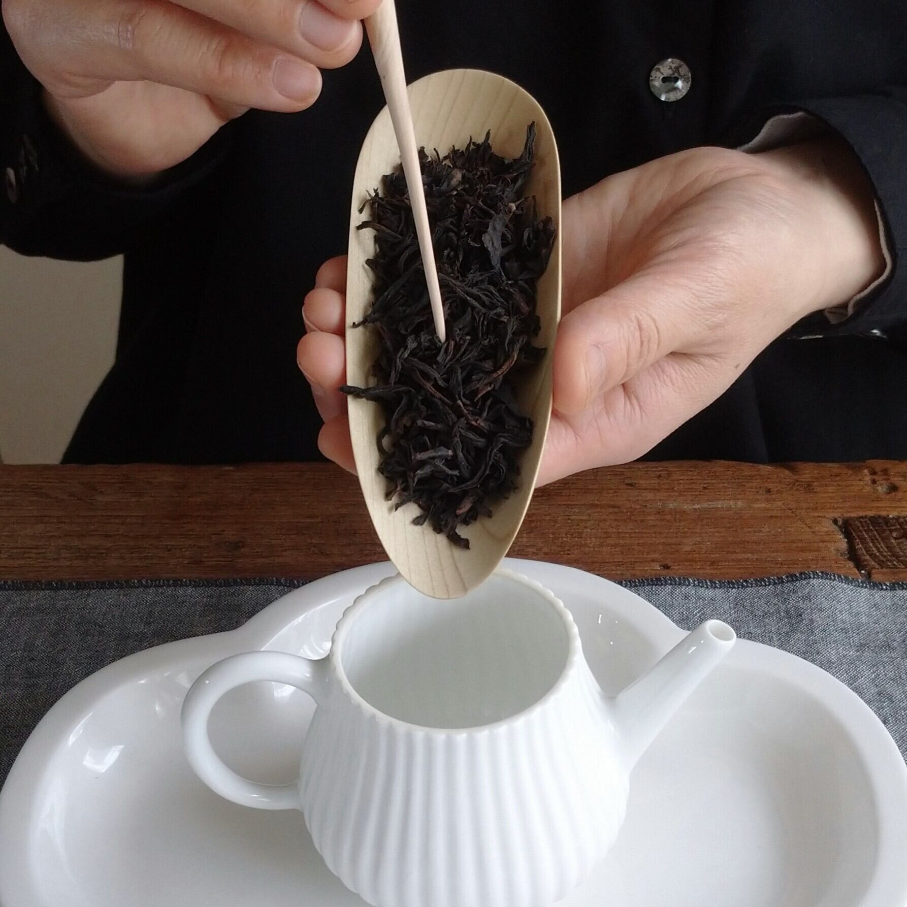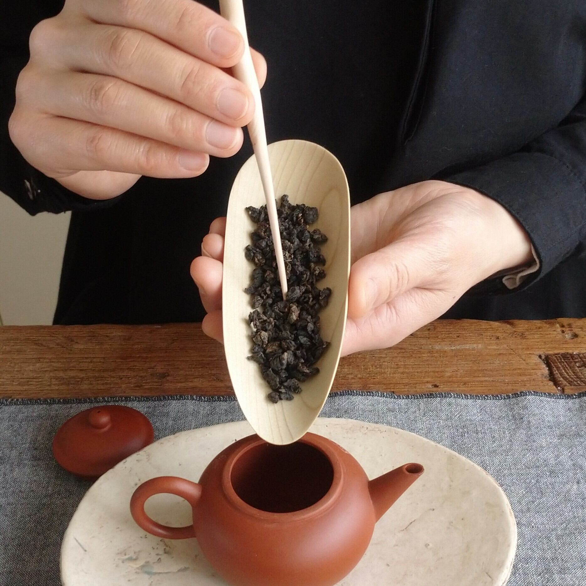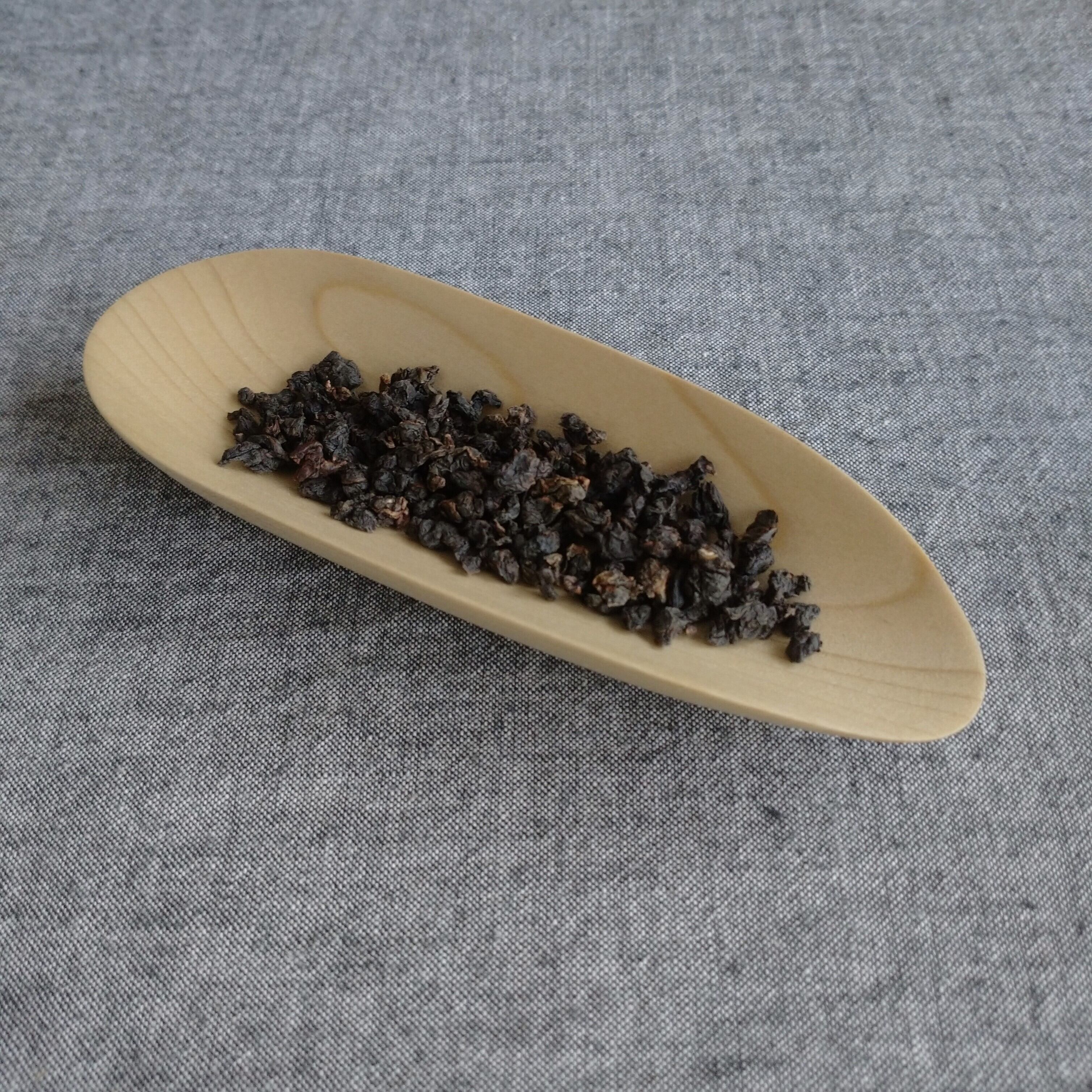 やや浅めの、笹舟の形をした茶則を作りました。鉄観音のように丸まった茶葉や、金駿眉のような小さめの茶葉を載せるのに向いています。(写真はそれぞれ、野生正山小種を5g、白芽奇蘭を5g載せています。)