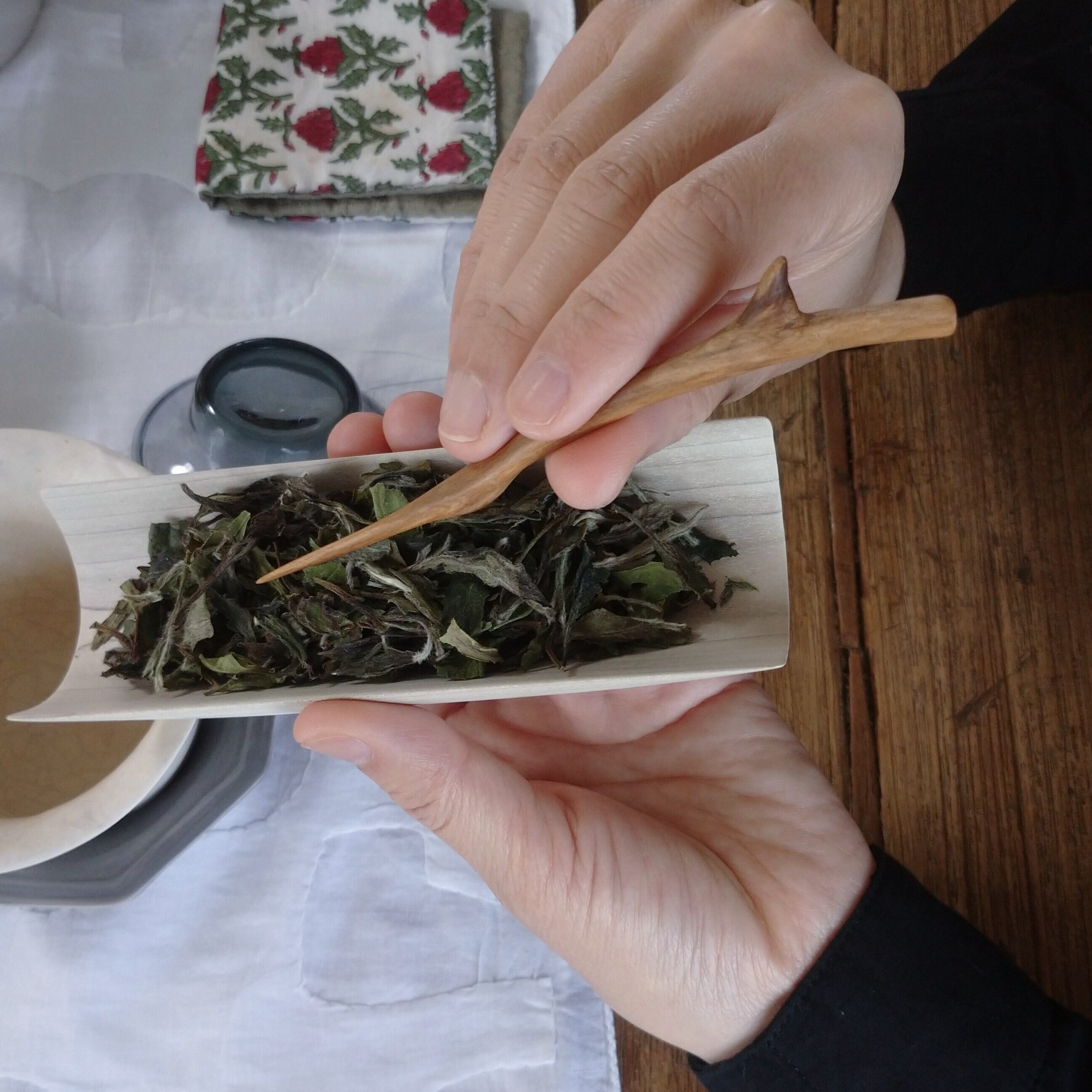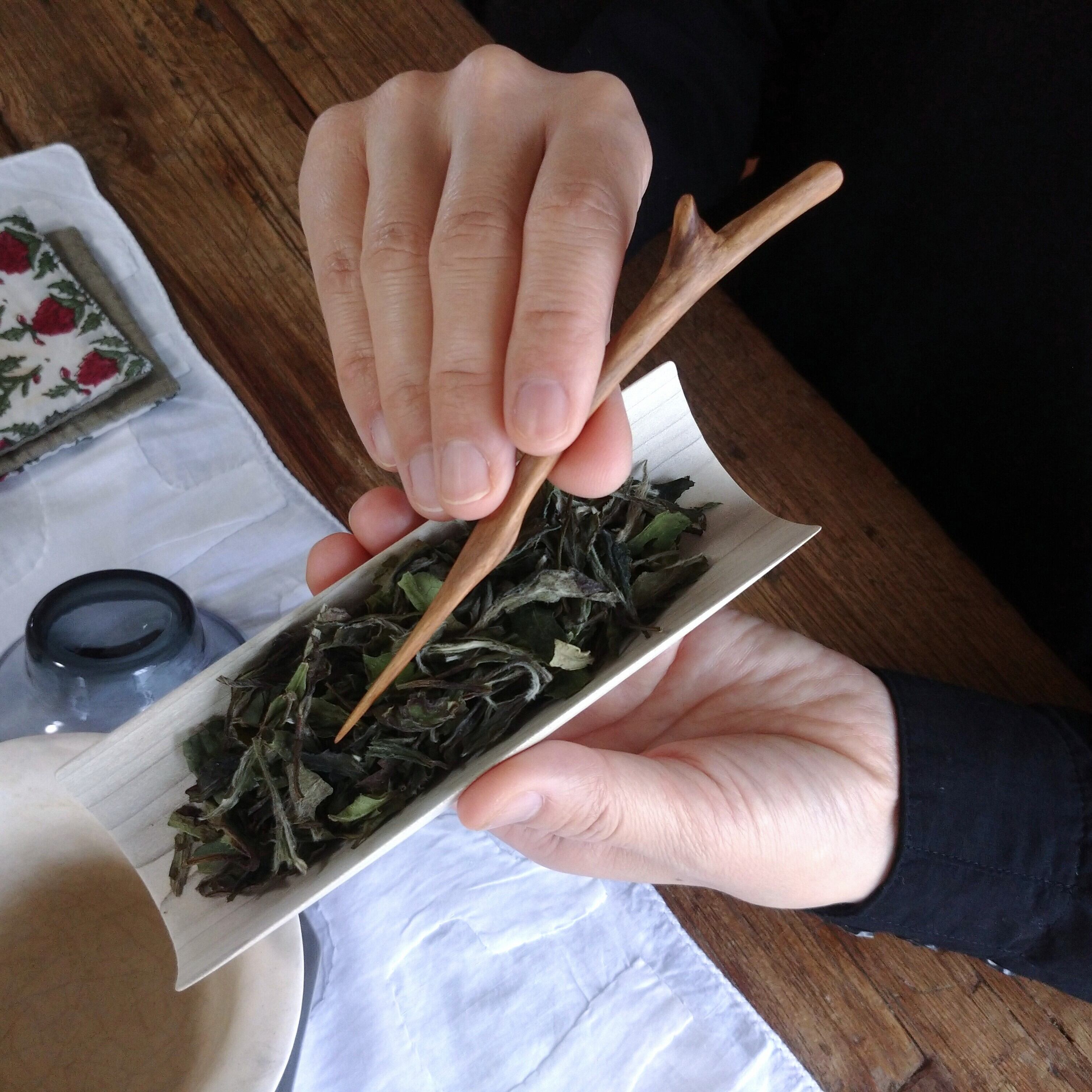 茶通(ちゃどおし)は、茶壺の注ぎ口が詰まった時に使う道具とされていますが、他にも、茶則を使って茶壺に茶葉を入れる際に添えたり、一煎淹れた後に茶壺の中で偏った茶葉を馴らしたりすることができます。