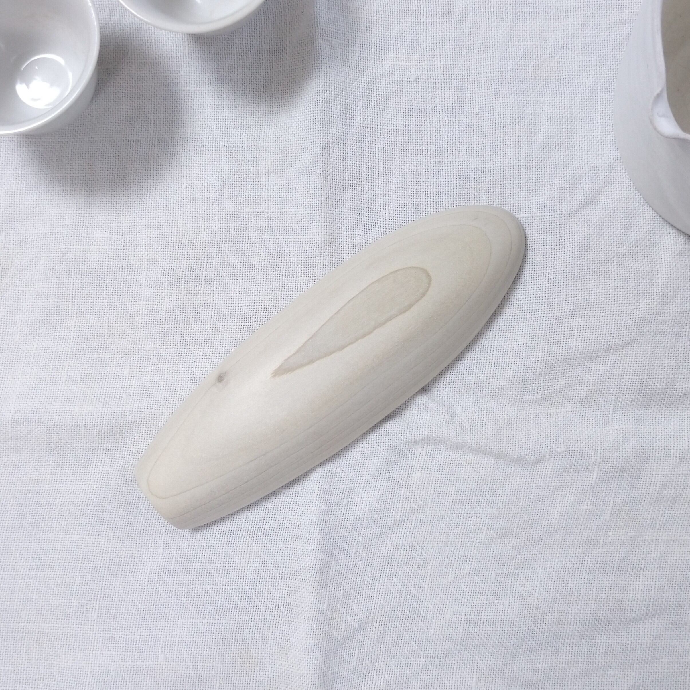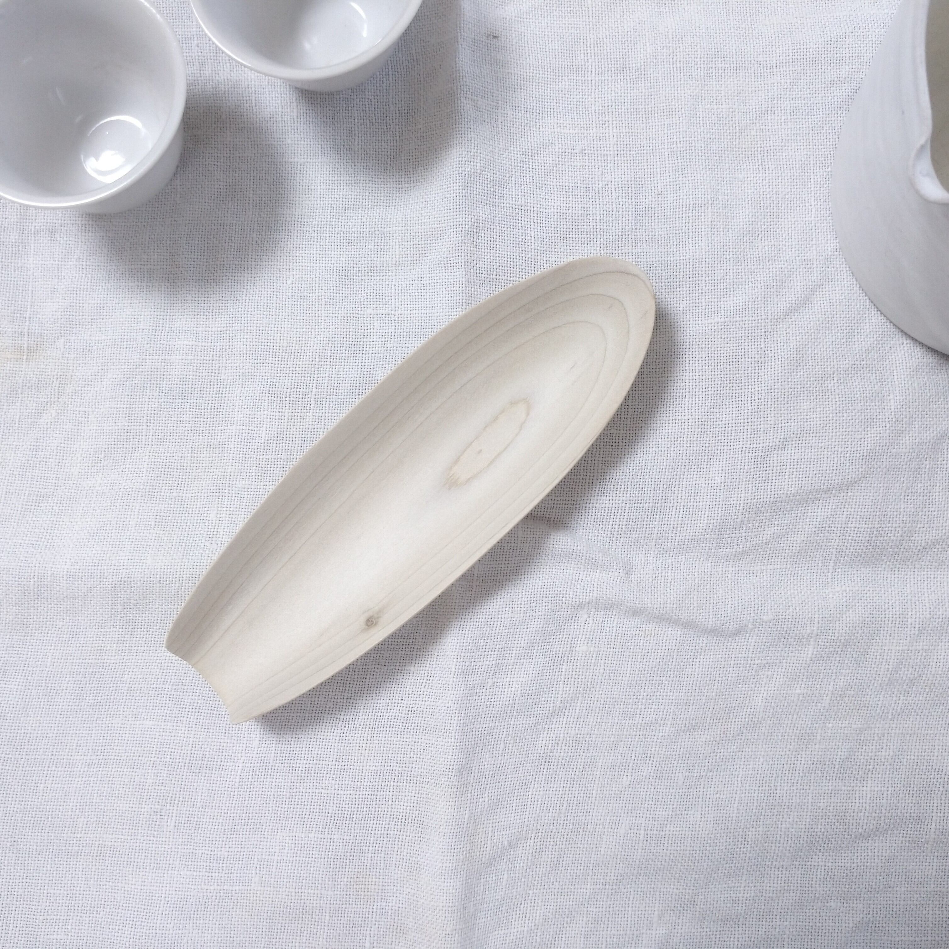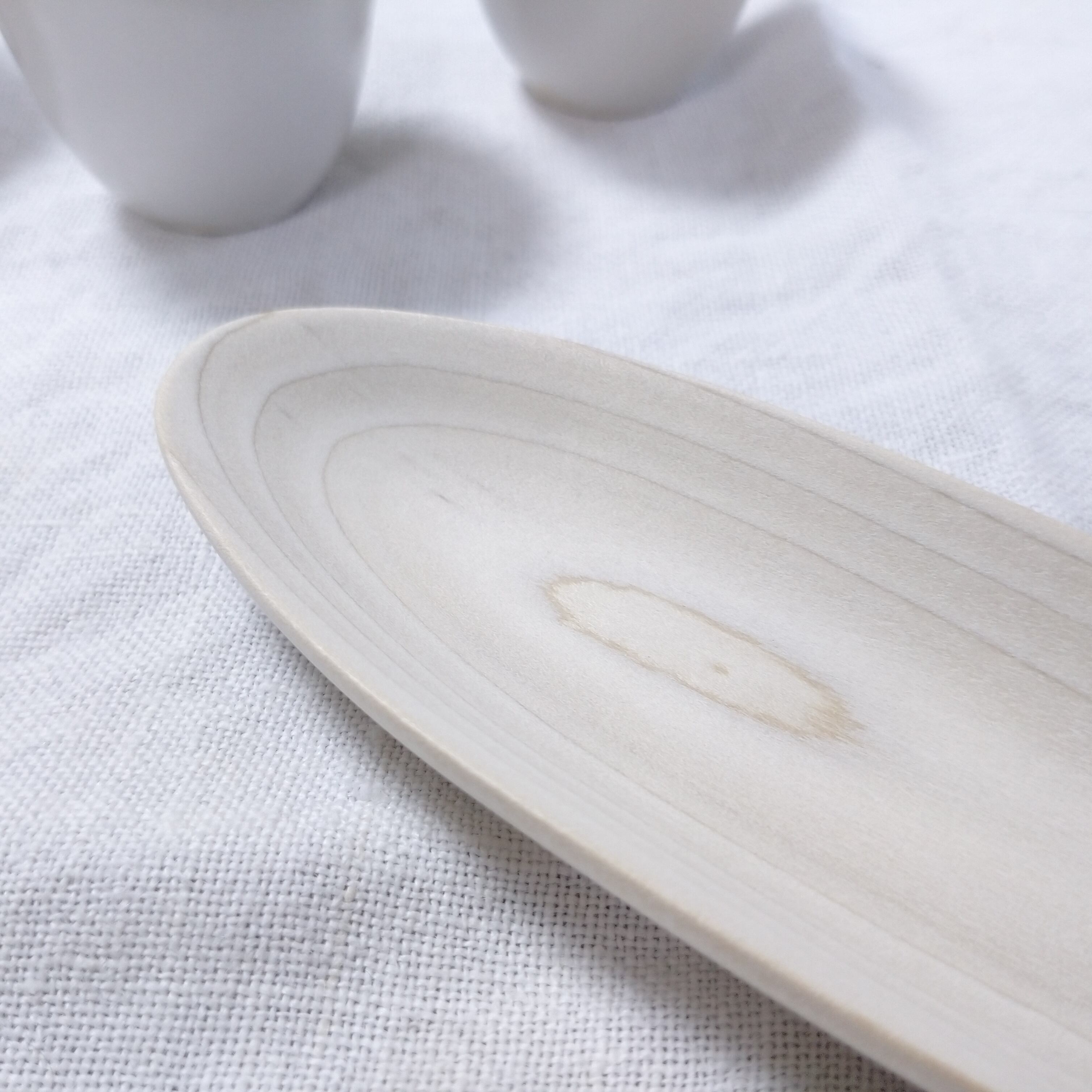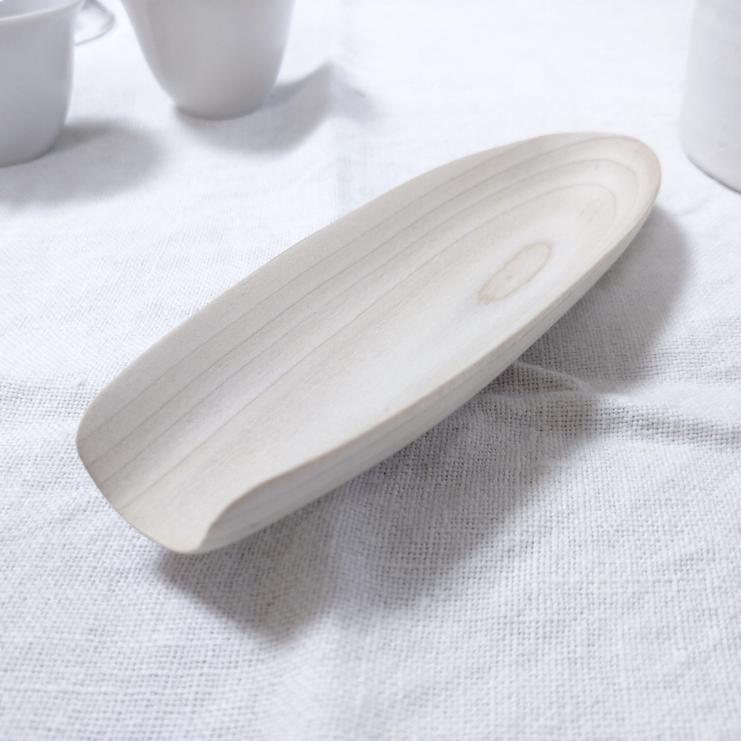 朴の木独特のクリームがかった白さがきれいな茶則ができました。木地の白さを残すため、無塗装で仕上げています。