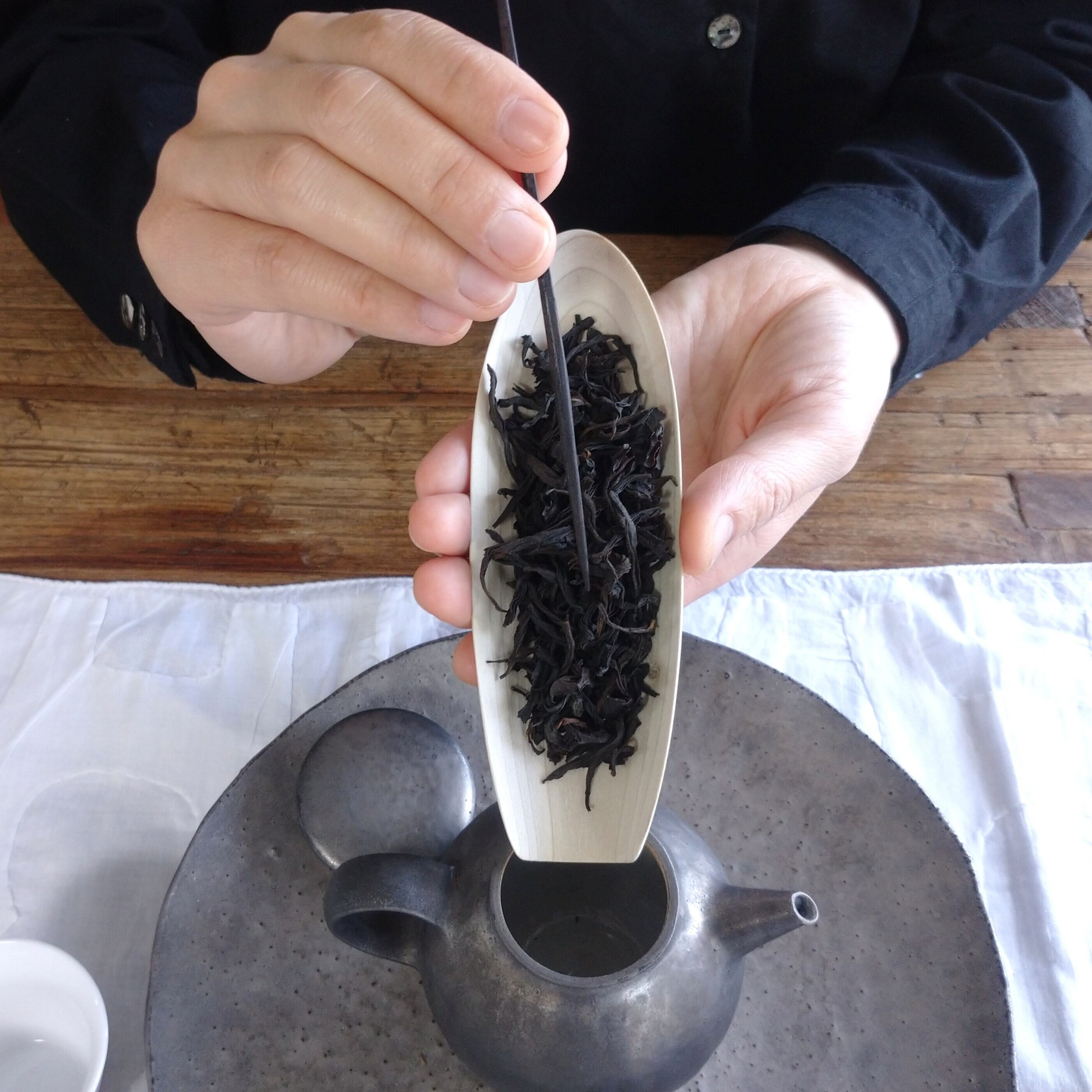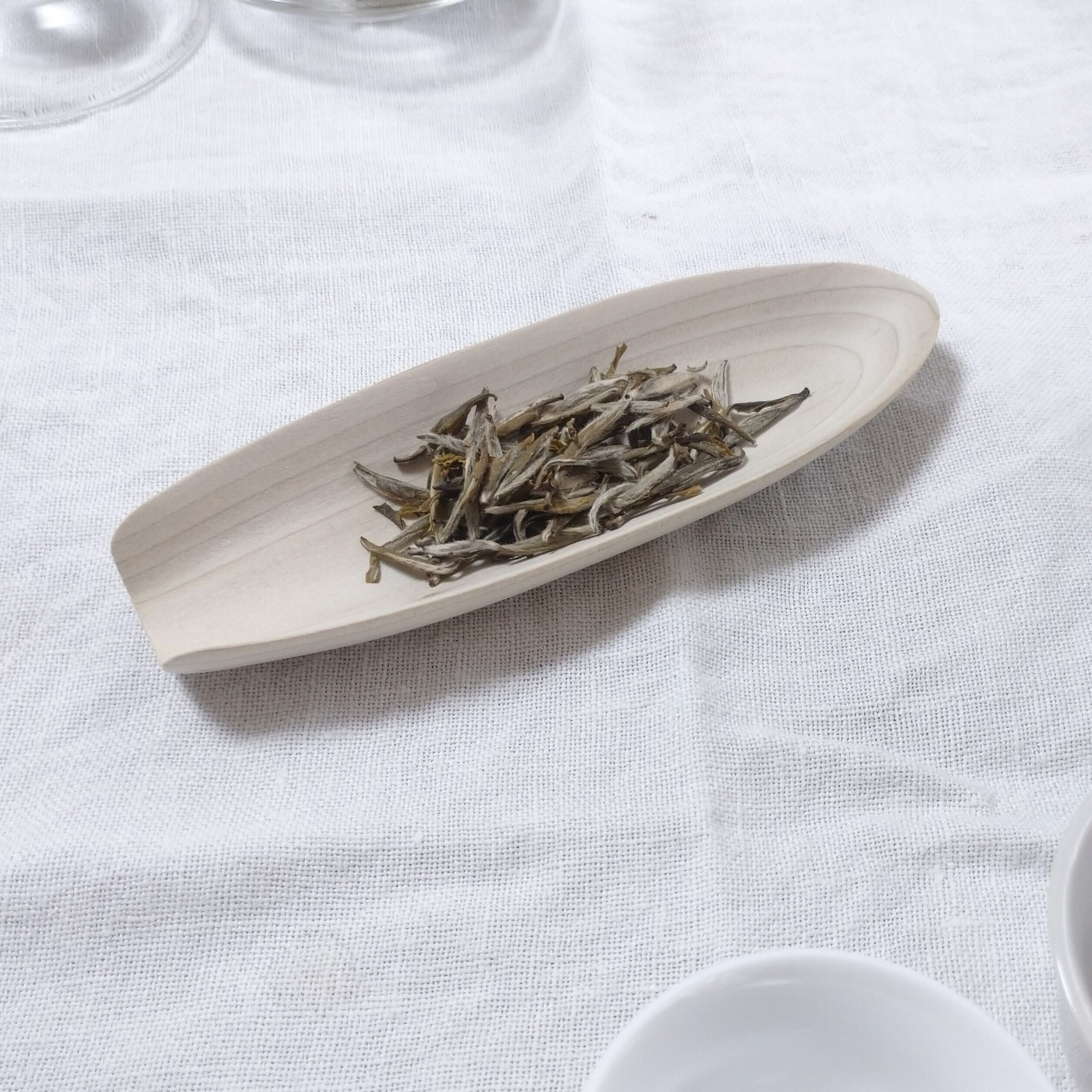 浅めの茶則なので、小さめ~中程度の茶葉を載せるのに向いています。(写真はそれぞれ、茉莉花白毫を2g、正山小種を5g載せています。)