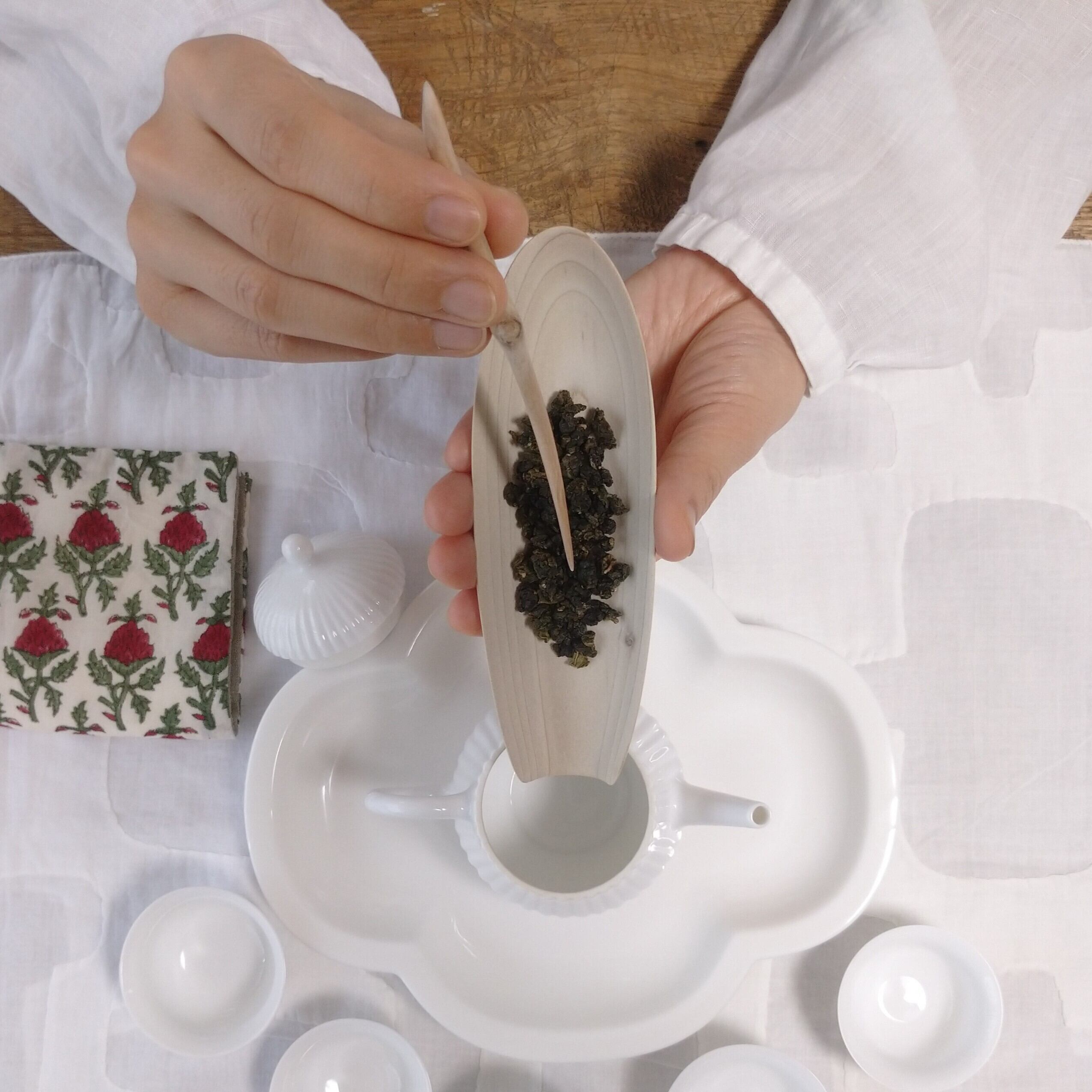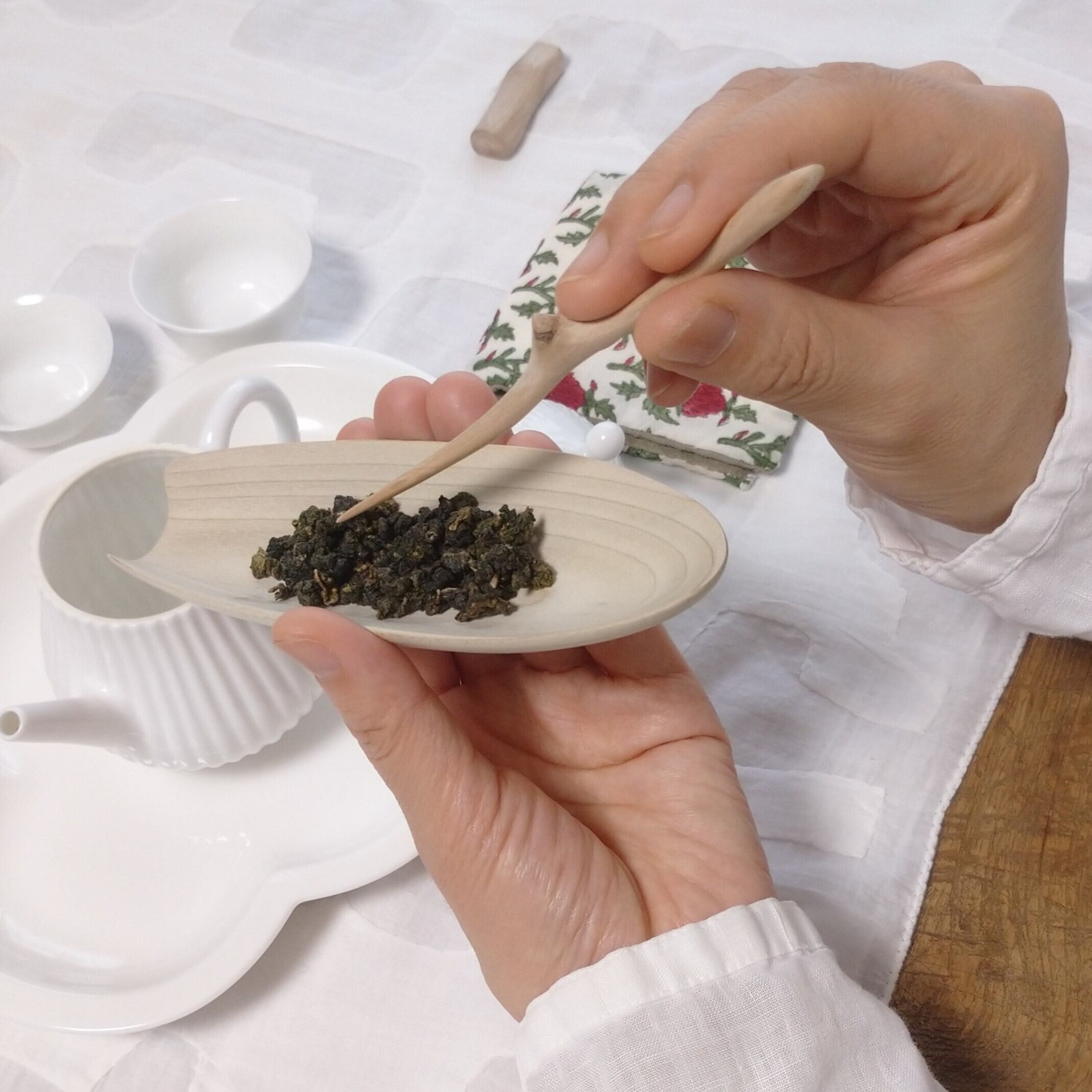 茶通(ちゃどおし)は、茶壺の注ぎ口が詰まった時に使う道具とされていますが、他にも、茶則を使って茶壺に茶葉を入れる際に添えたり、一煎淹れた後に茶壺の中で偏った茶葉を馴らしたりすることができます。