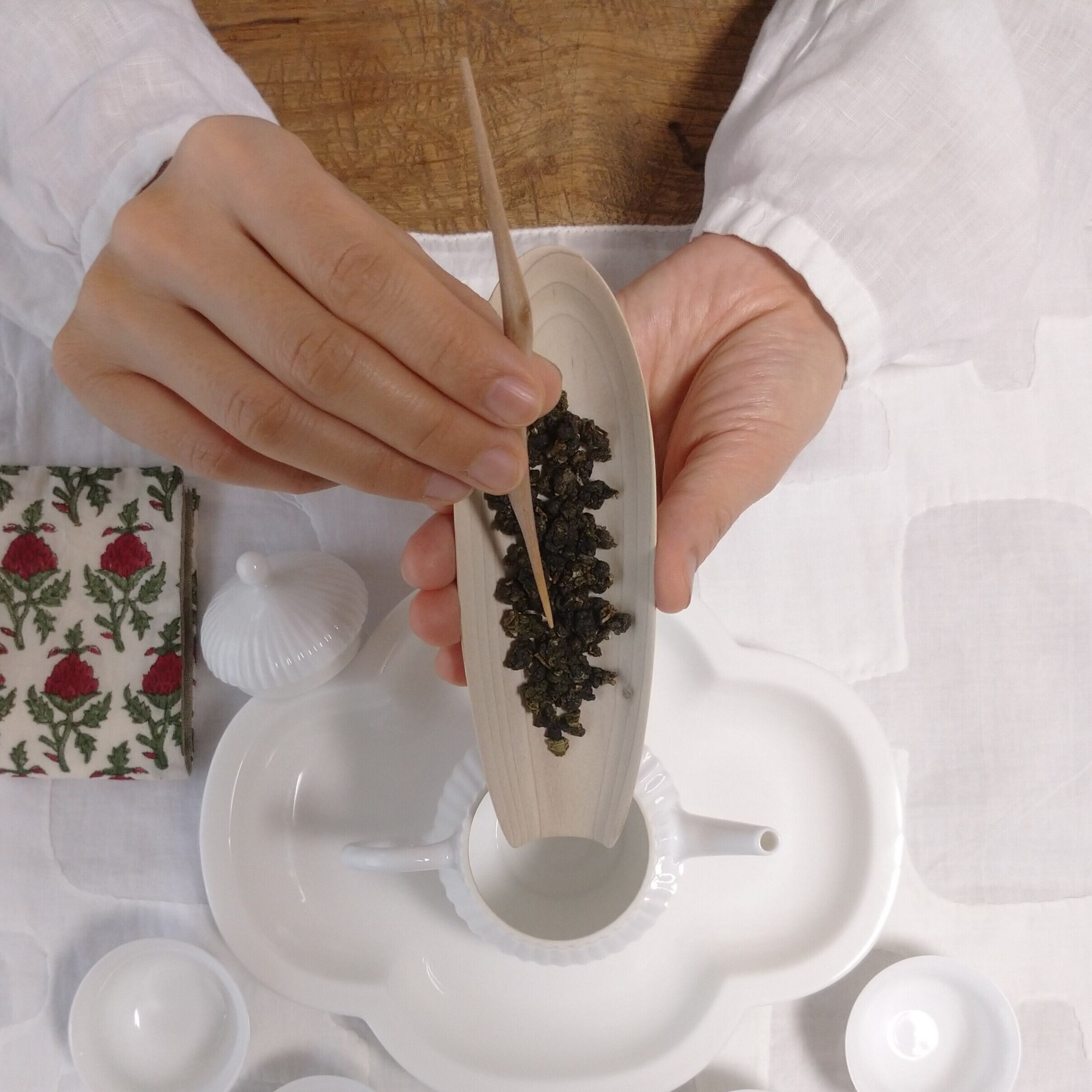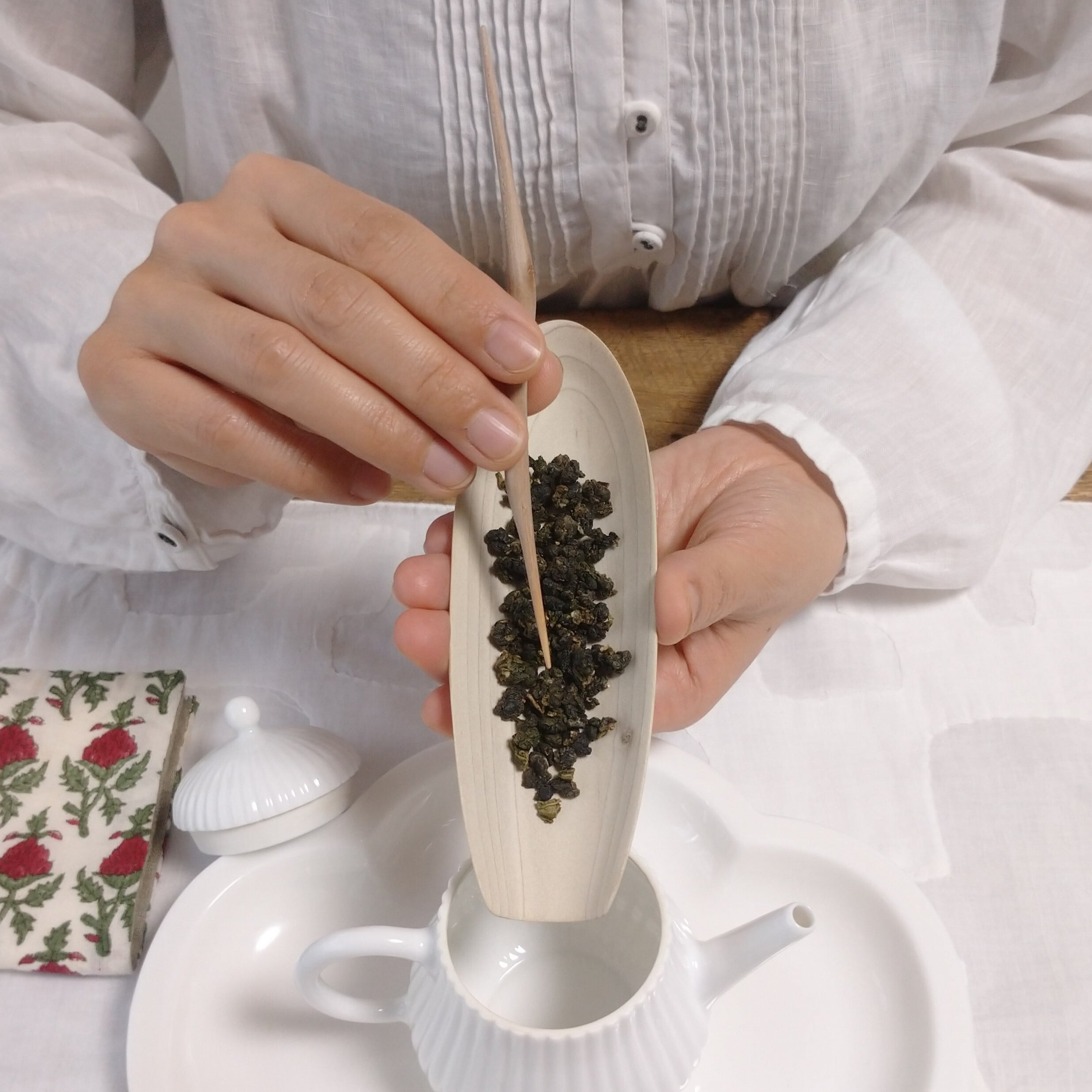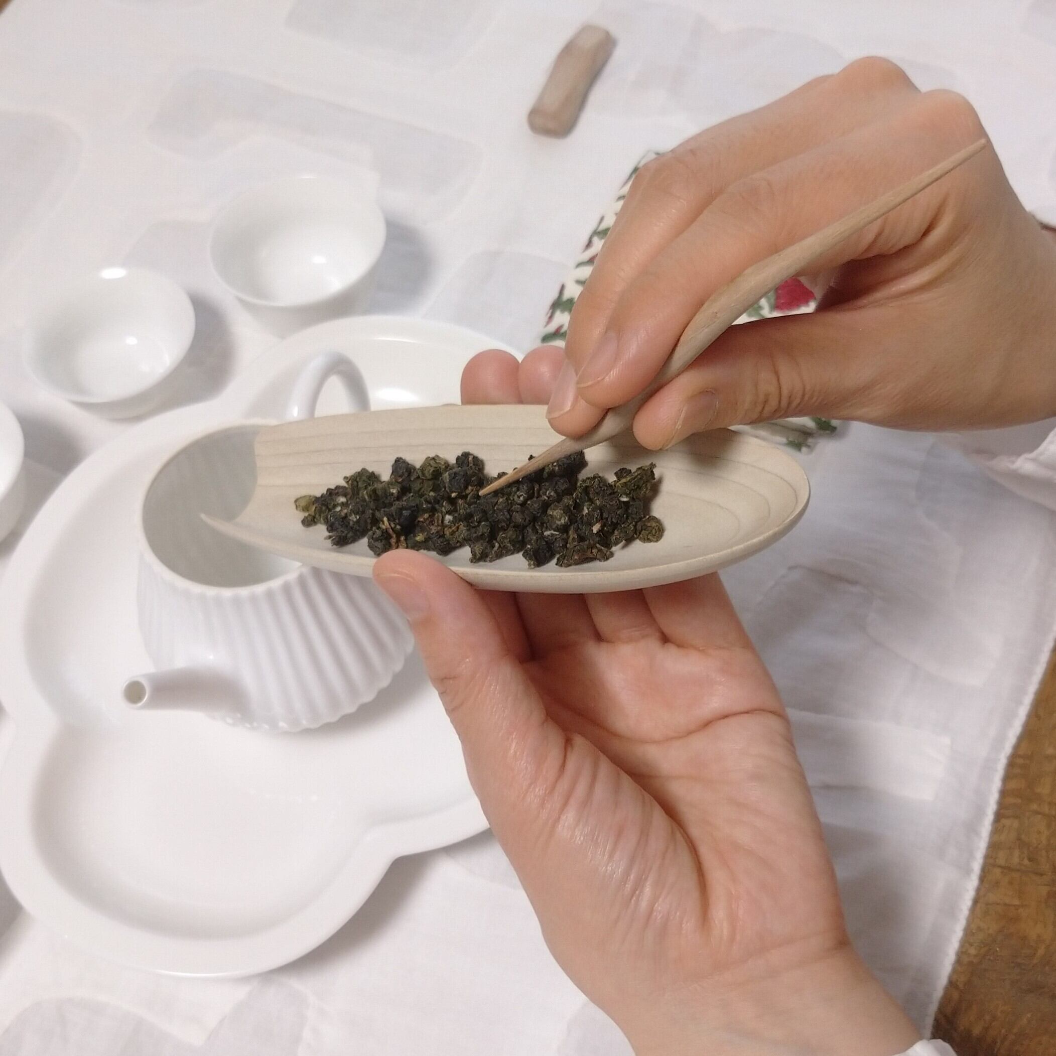茶通(ちゃどおし)は、茶壺の注ぎ口が詰まった時に使う道具とされていますが、他にも、茶則を使って茶壺に茶葉を入れる際に添えたり、一煎淹れた後に茶壺の中で偏った茶葉を馴らしたりすることができます。