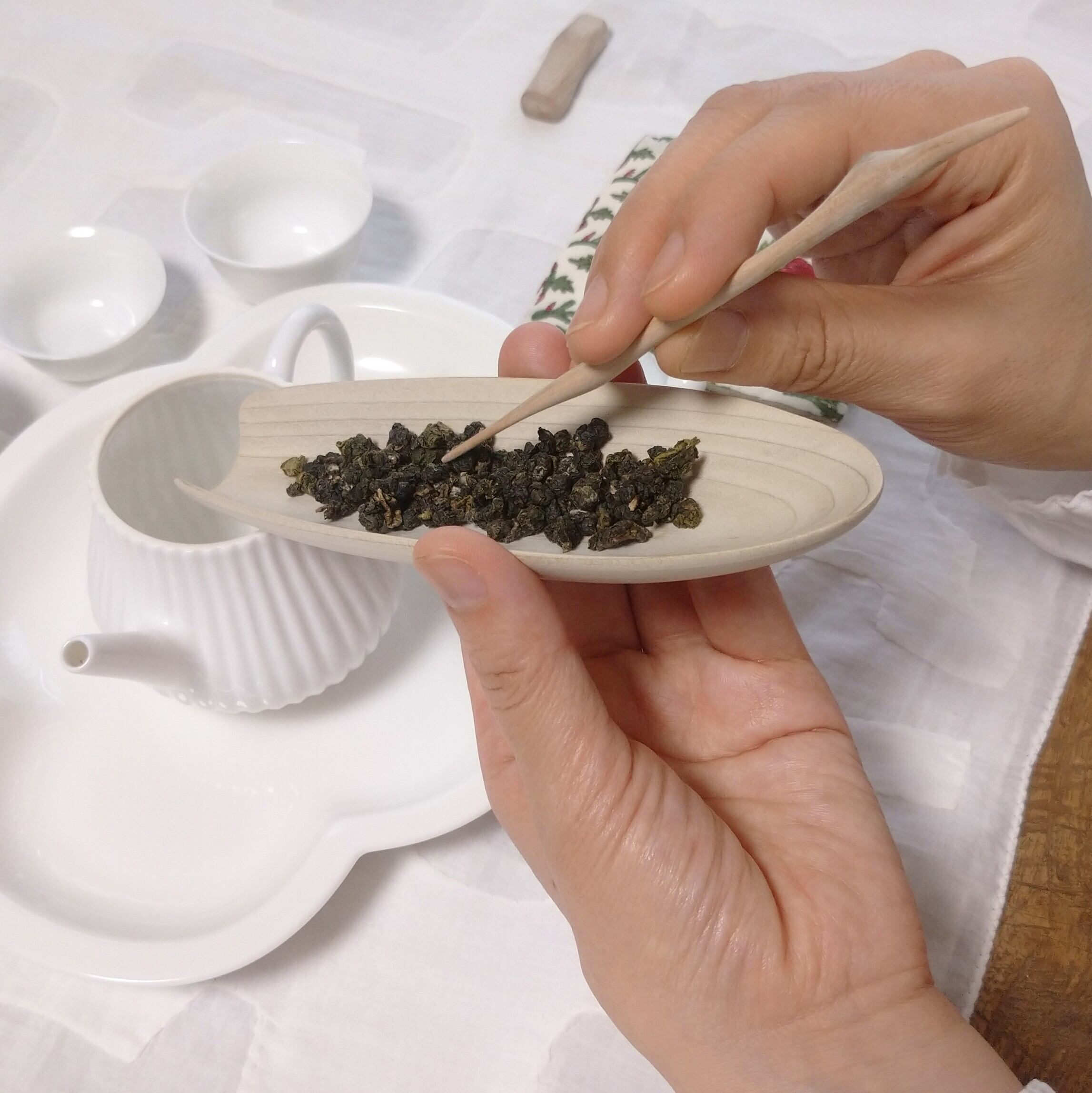 茶通は、茶壺の注ぎ口が詰まった時に使う道具とされていますが、他にも、茶則を使って茶壺に茶葉を入れる際に添えたり、一煎淹れた後に茶壺の中で偏った茶葉を馴らしたりすることができます。