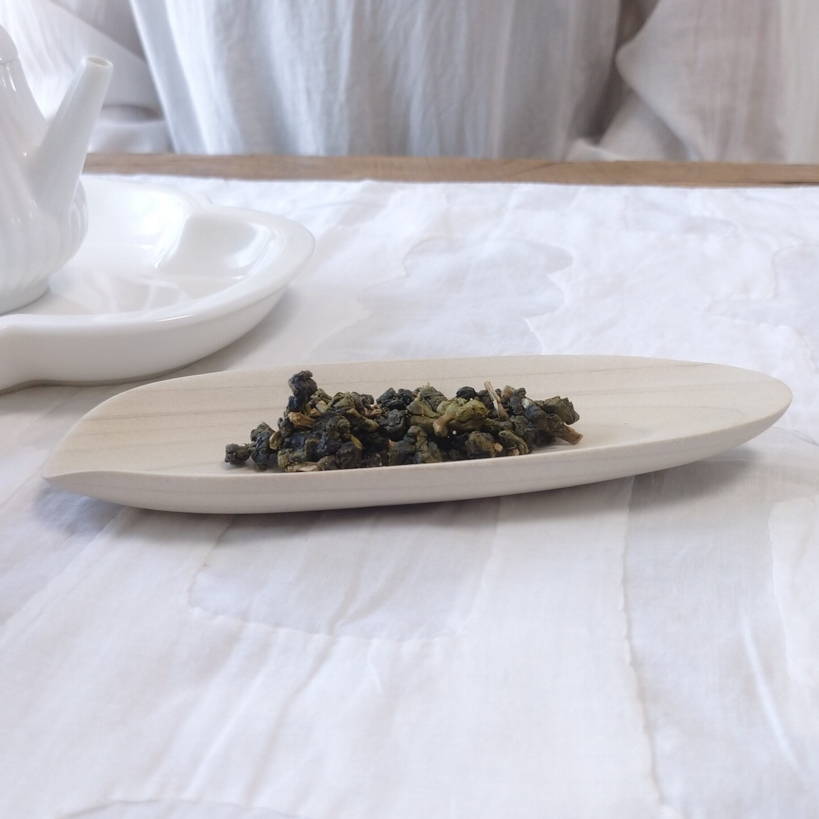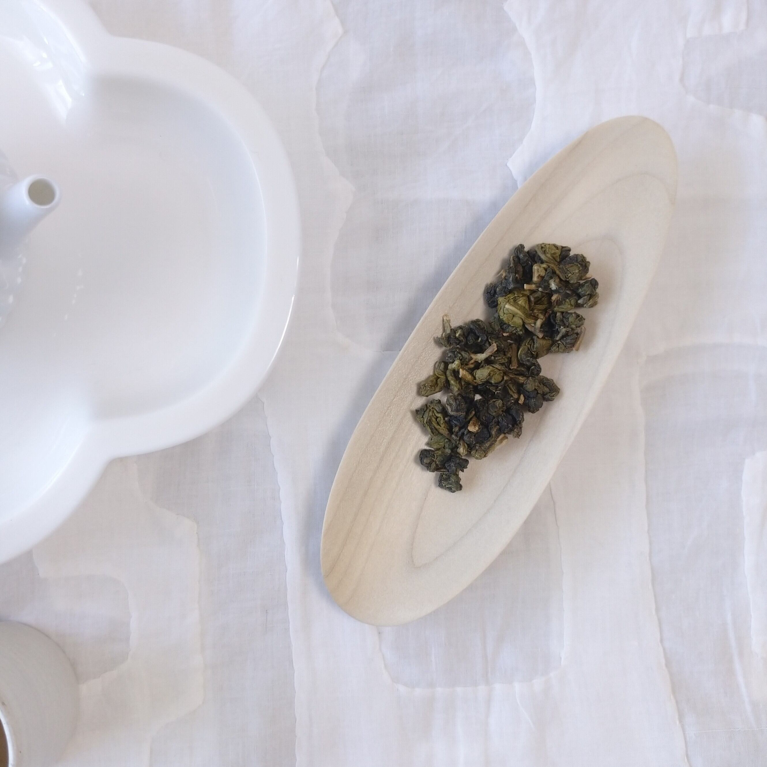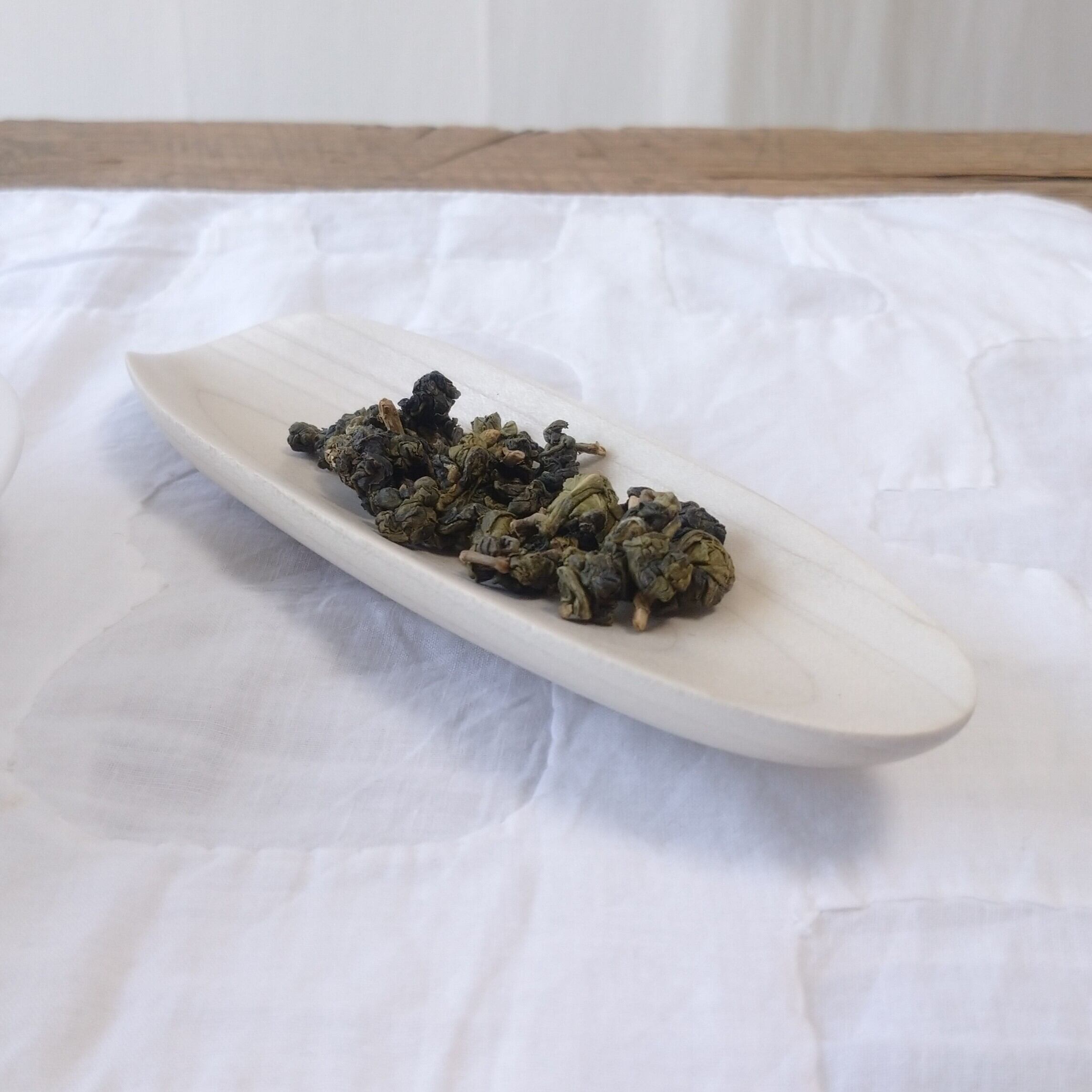 浅めの茶則なので、小さめ~中程度の茶葉を載せるのに向いています。(写真はそれぞれ、梨山烏龍を5g、鳳凰単叢を3g載せています。)