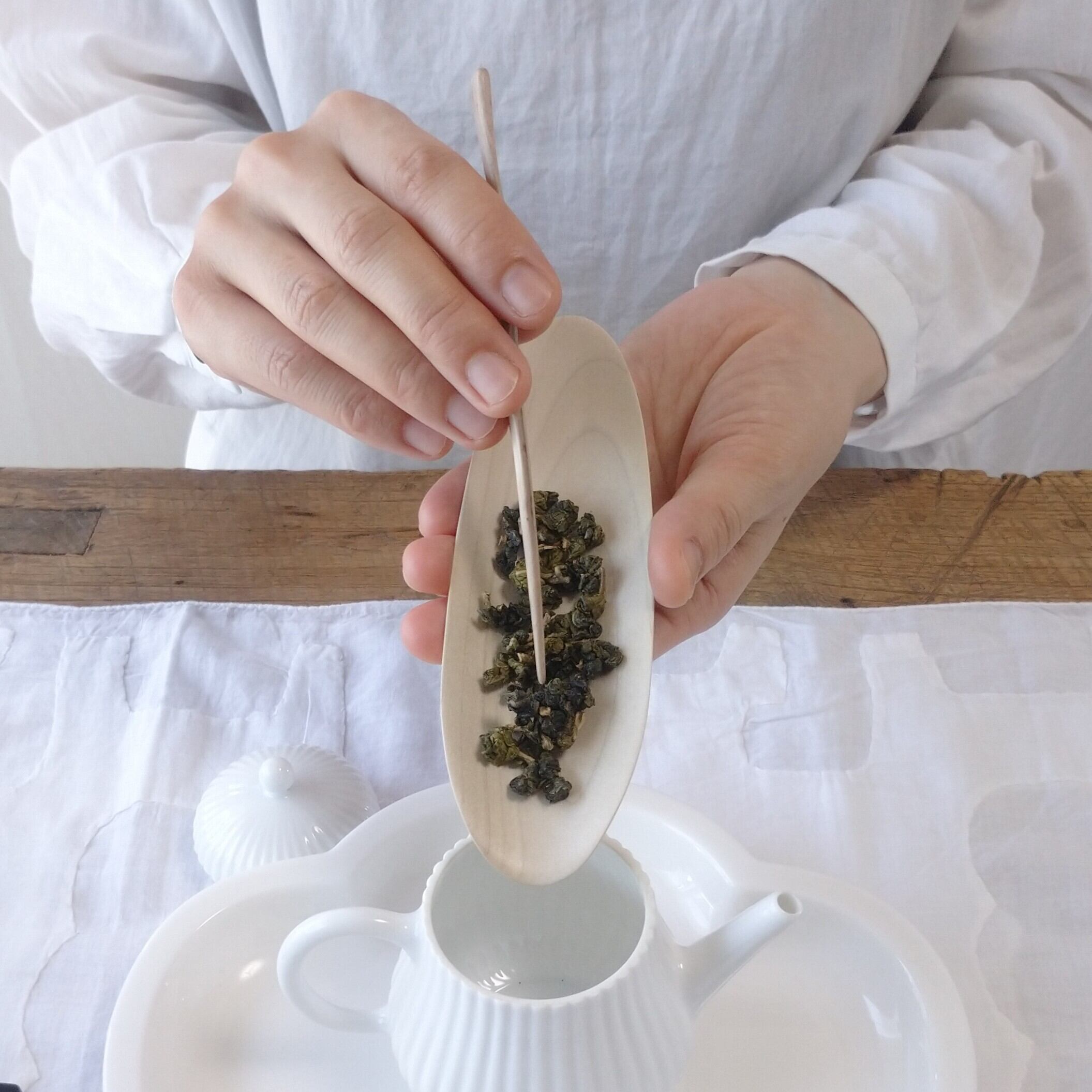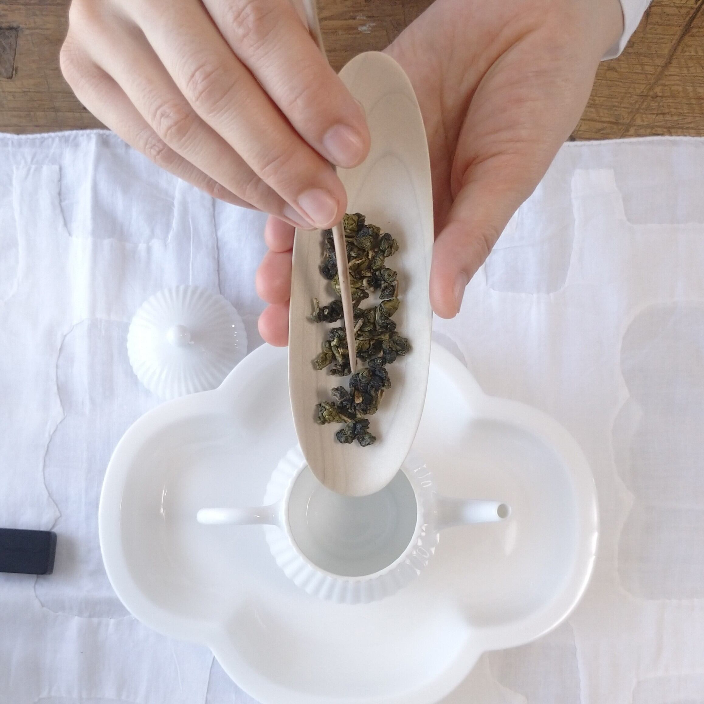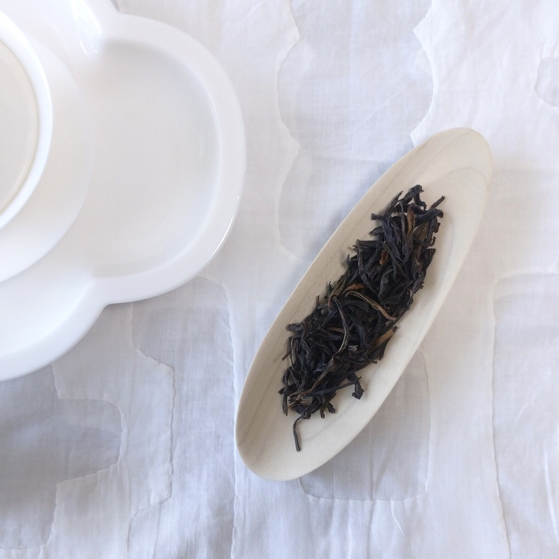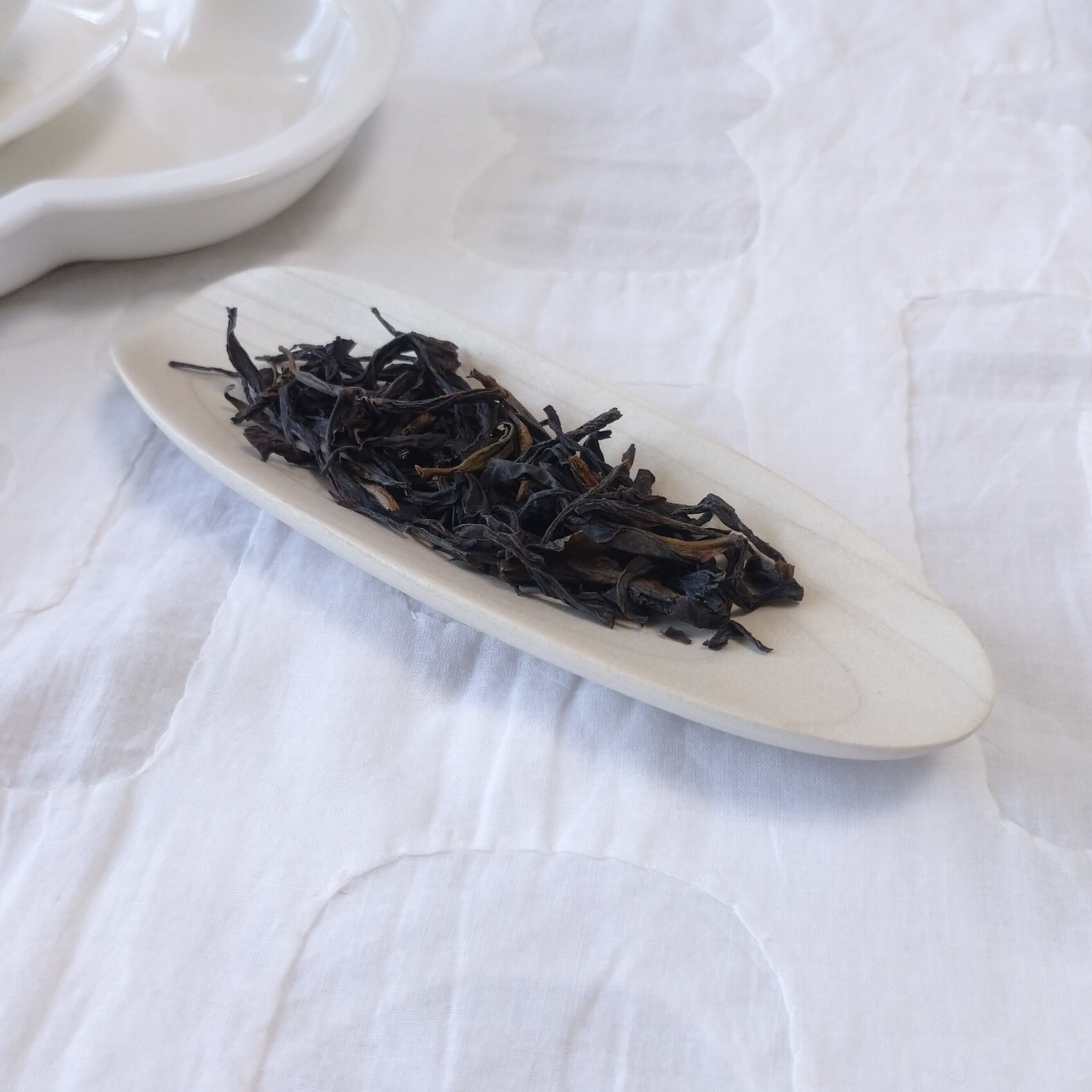 浅めの茶則なので、小さめ~中程度の茶葉を載せるのに向いています。(写真はそれぞれ、梨山烏龍を5g、鳳凰単叢を3g載せています。)
