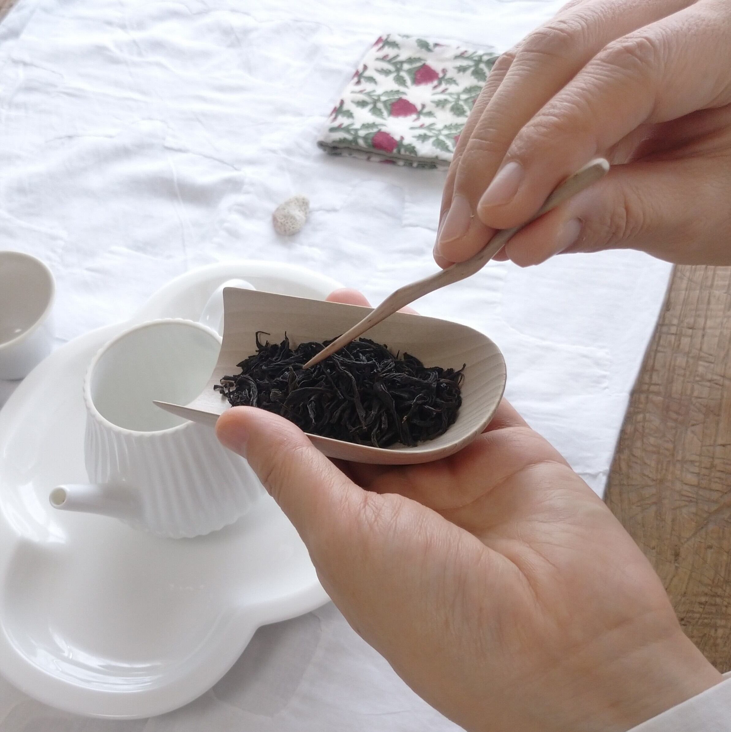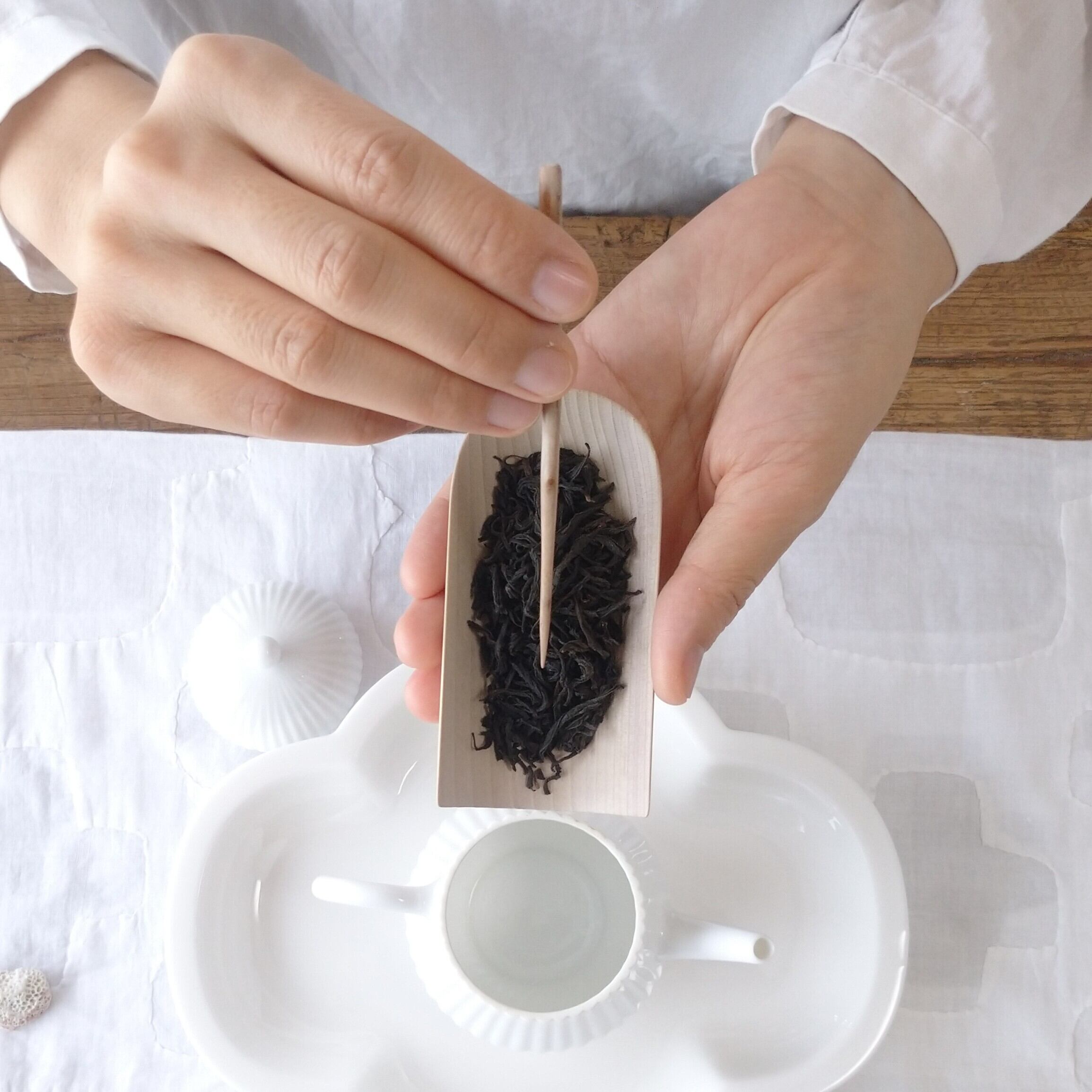 茶通(ちゃどおし)は、茶壺の注ぎ口が詰まった時に使う道具とされていますが、他にも、茶則を使って茶壺に茶葉を入れる際に添えたり、一煎淹れた後に茶壺の中で偏った茶葉を馴らしたりすることができます。
