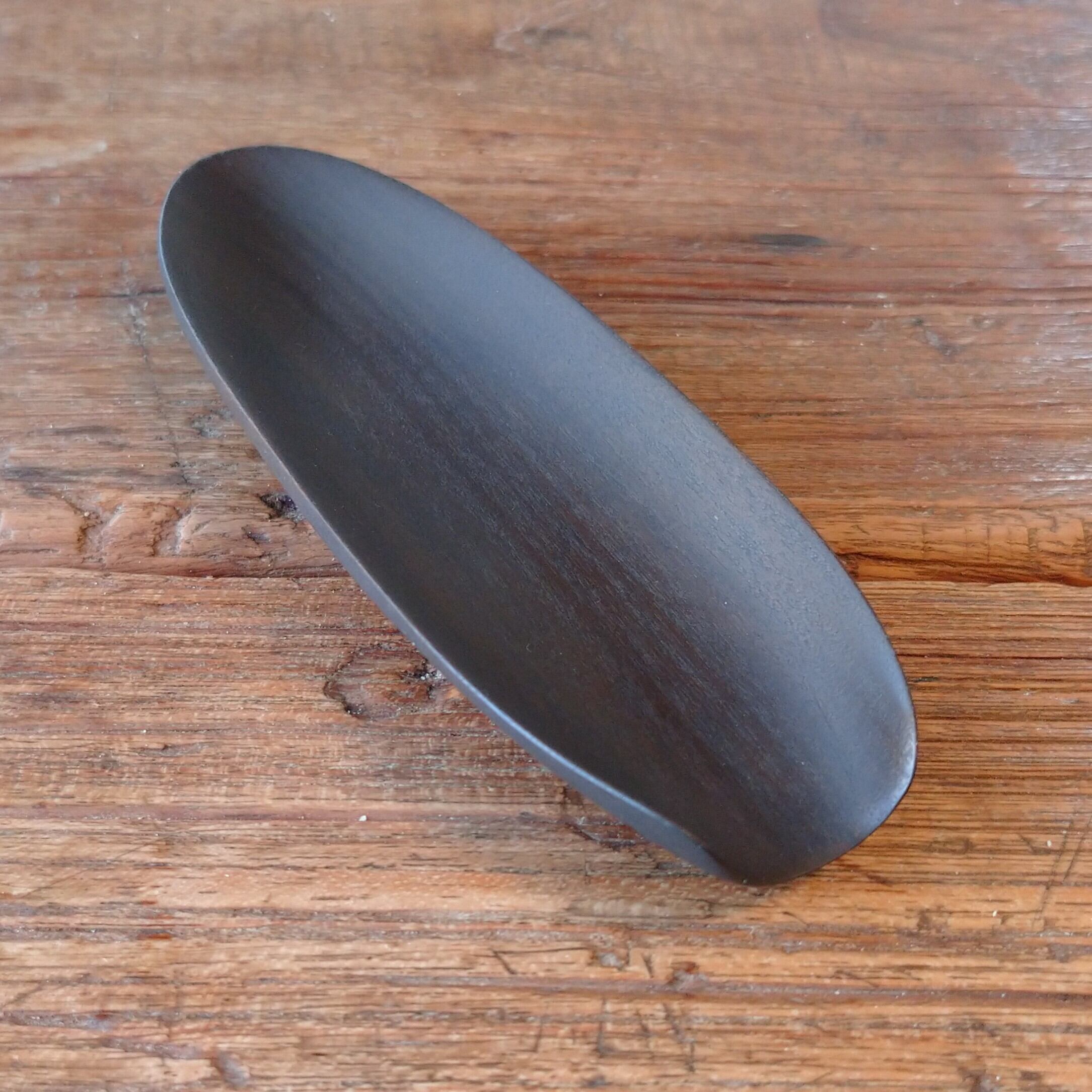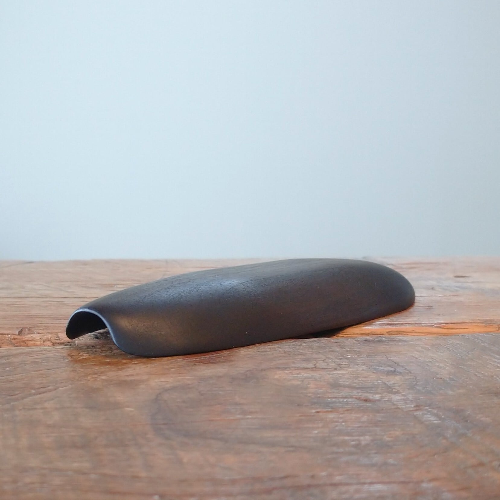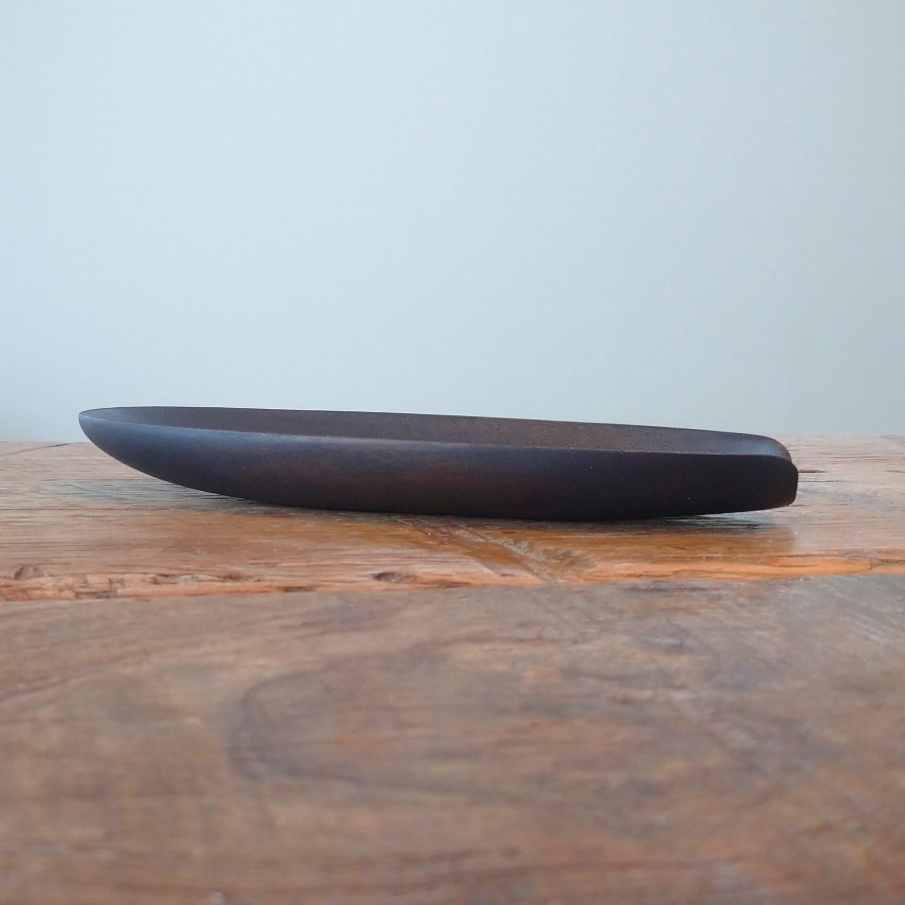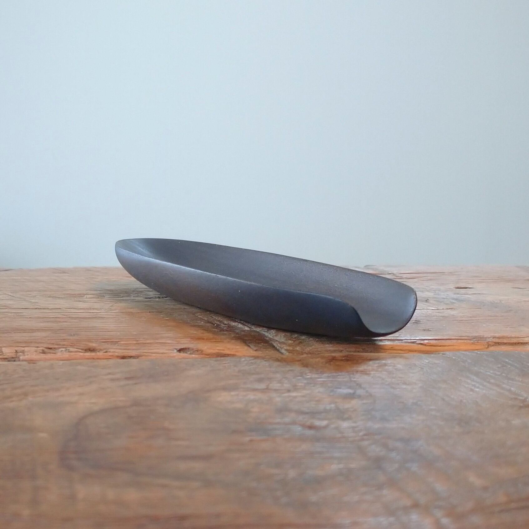 ノミ、鉋、彫刻刀などを使って削り出しあとサンディングし、鉄媒染で染めました。サンディングと鉄媒染を何回か繰り返し、滑らかに仕上げました。塗装はしていません。