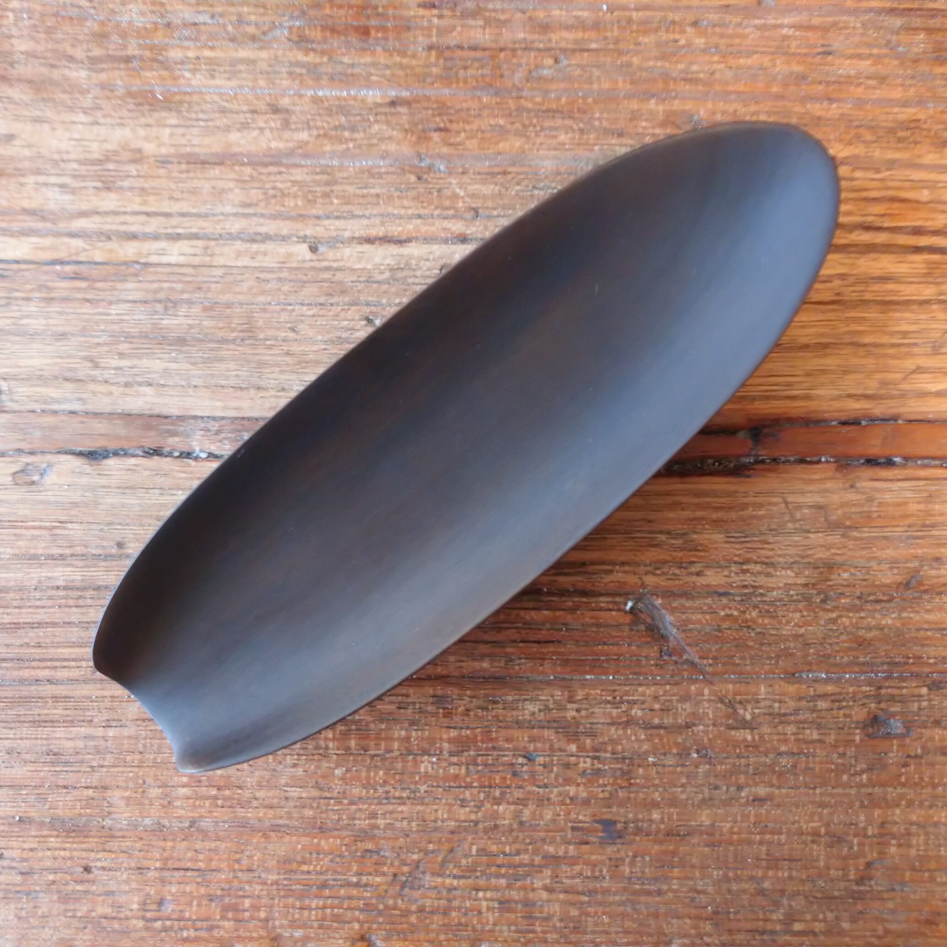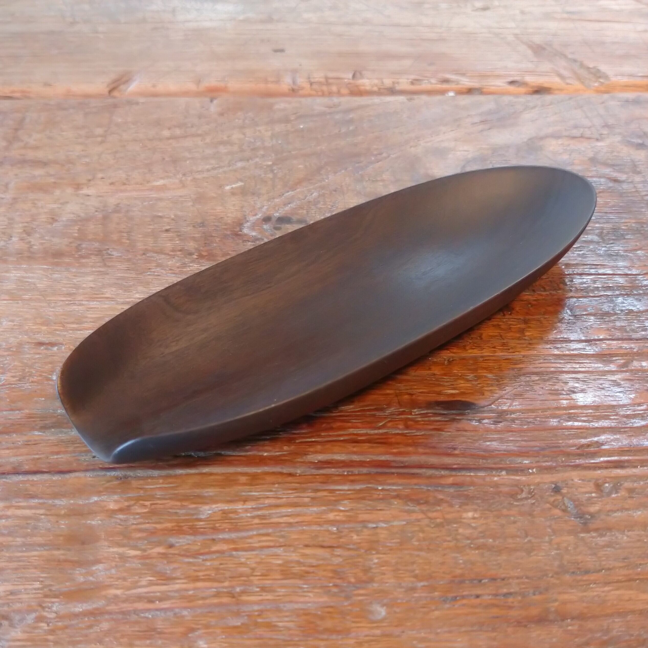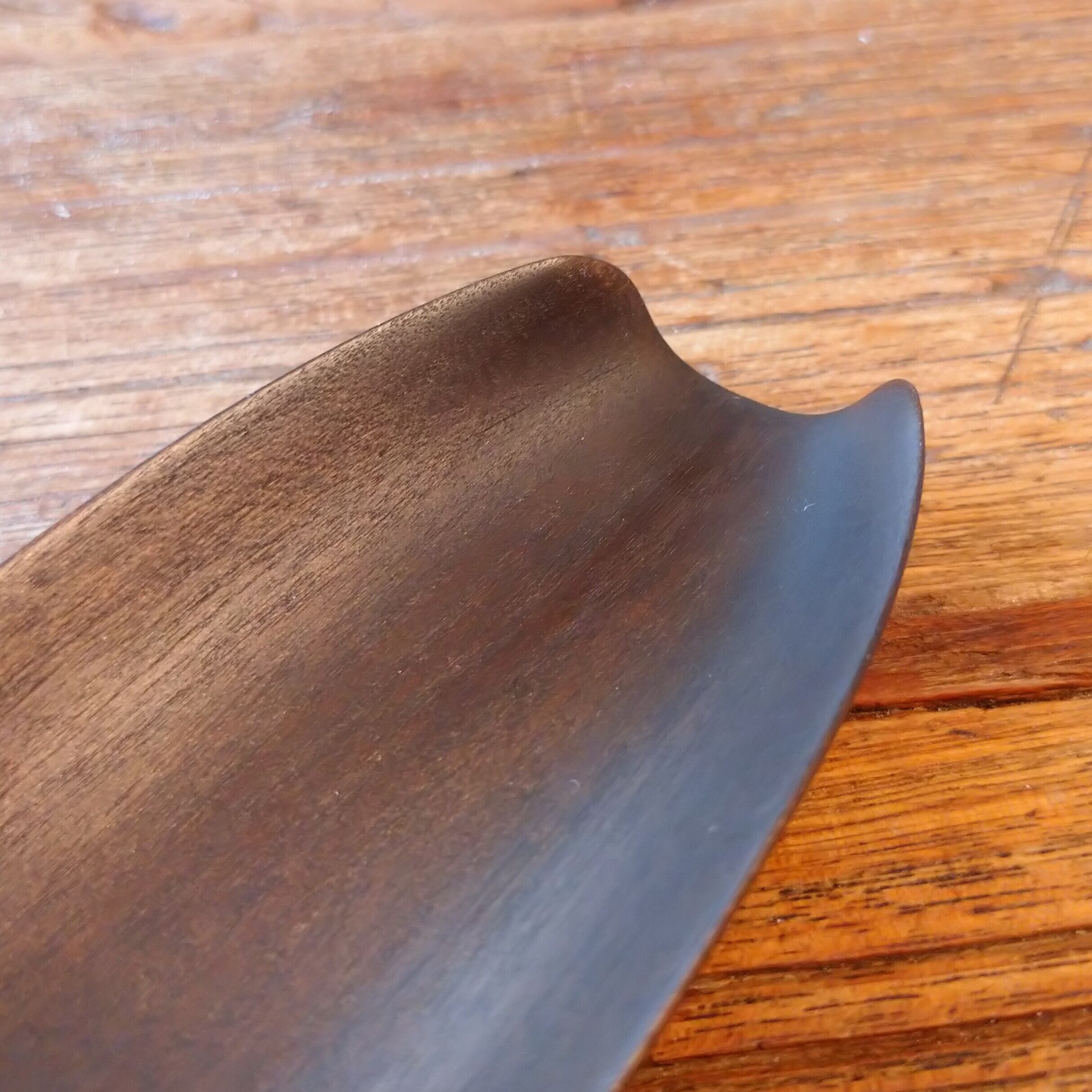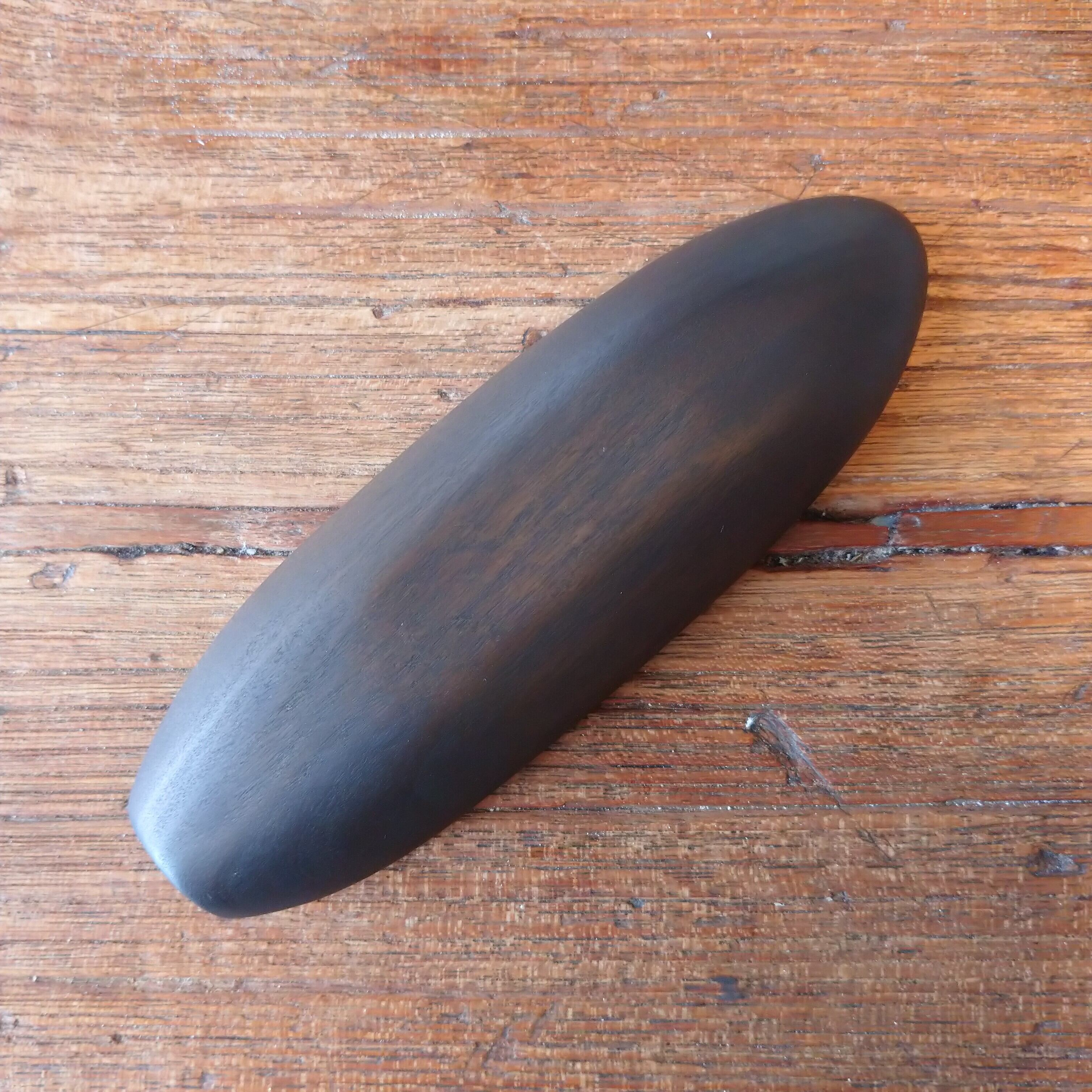 ノミ、鉋、彫刻刀などを使って削り出しあとサンディングし、鉄媒染で染めました。サンディングと鉄媒染を何回か繰り返し、滑らかに仕上げました。塗装はしていません。
