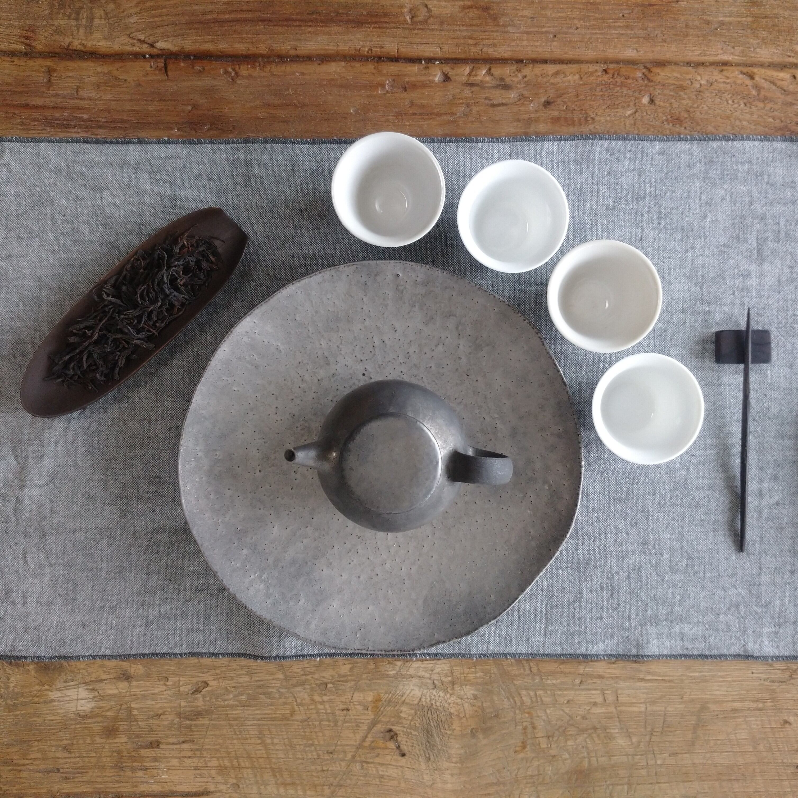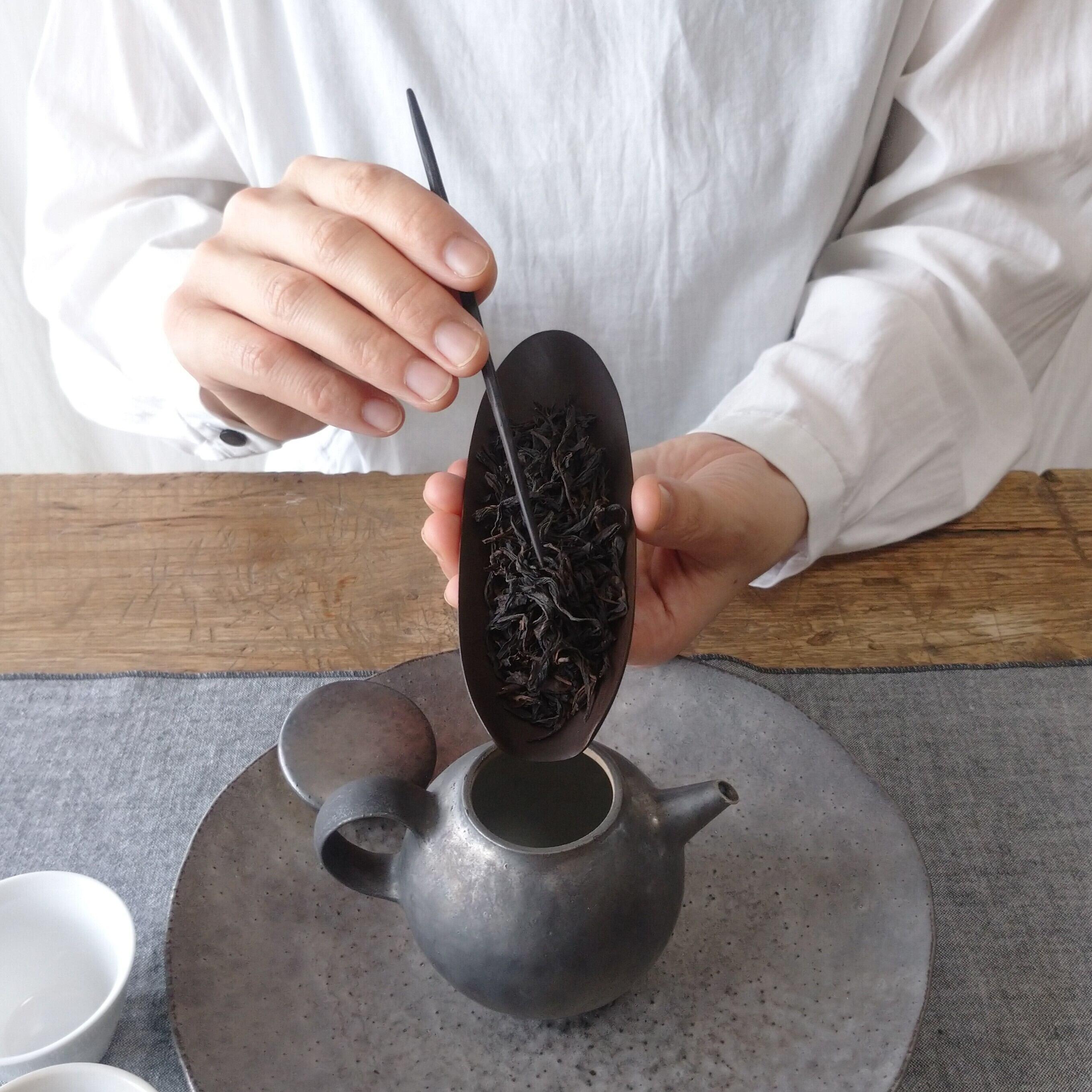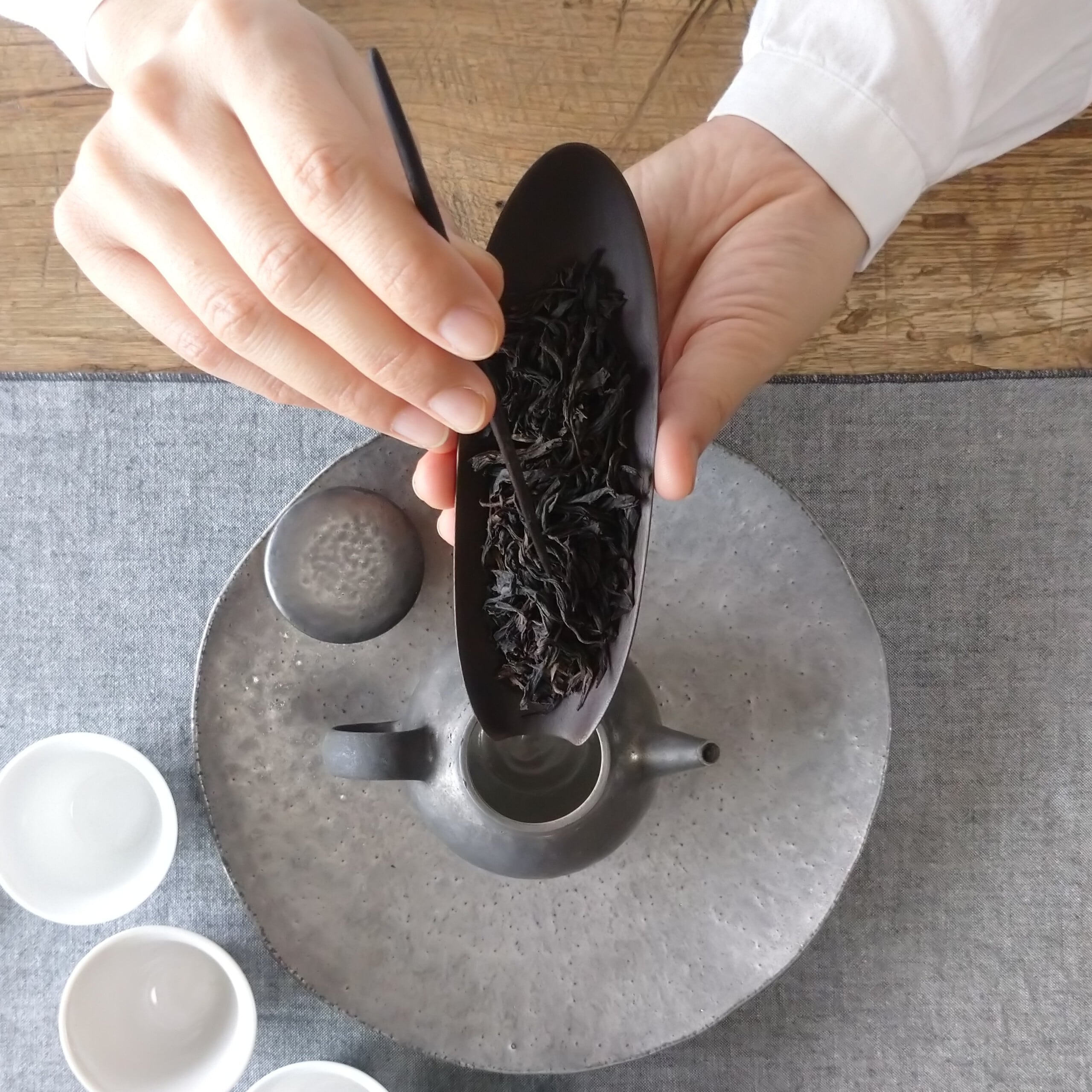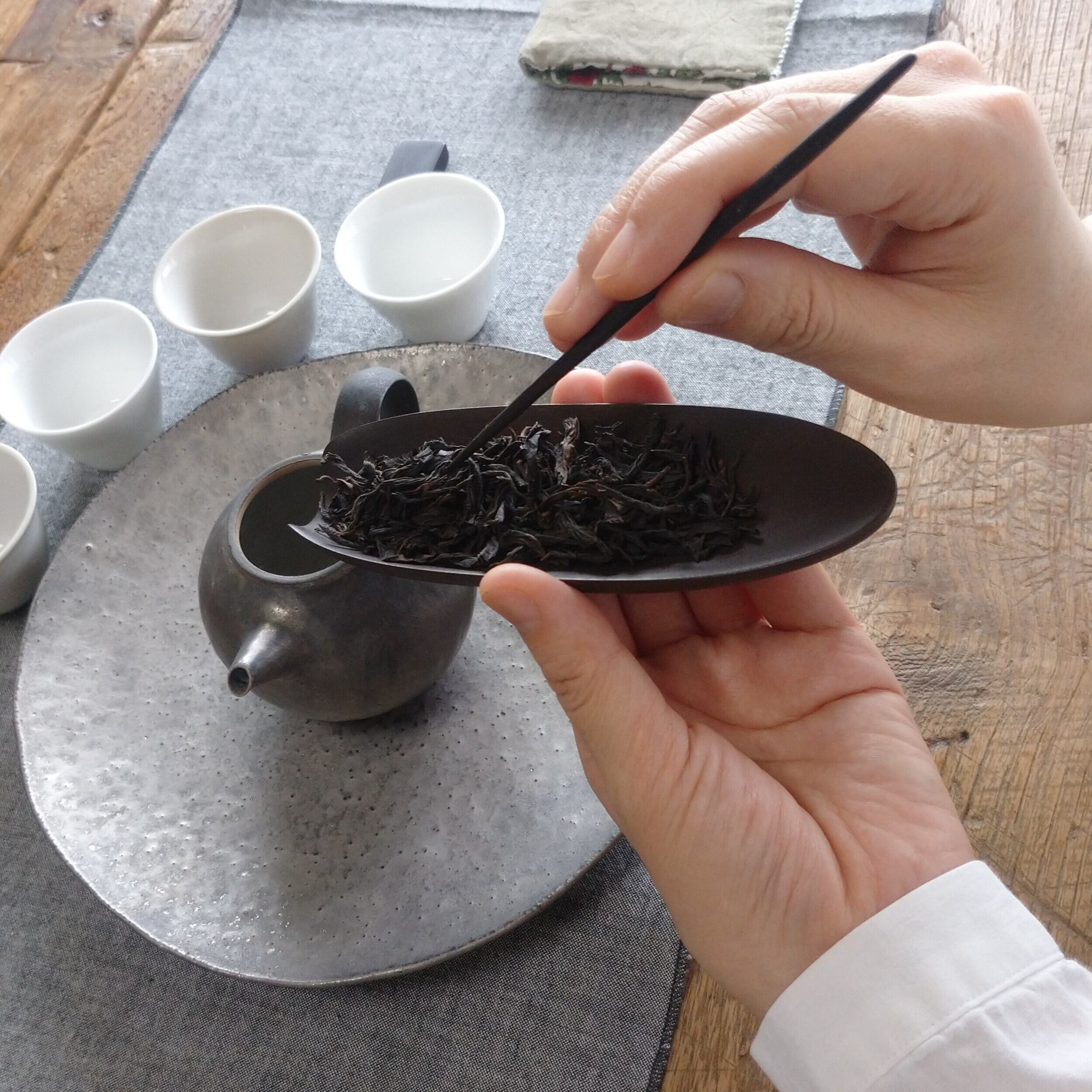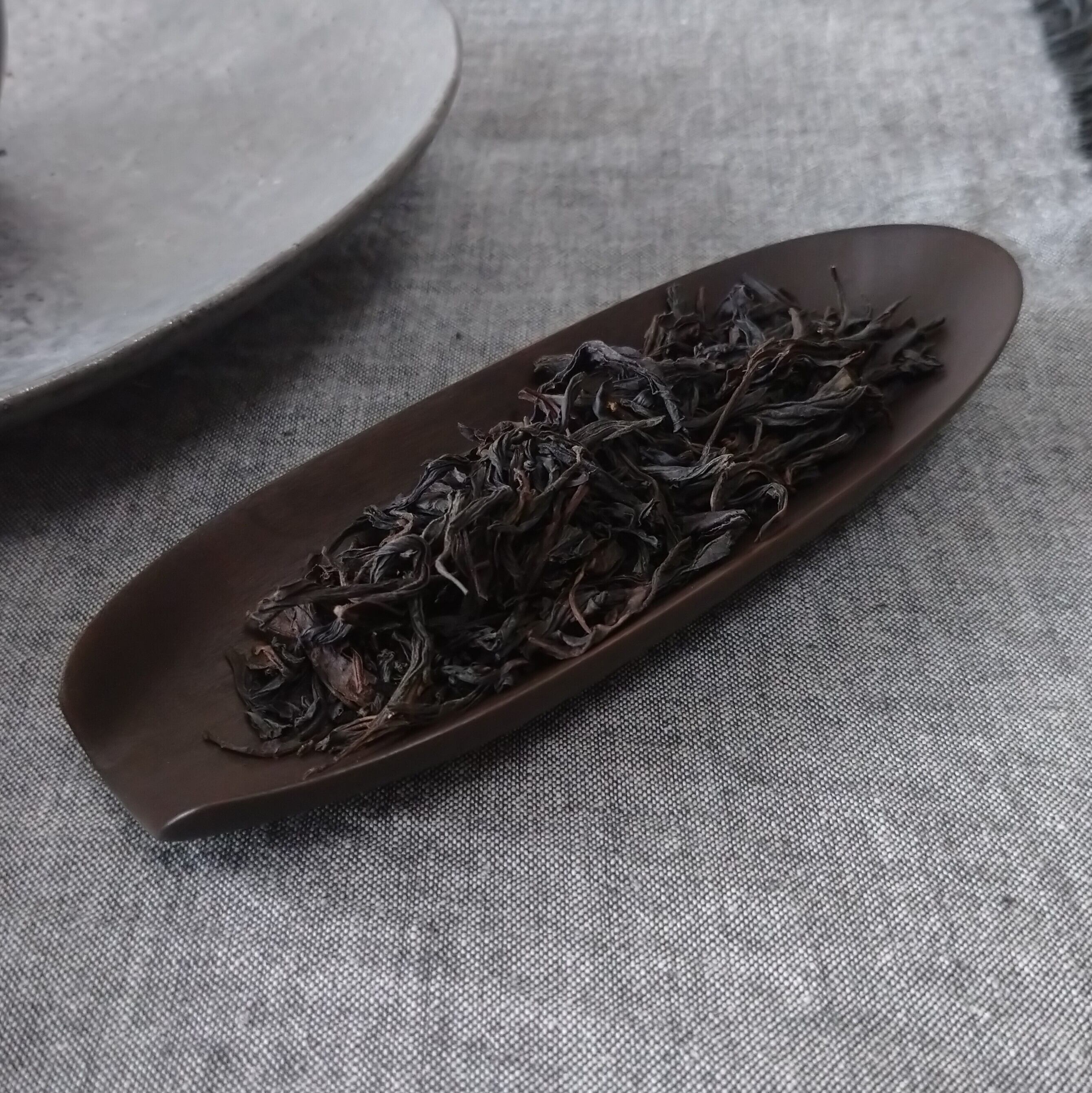 浅めの茶則なので、小さめ~中程度の茶葉を載せるのに向いています。(写真は正山小種を5g載せています。)
