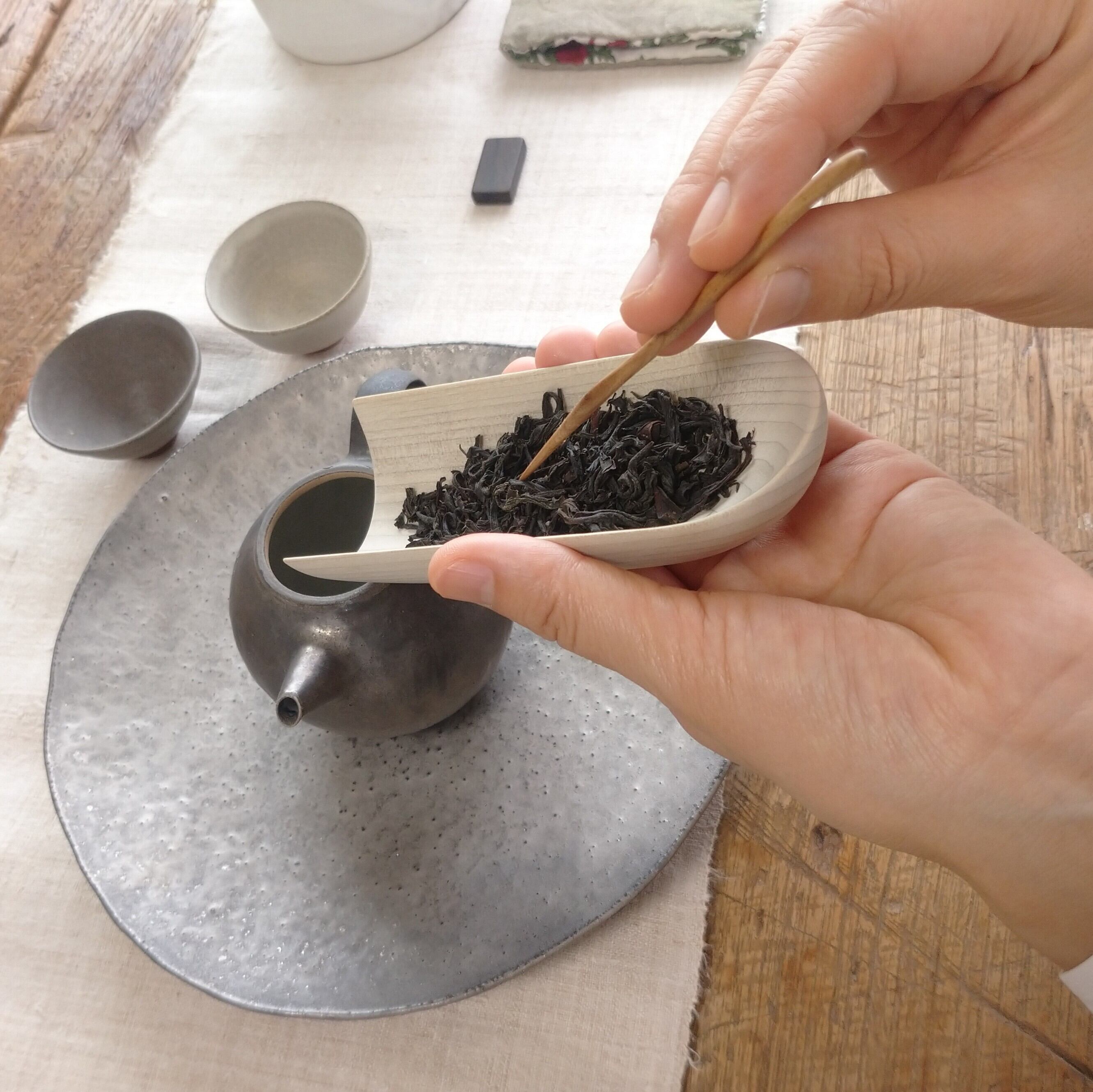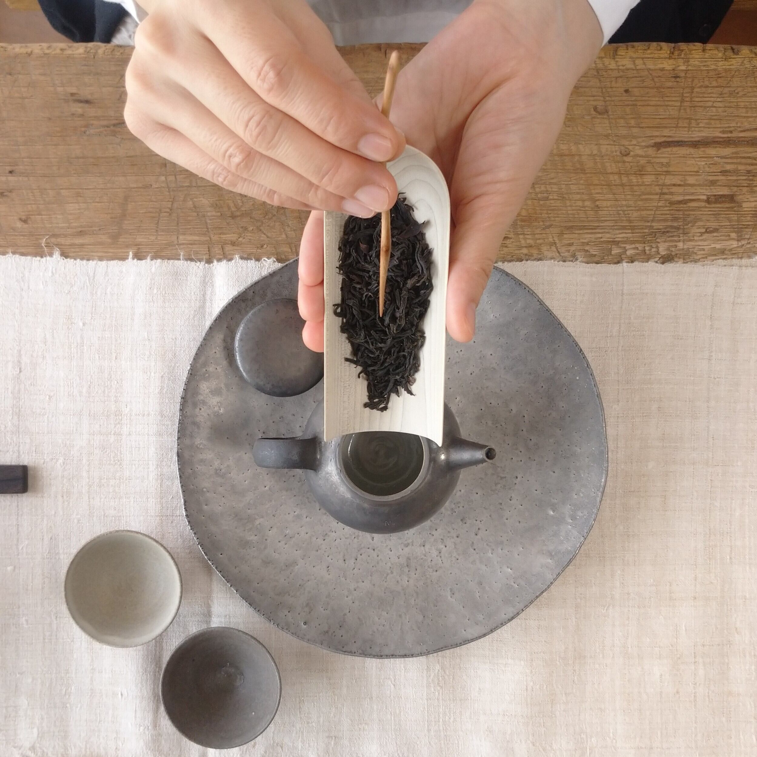 茶通(ちゃどおし)は、茶壺の注ぎ口が詰まった時に使う道具とされていますが、他にも、茶則を使って茶壺に茶葉を入れる際に添えたり、一煎淹れた後に茶壺の中で偏った茶葉を馴らしたりすることができます。