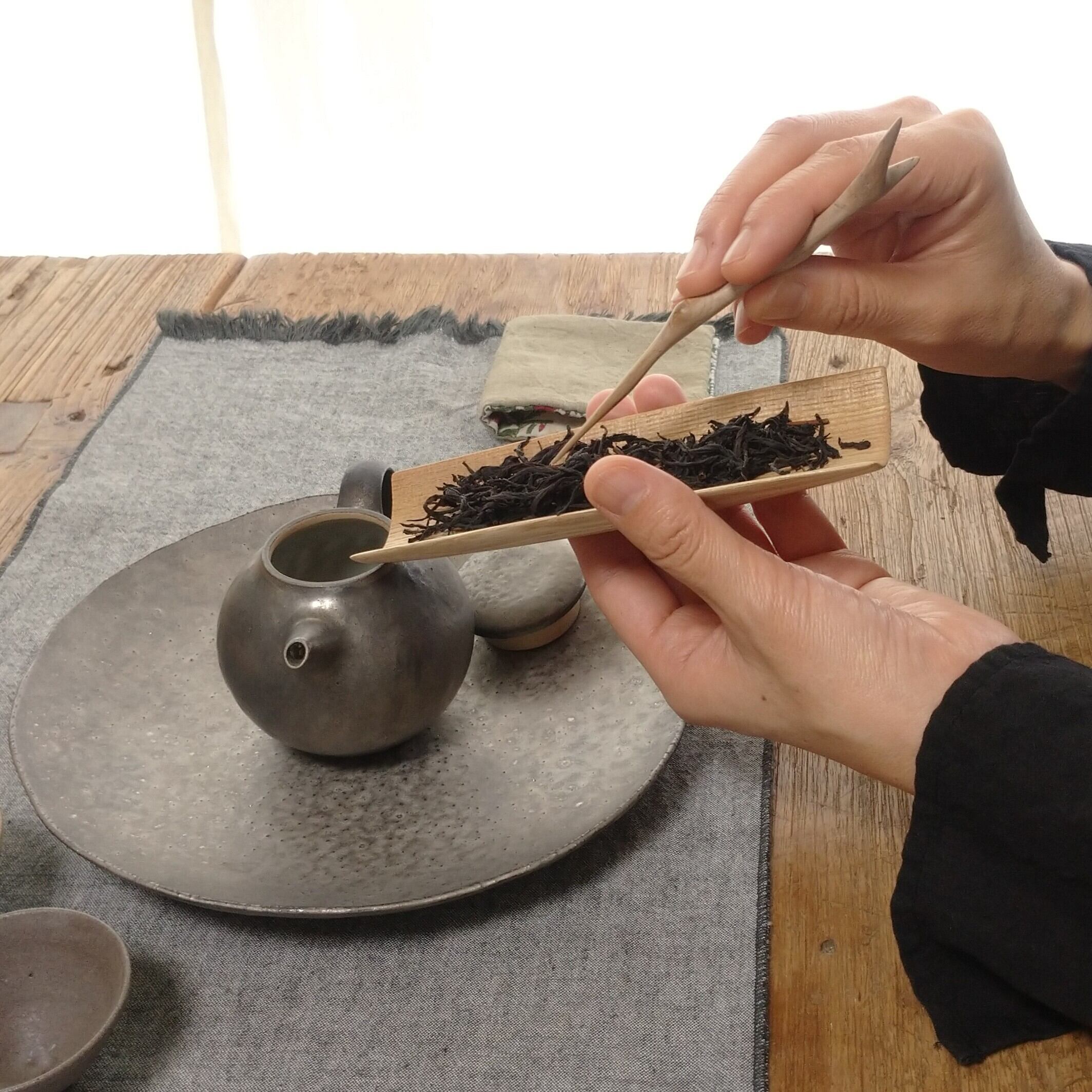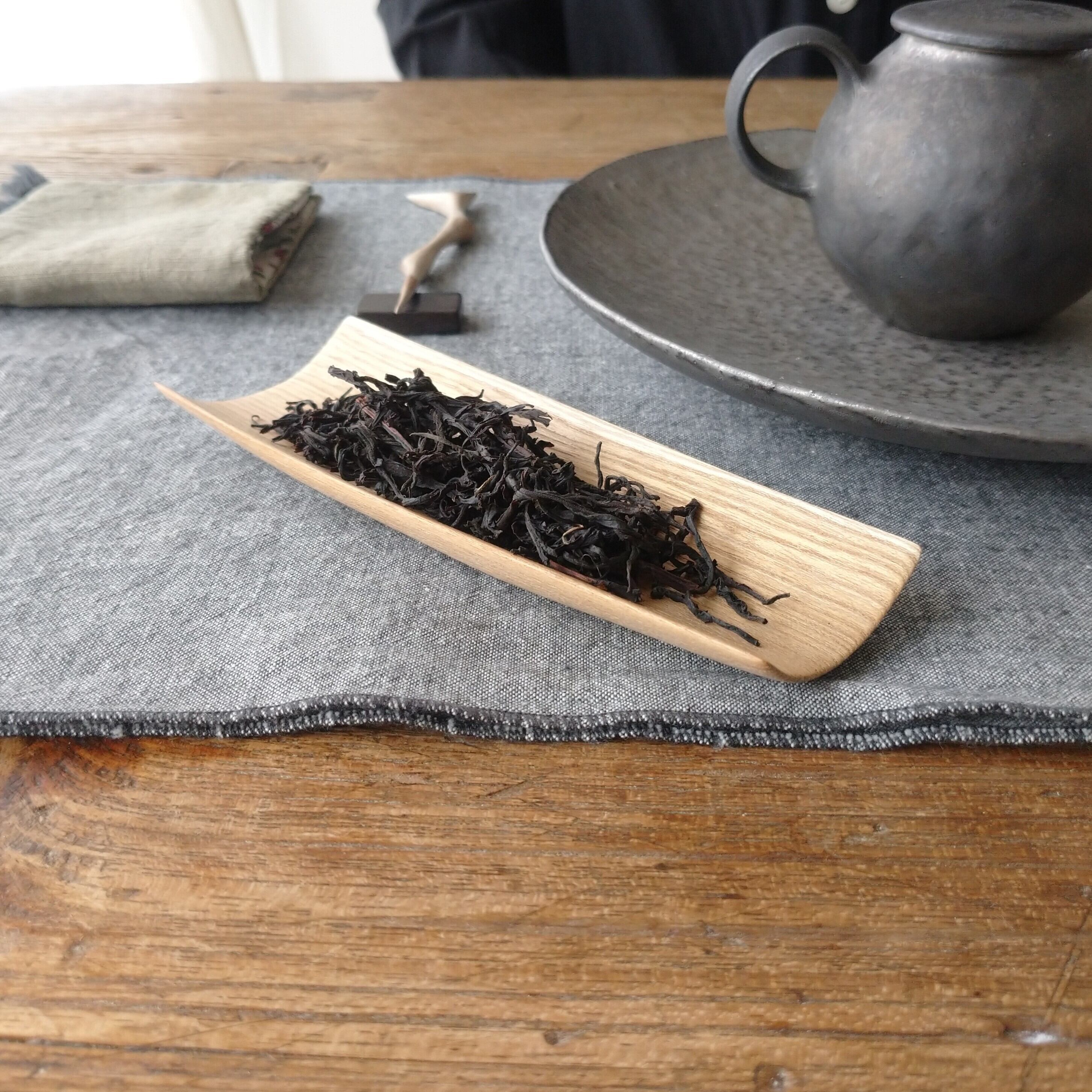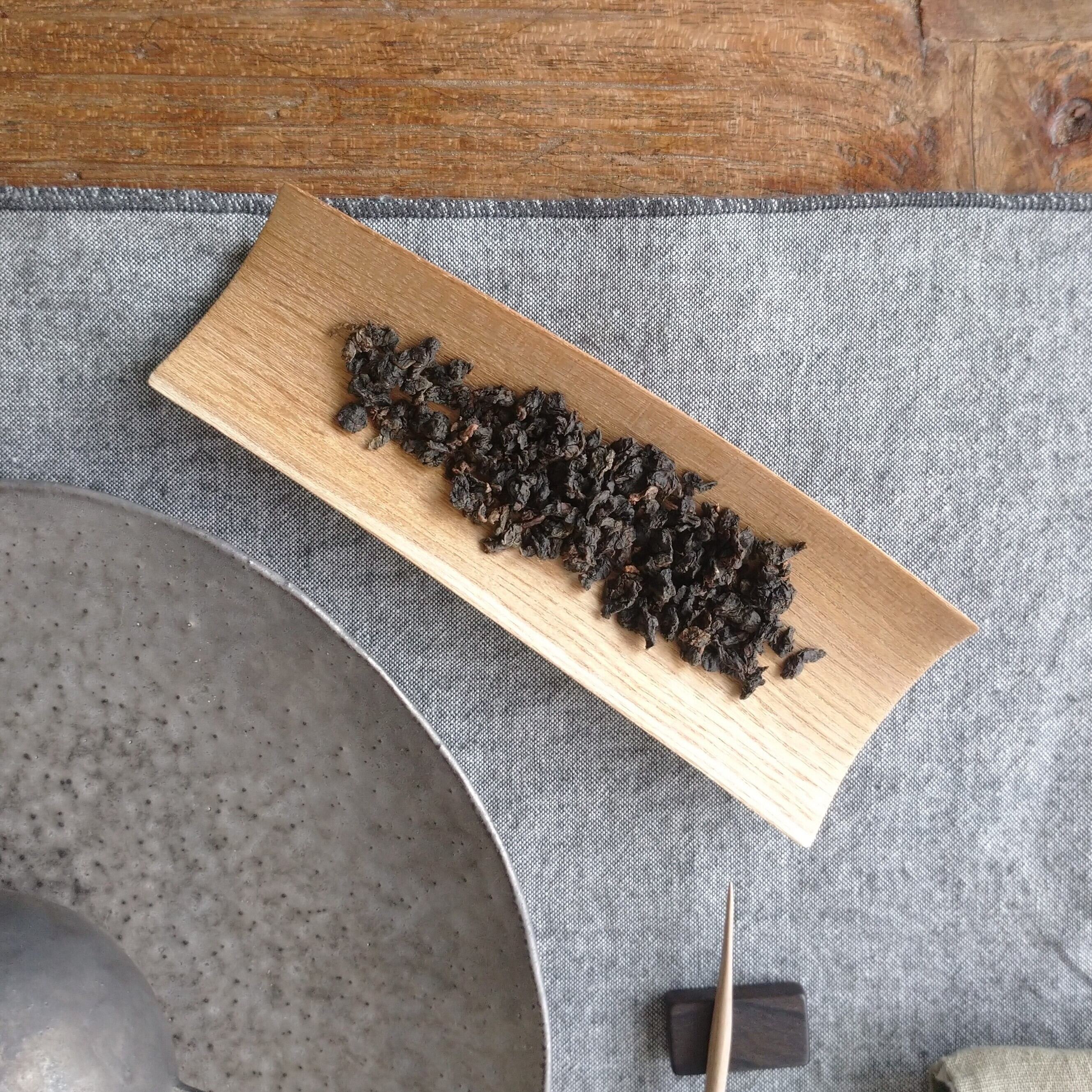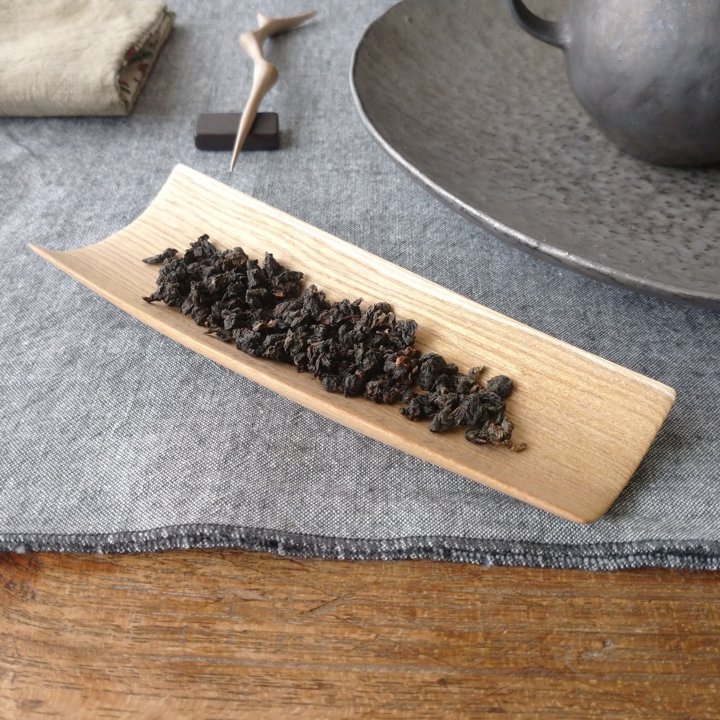 浅めの茶則なので、鉄観音のように丸まった茶葉や、小さめの茶葉を載せるのに向いています。(写真はそれぞれ、紅玉紅茶を5g、白芽奇蘭を5g載せています。)