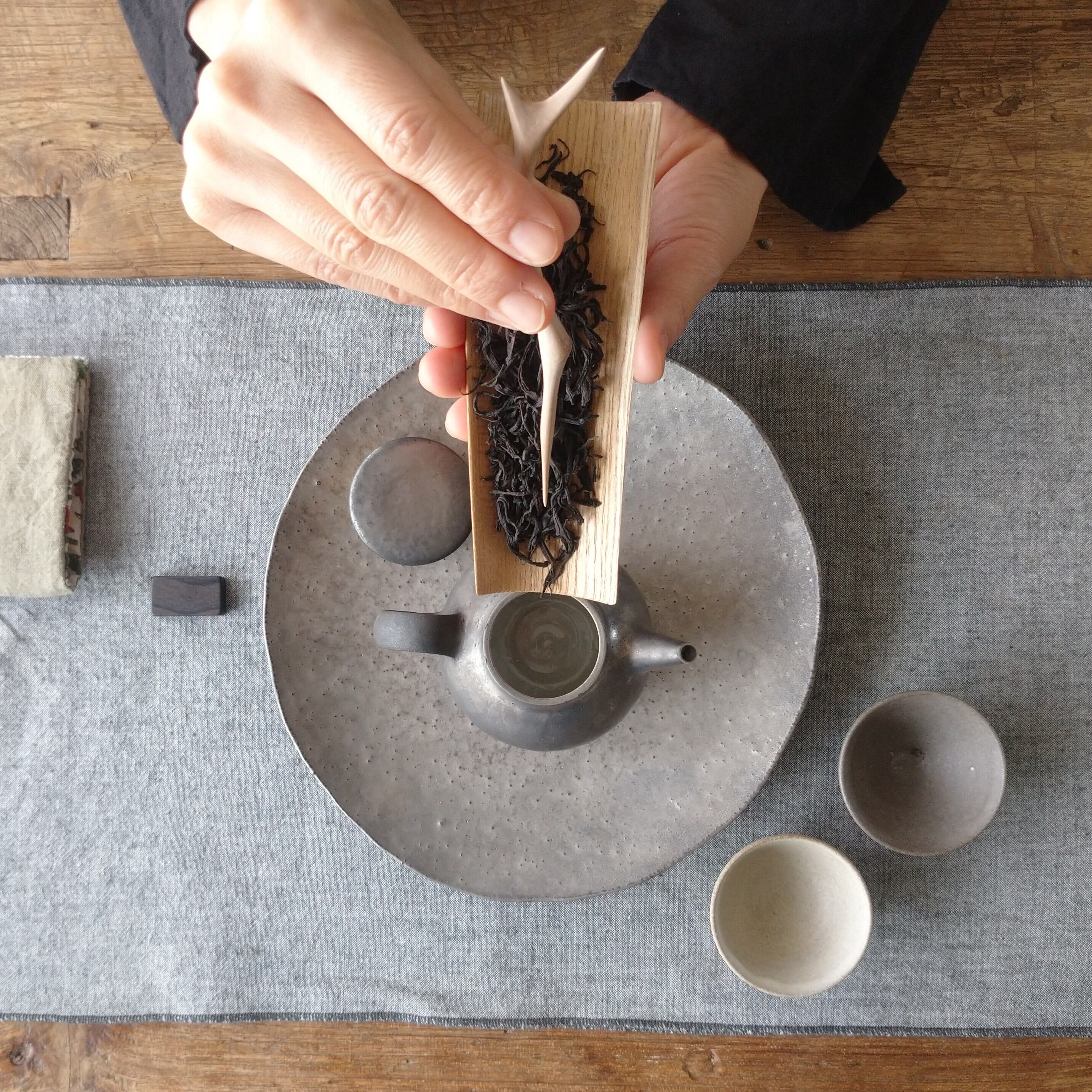 口の小さな茶壺には狭い側から茶葉を移すと入れやすいと思います。