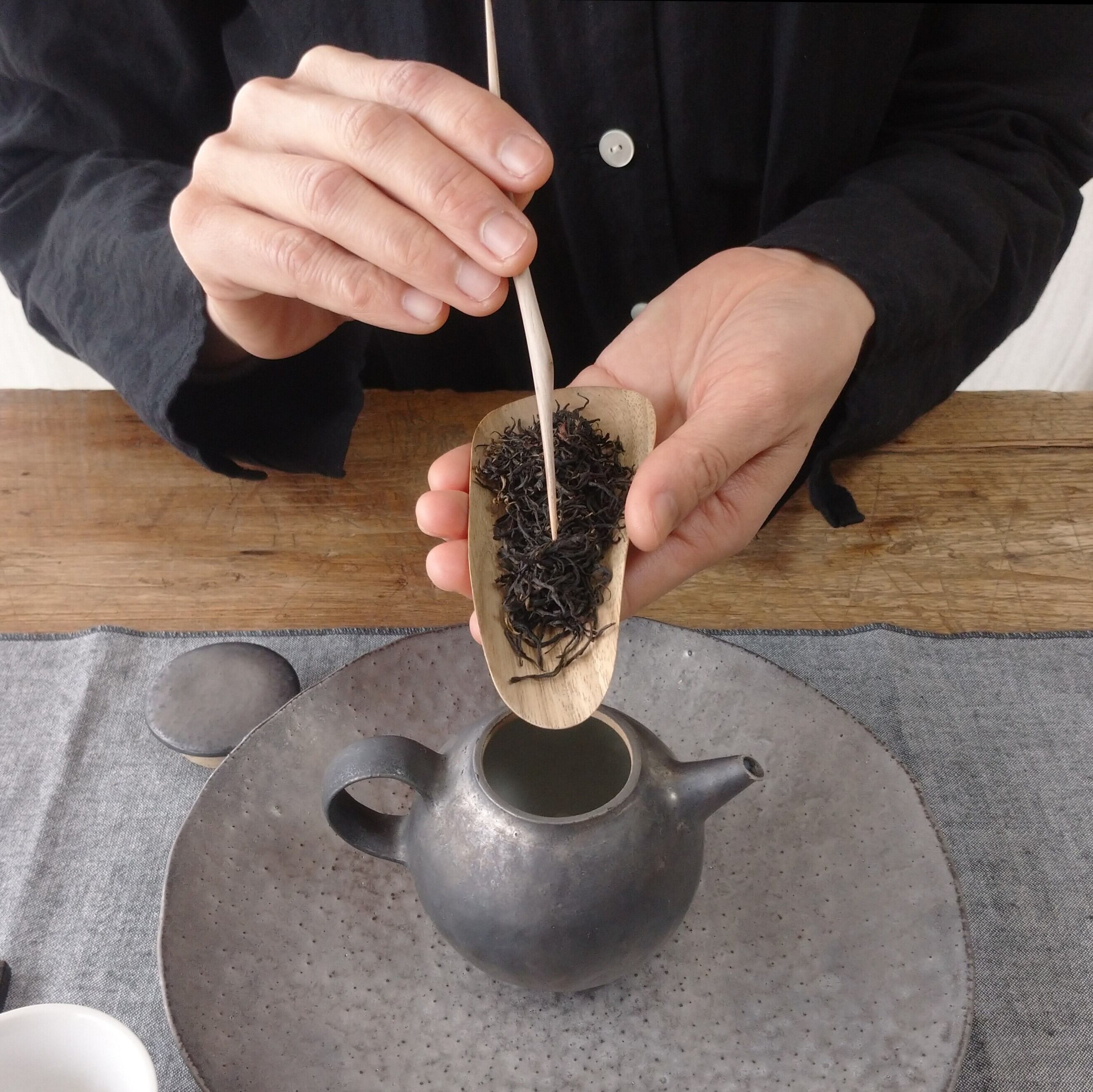 口の小さな茶壺には狭い側から、大きな茶壺や蓋碗には広い側から茶葉を入れると使いやすいと思います。