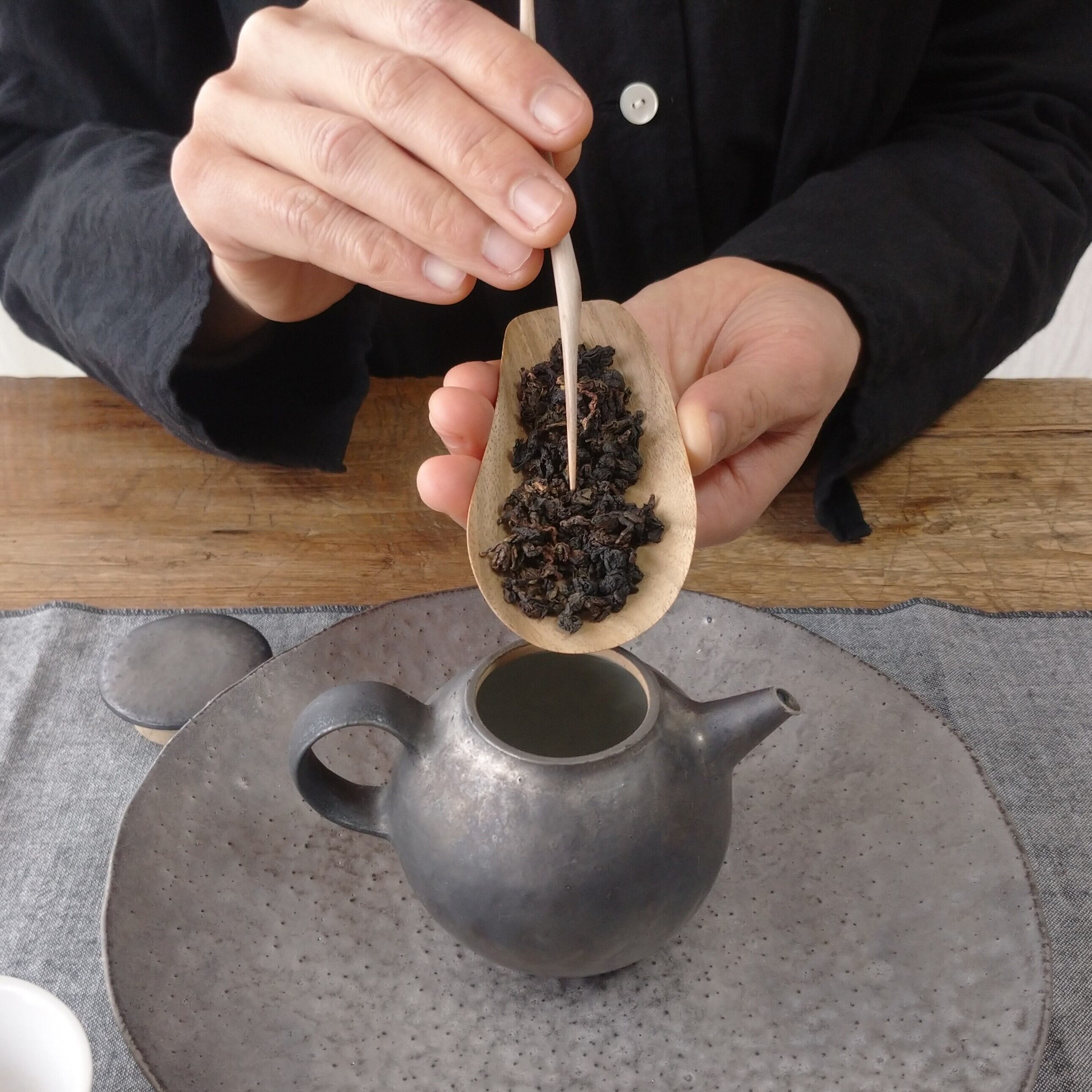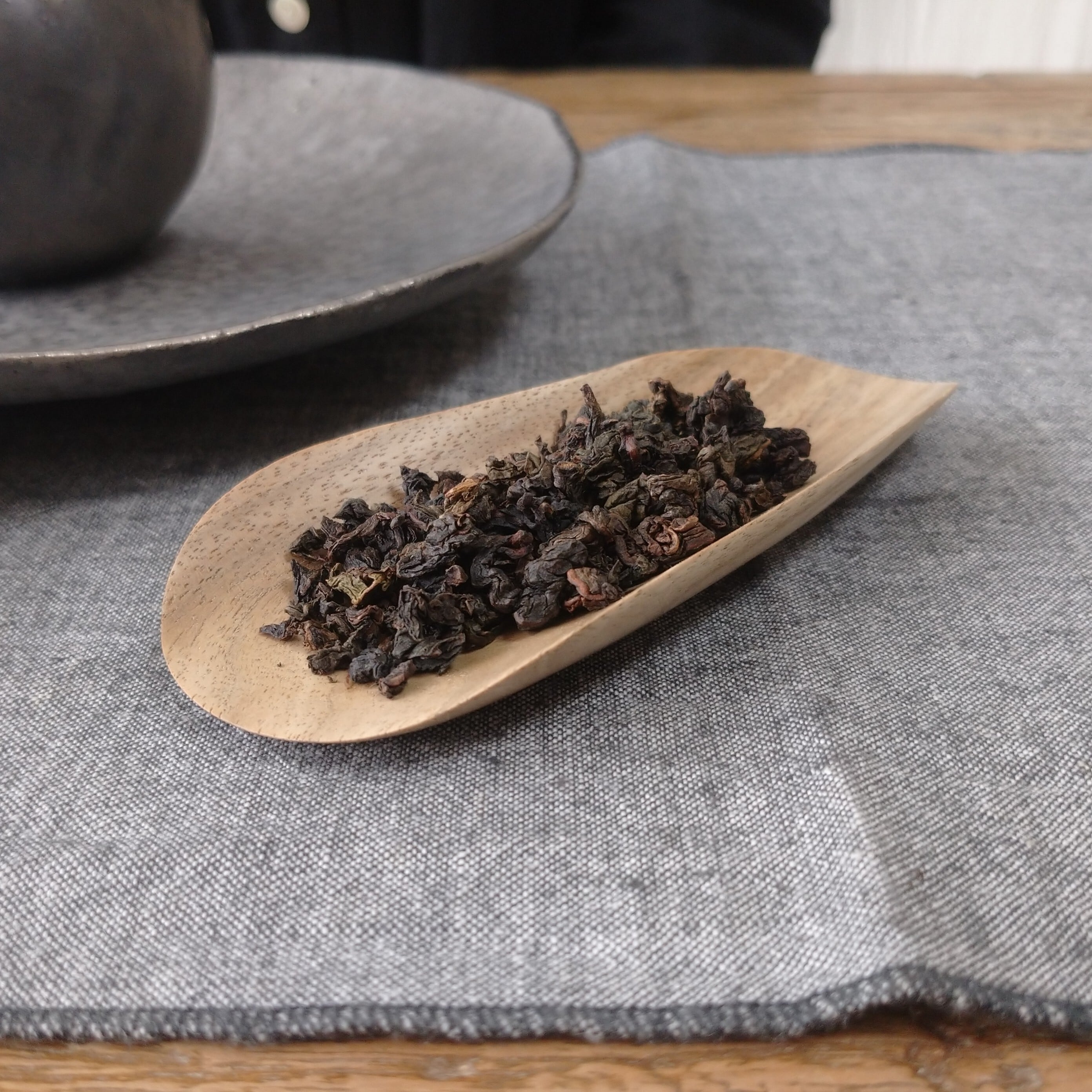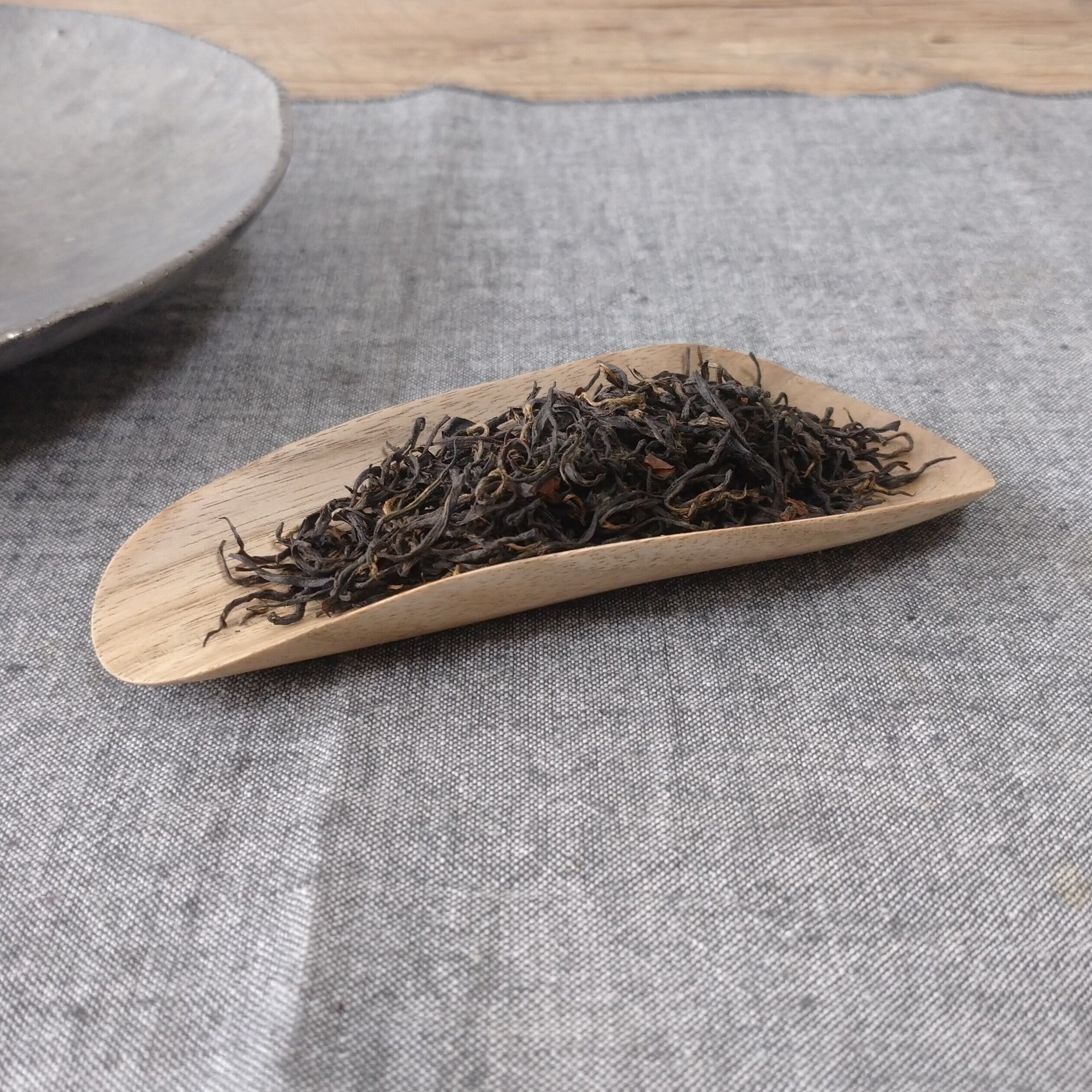 小さく浅めの茶則なので、小さめ~中程度の茶葉を載せるのに向いています。(写真はそれぞれ、安渓鉄観音を5g、九曲紅梅を3g載せています。)