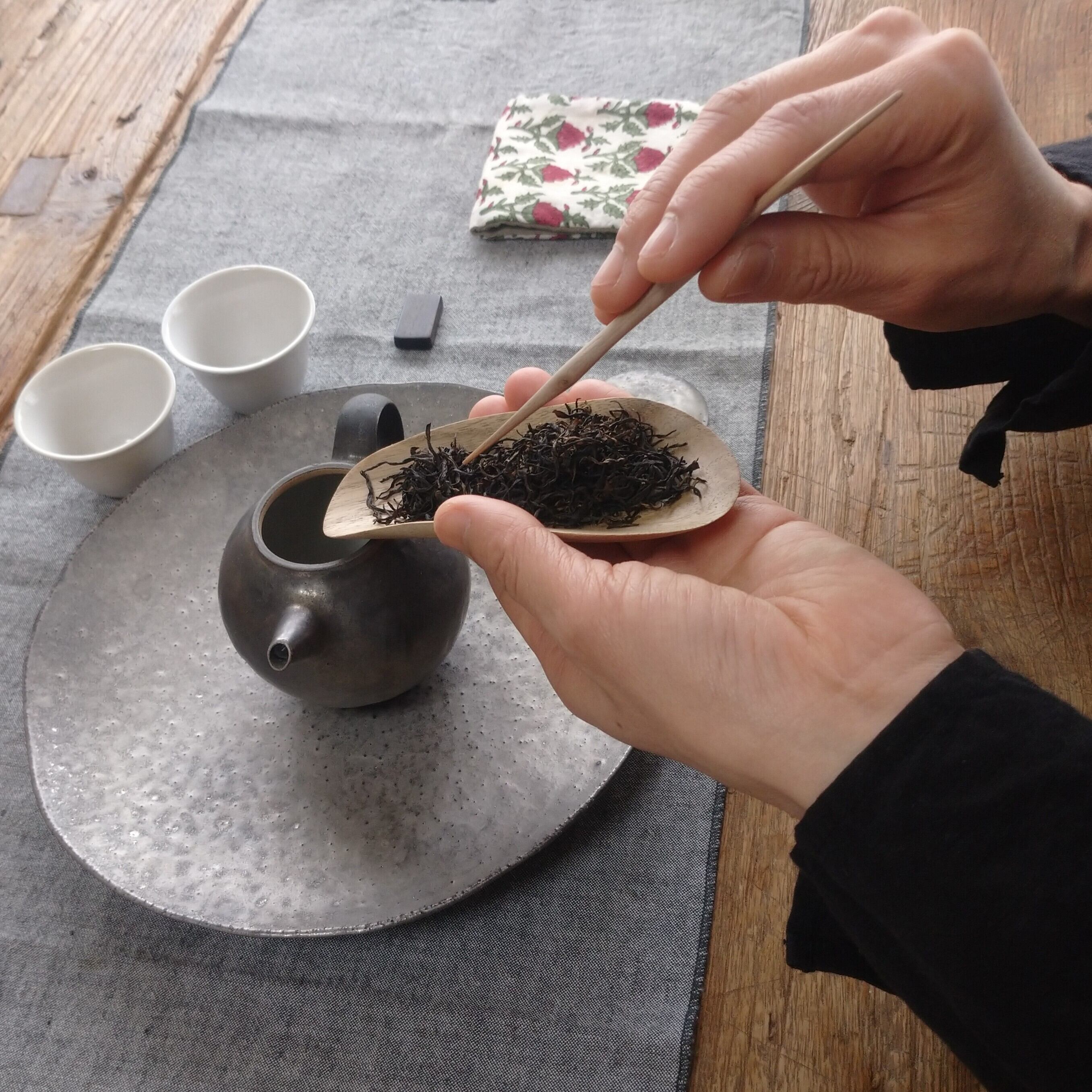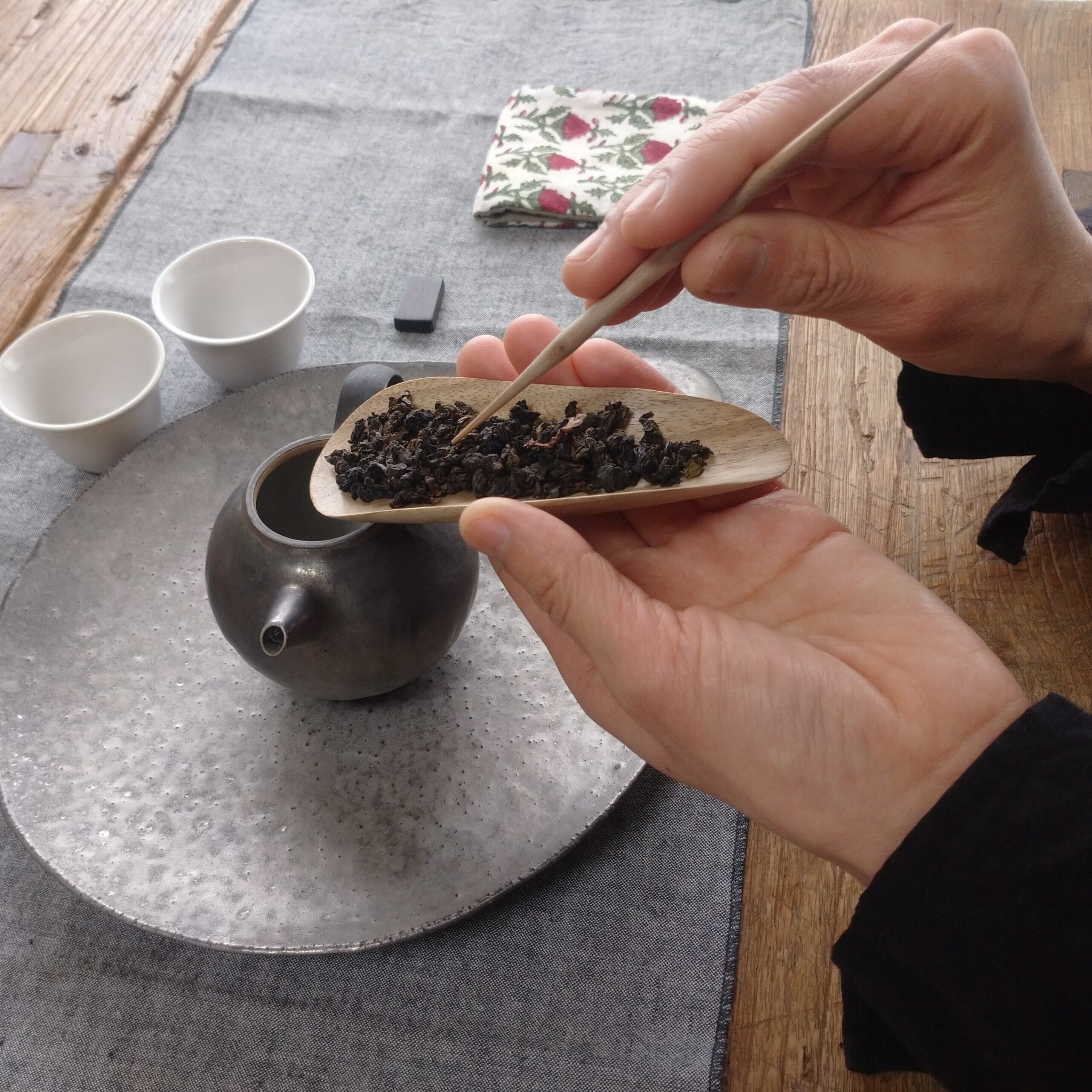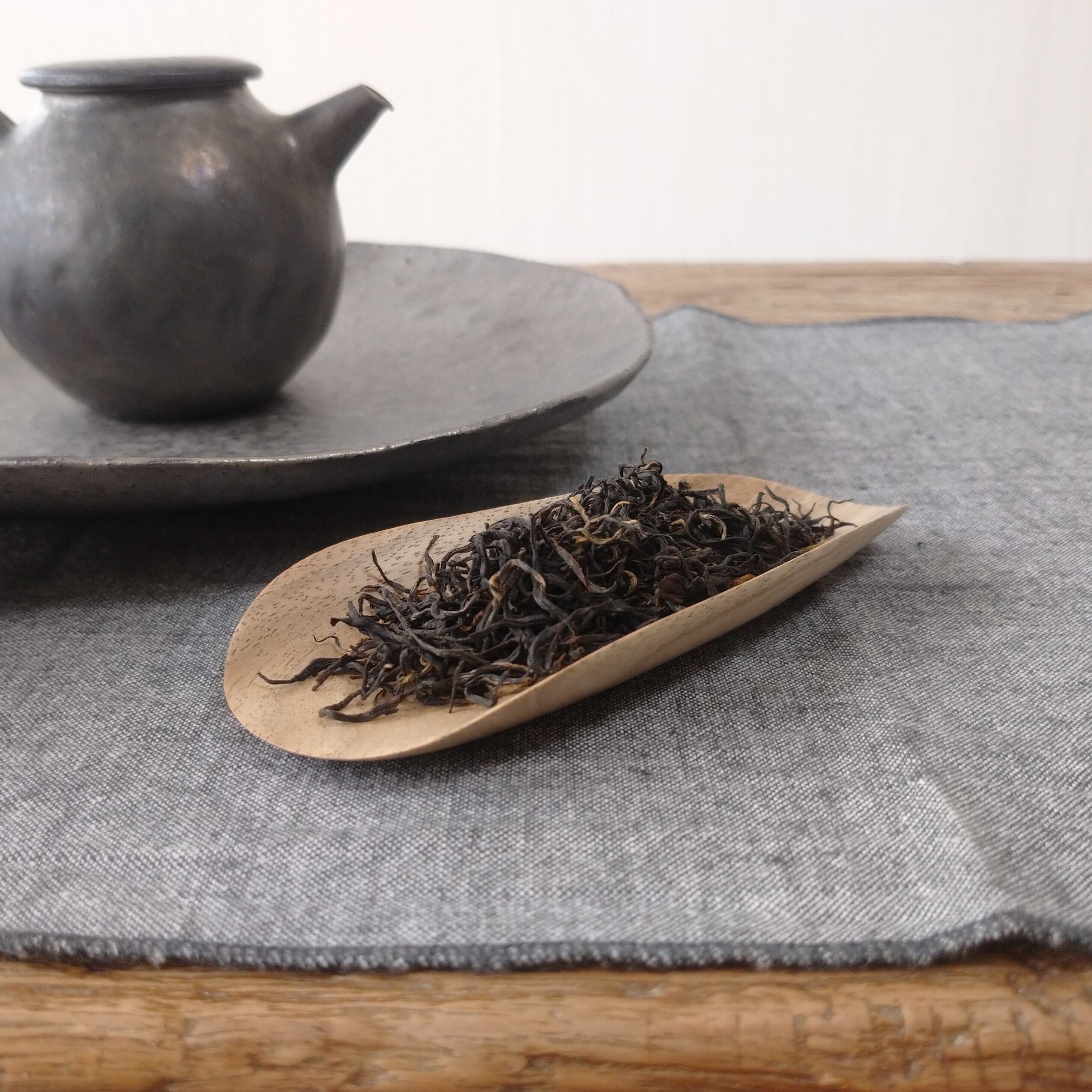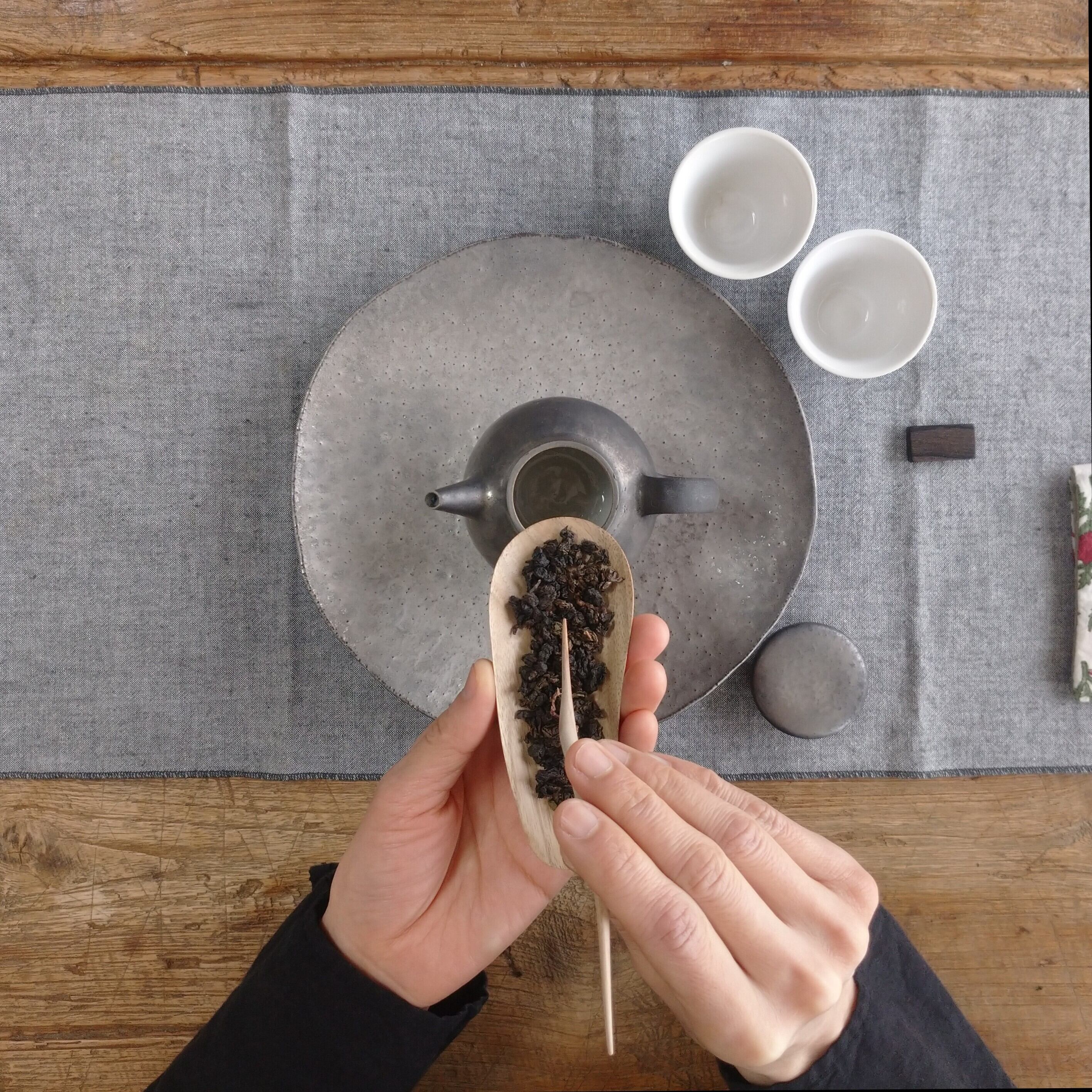 小さく浅めの茶則なので、小さめ~中程度の茶葉を載せるのに向いています。(写真はそれぞれ、安渓鉄観音を5g、九曲紅梅を3g載せています。)