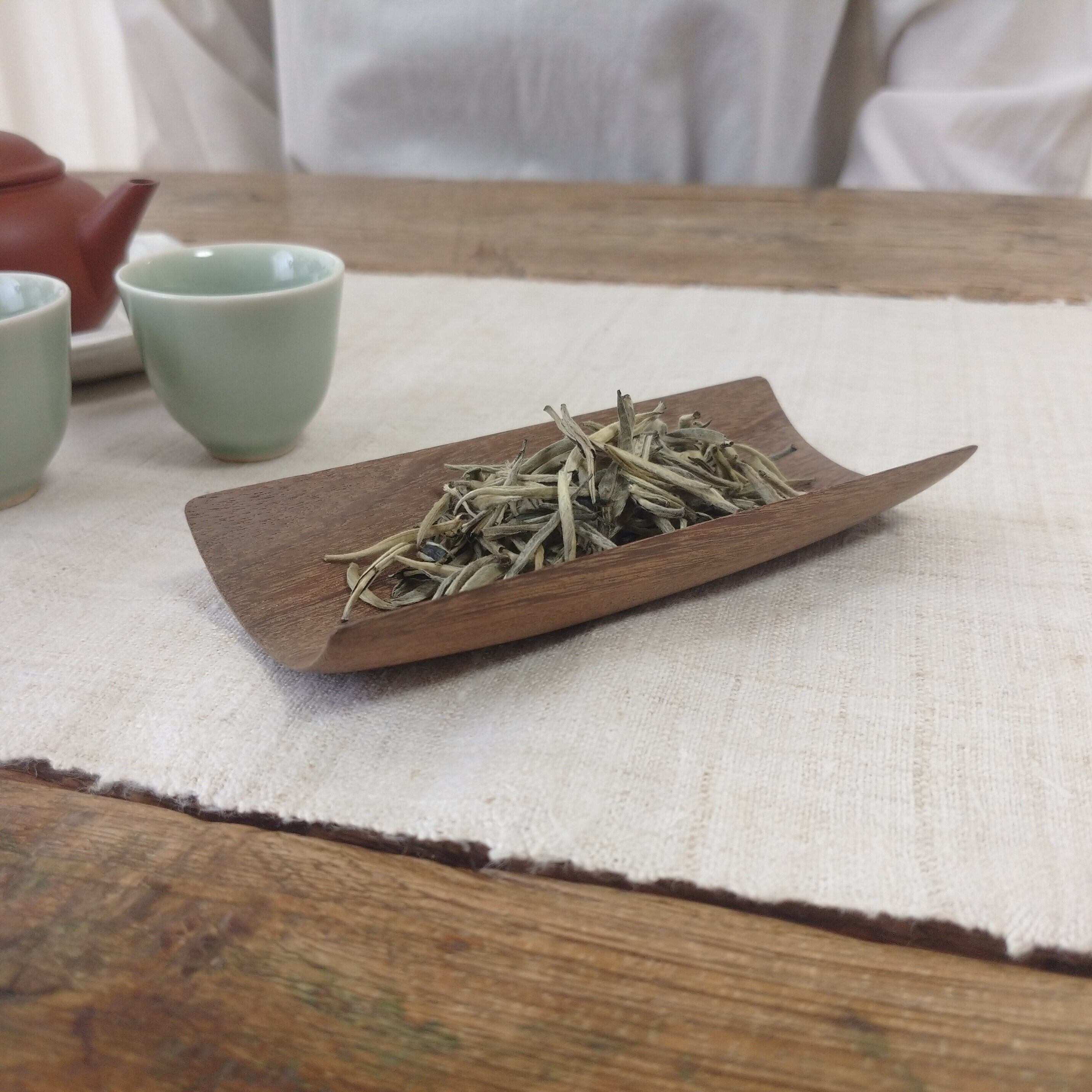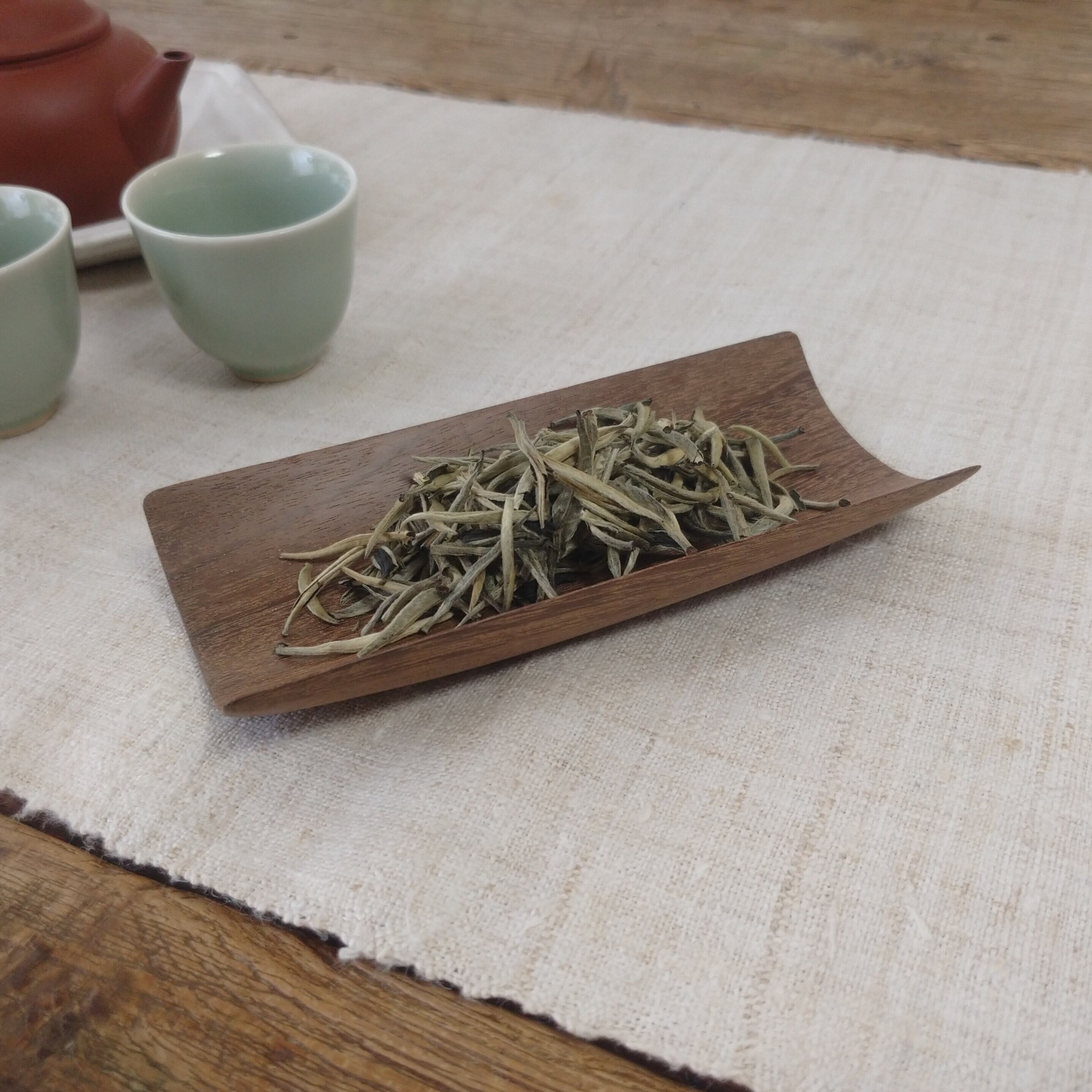 小さく浅めの茶則なので、小さめ~中程度の茶葉を載せるのに向いています。(写真はそれぞれ、白茶 月芽を3g、梨山烏龍を5g載せています。)