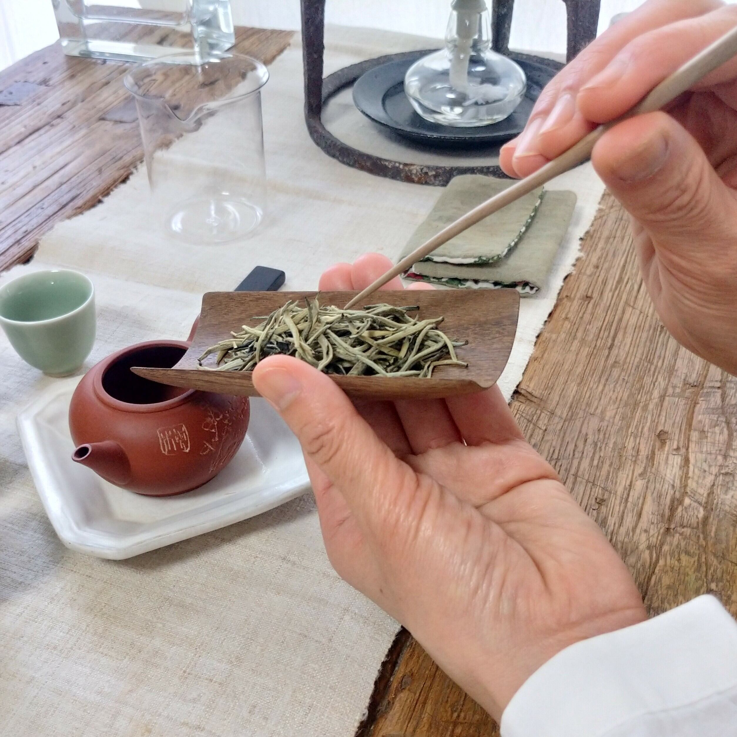 口の大きな茶壺や蓋碗に合わせて使うのに向いていますが、小さめの茶葉でしたら、口の小さな茶壺にも比較的入れ易いです。