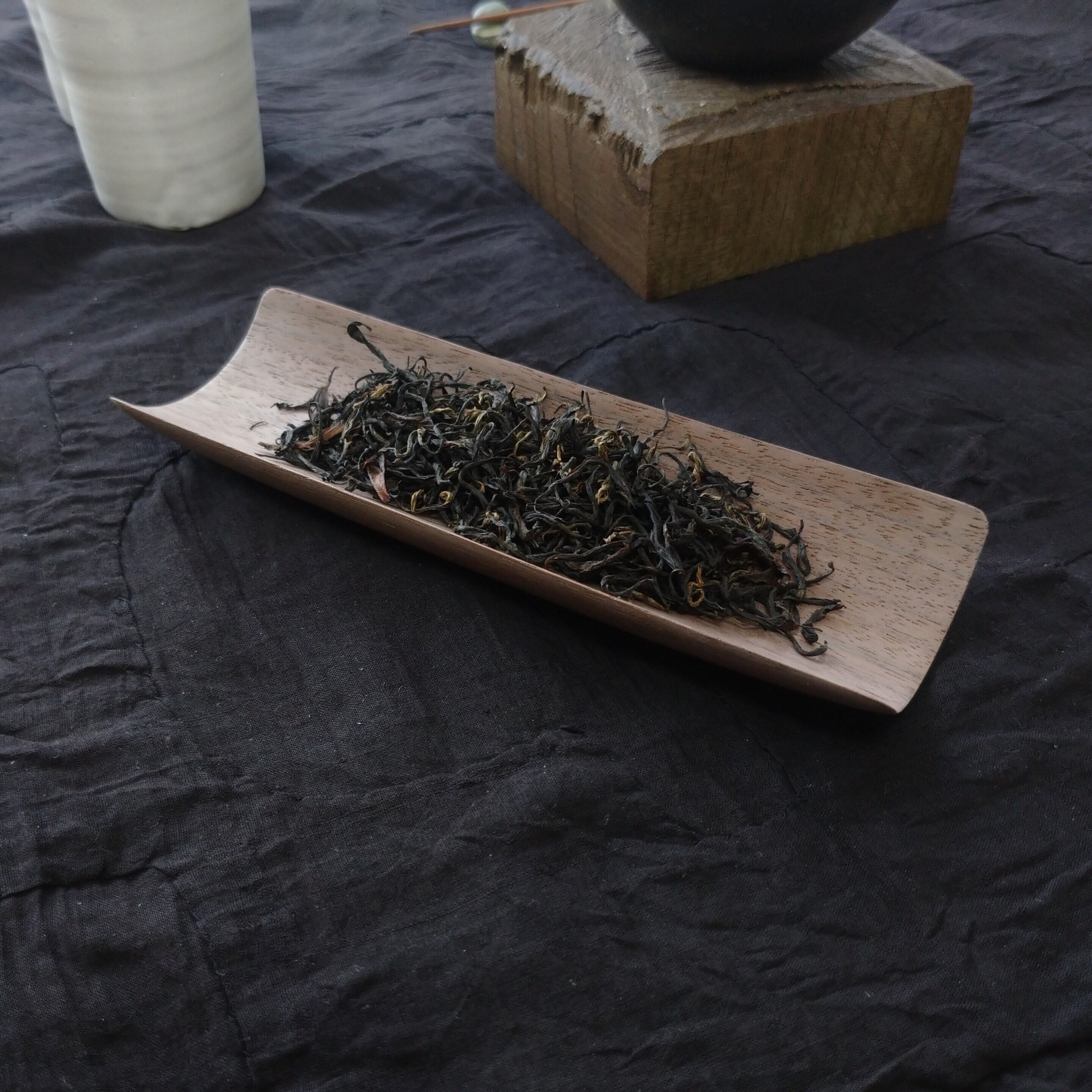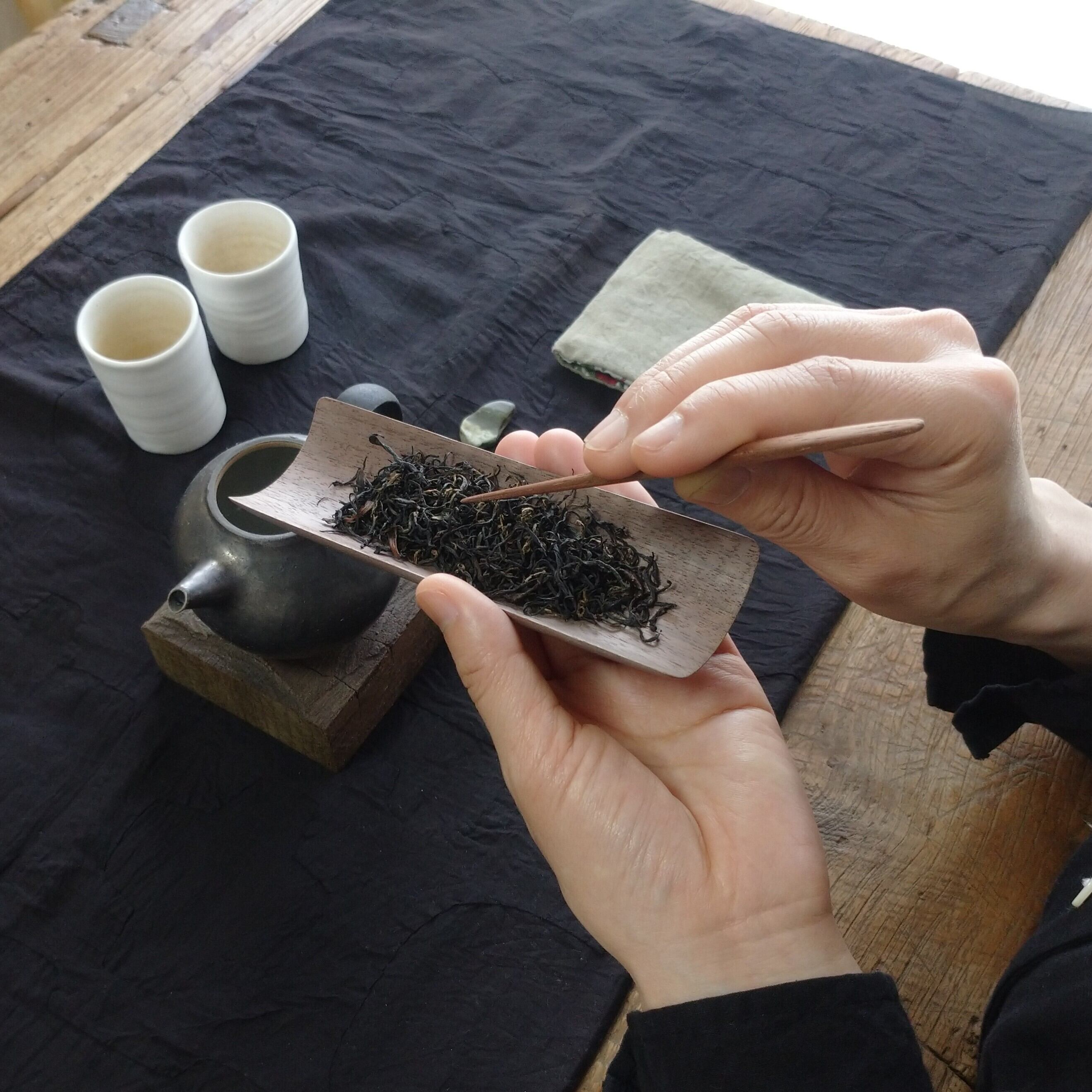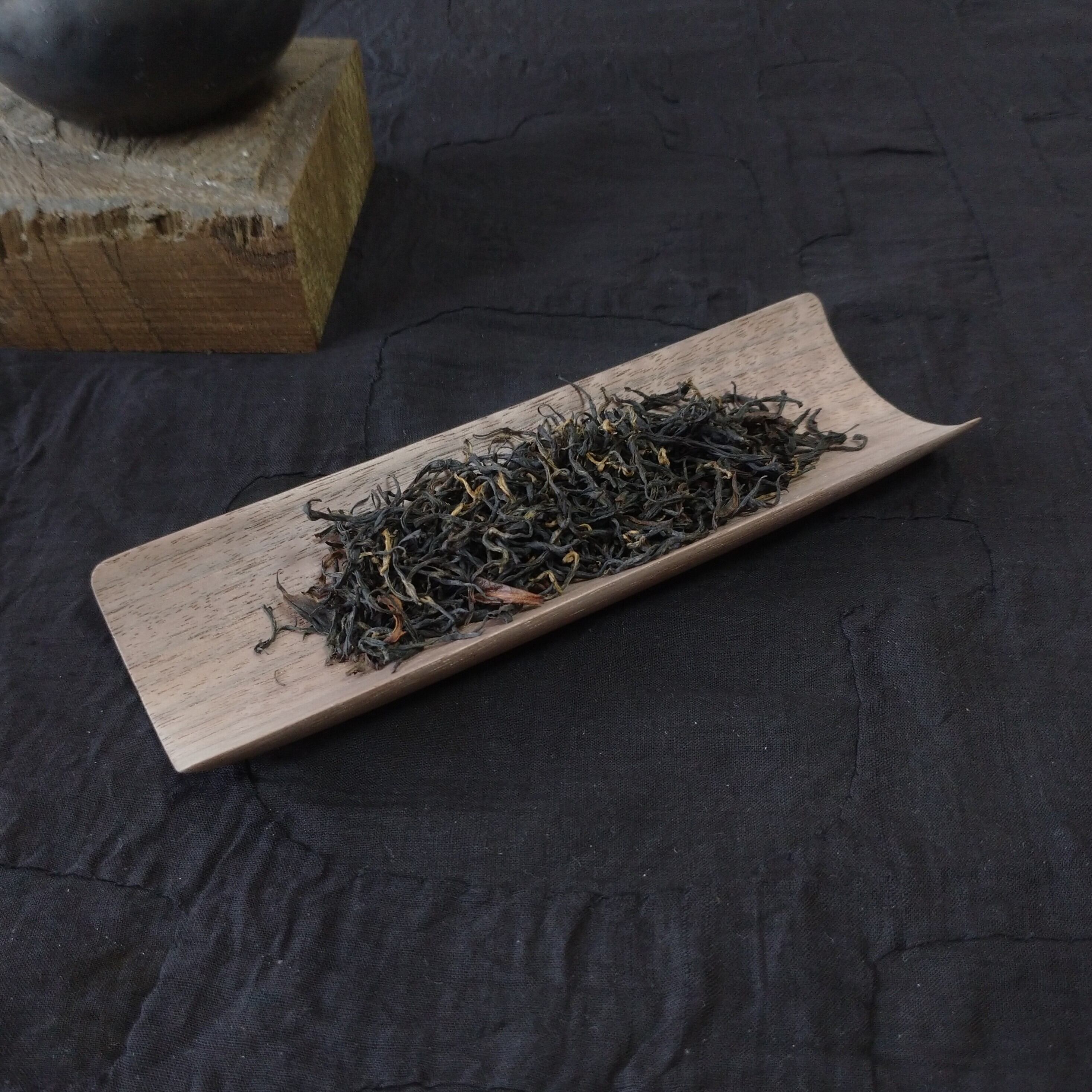 浅めの茶則なので、鉄観音のように丸まった茶葉や、小さめの茶葉を載せるのに向いています。(写真は九曲紅梅を4g載せています。)