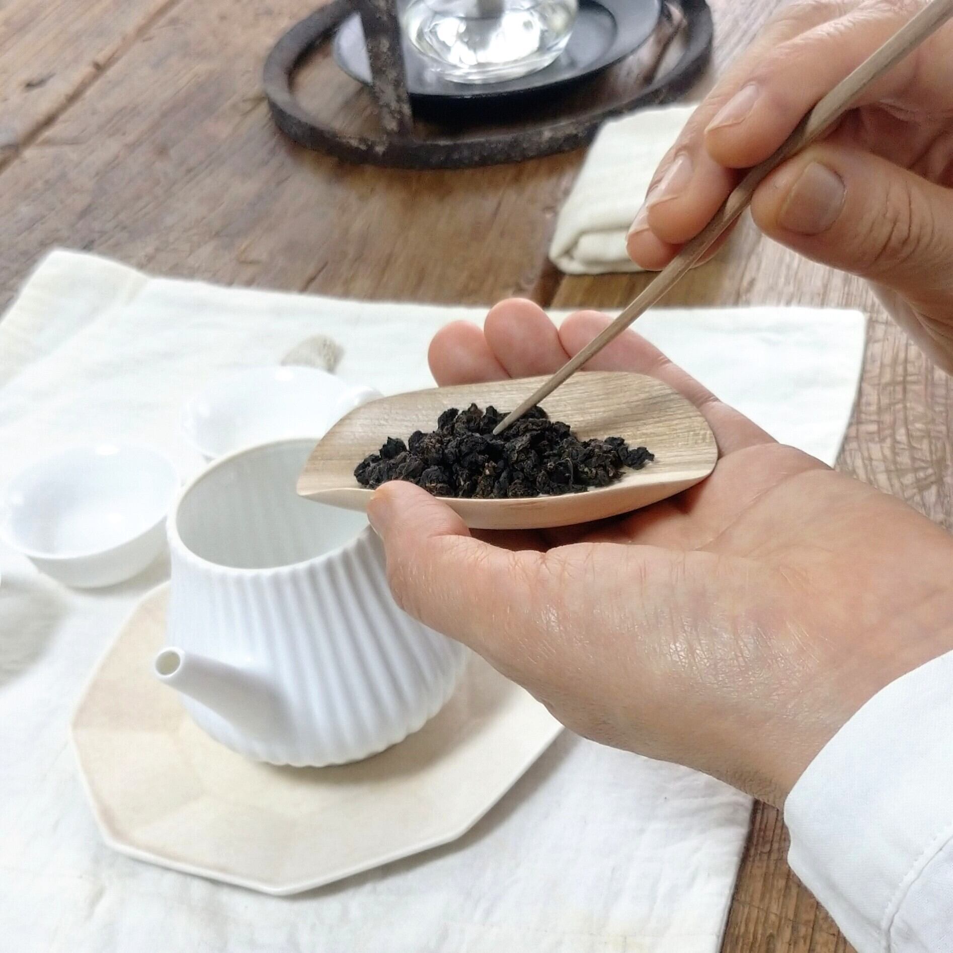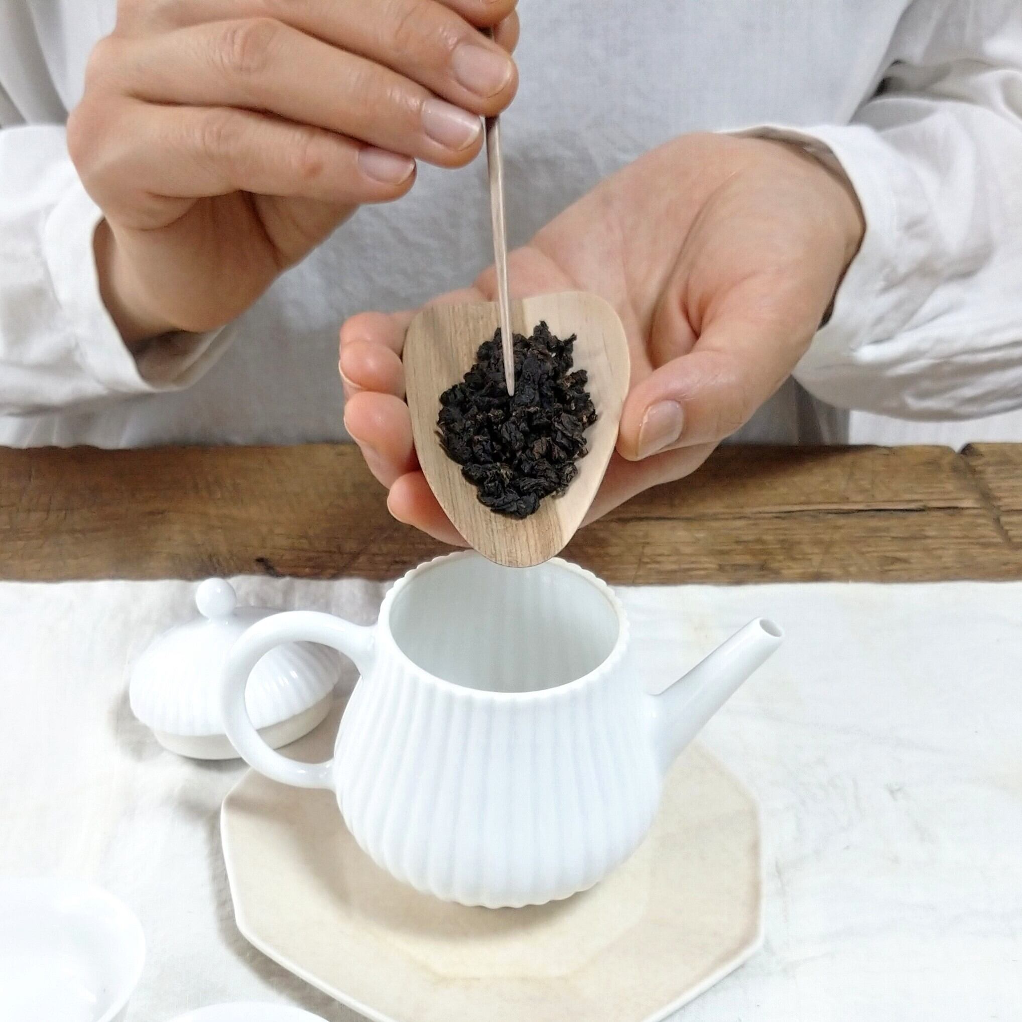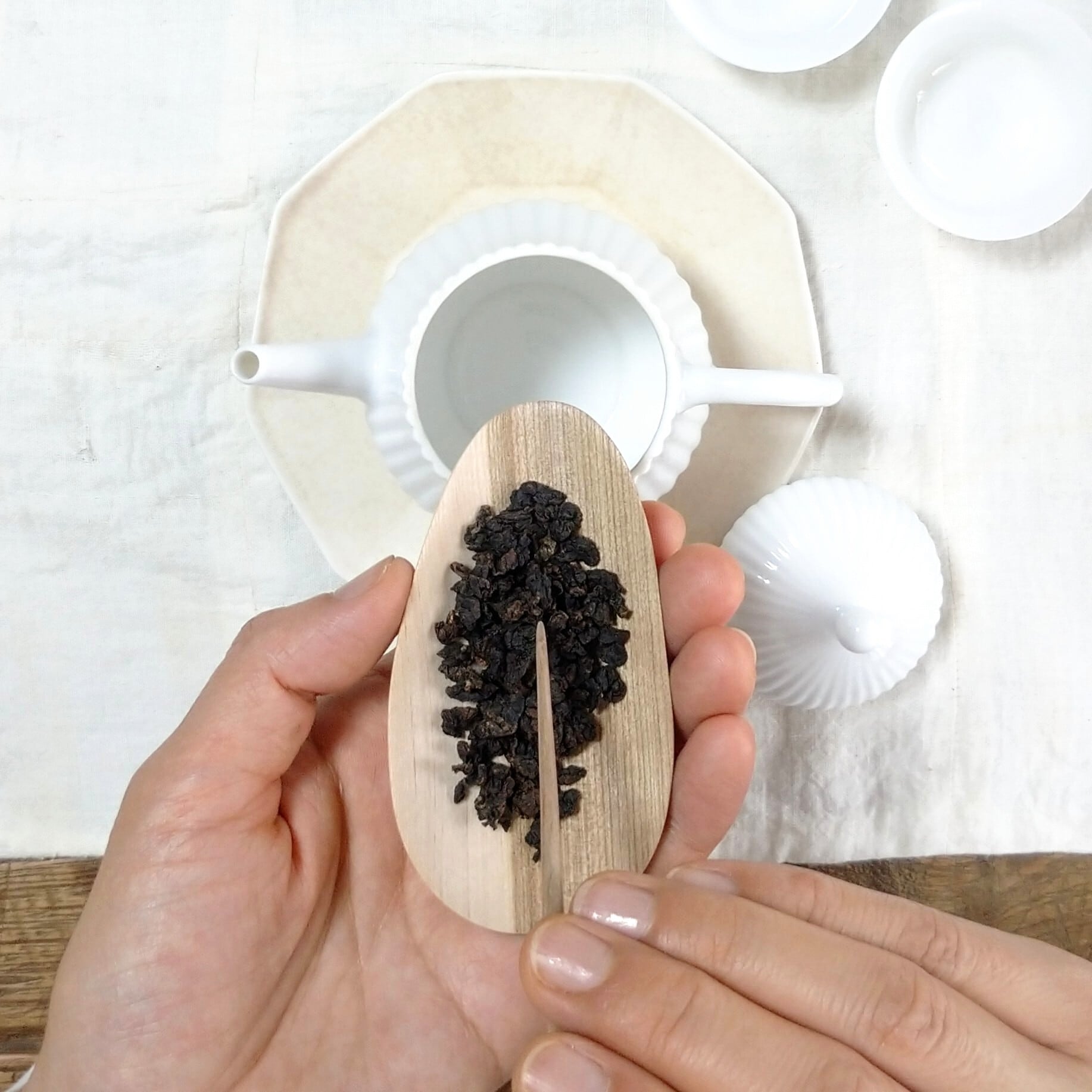 口の小さな茶壺には狭い側から、大きな茶壺や蓋碗には広い側から茶葉を入れると使いやすいと思います。