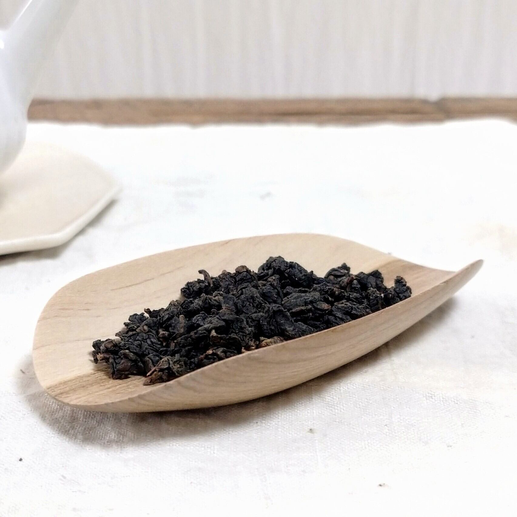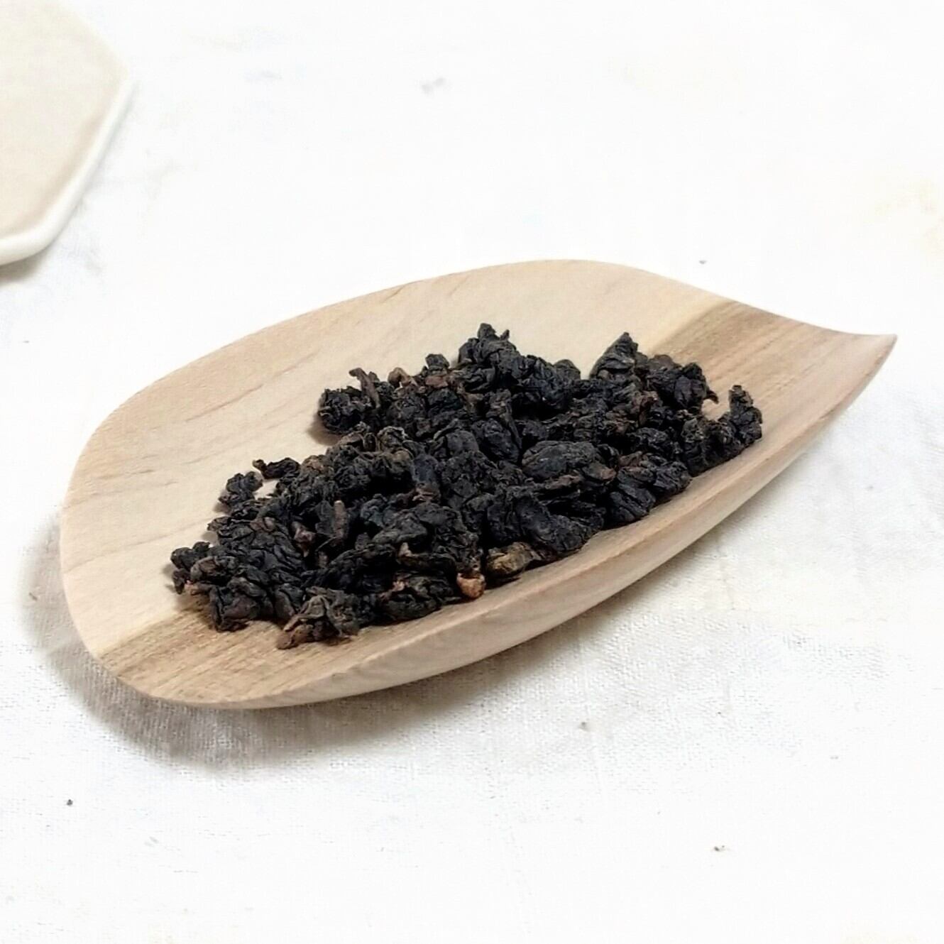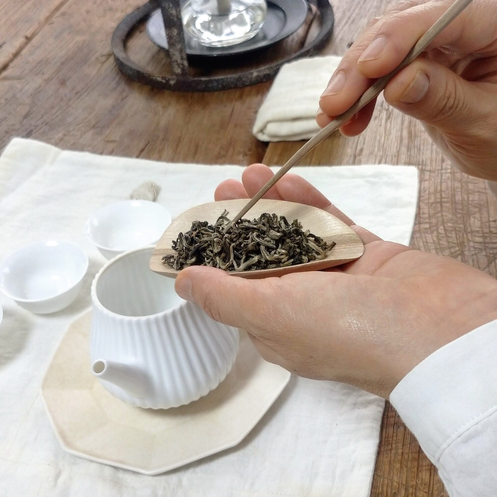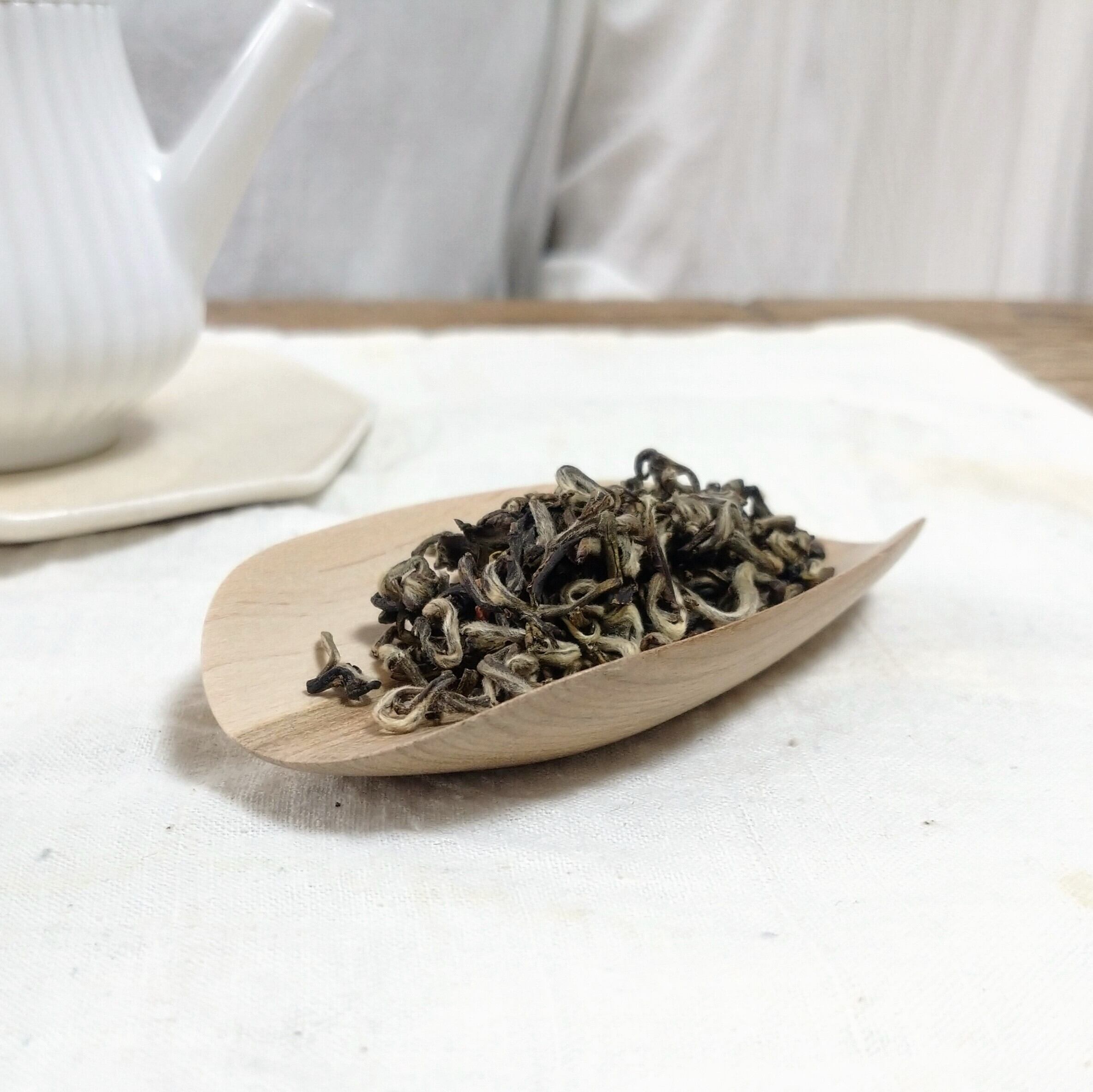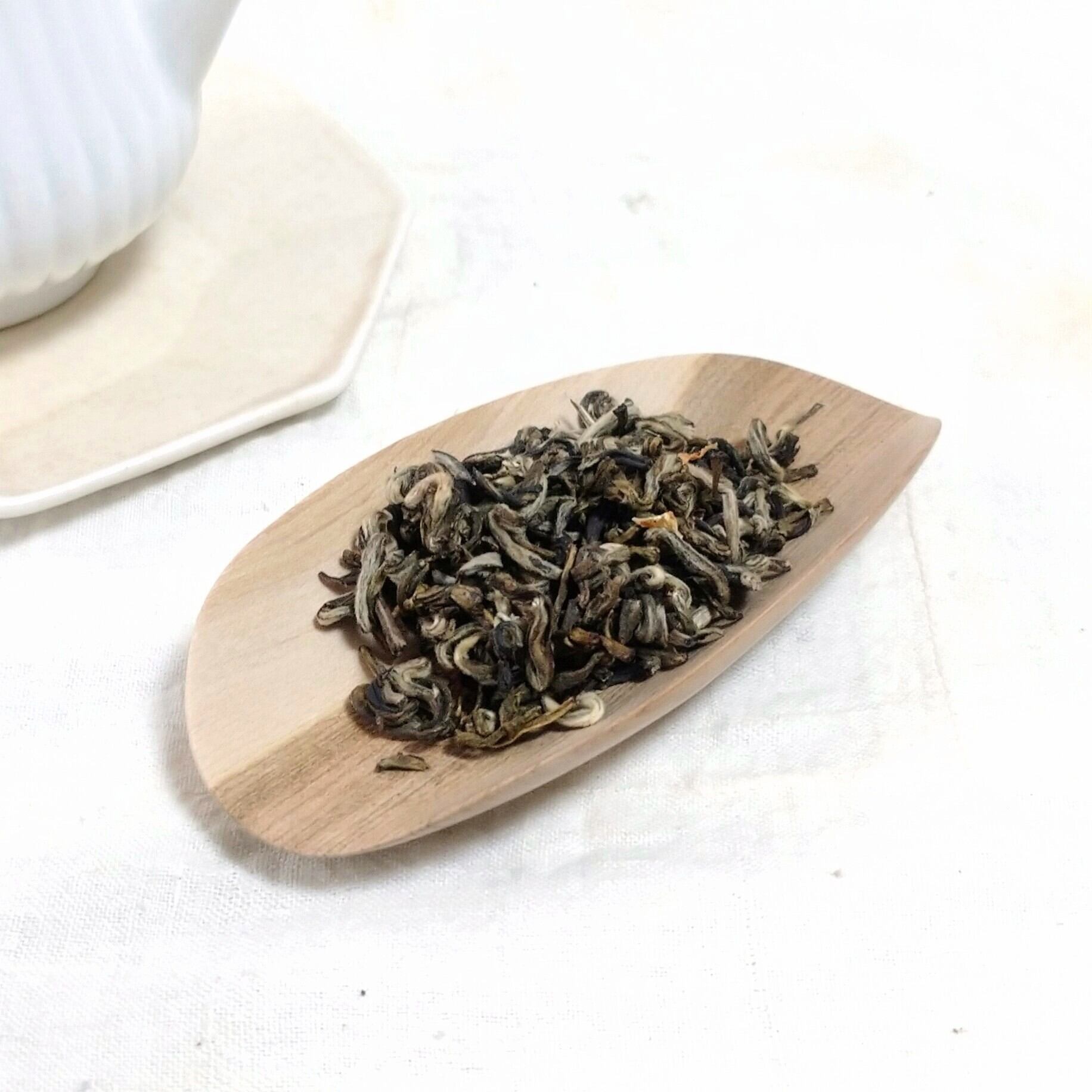 小さく浅めの茶則なので、小さめ~中程度の茶葉を載せるのに向いています。(写真はそれぞれ、白芽奇蘭を4g、茉莉花金螺茶を3g載せています。)