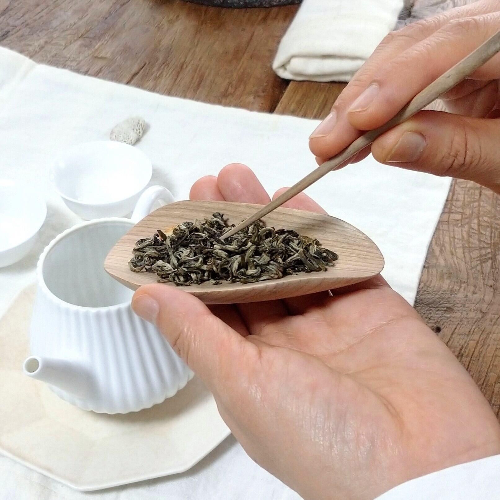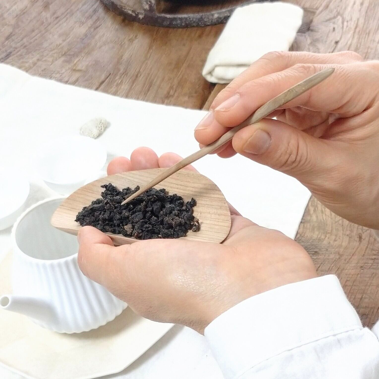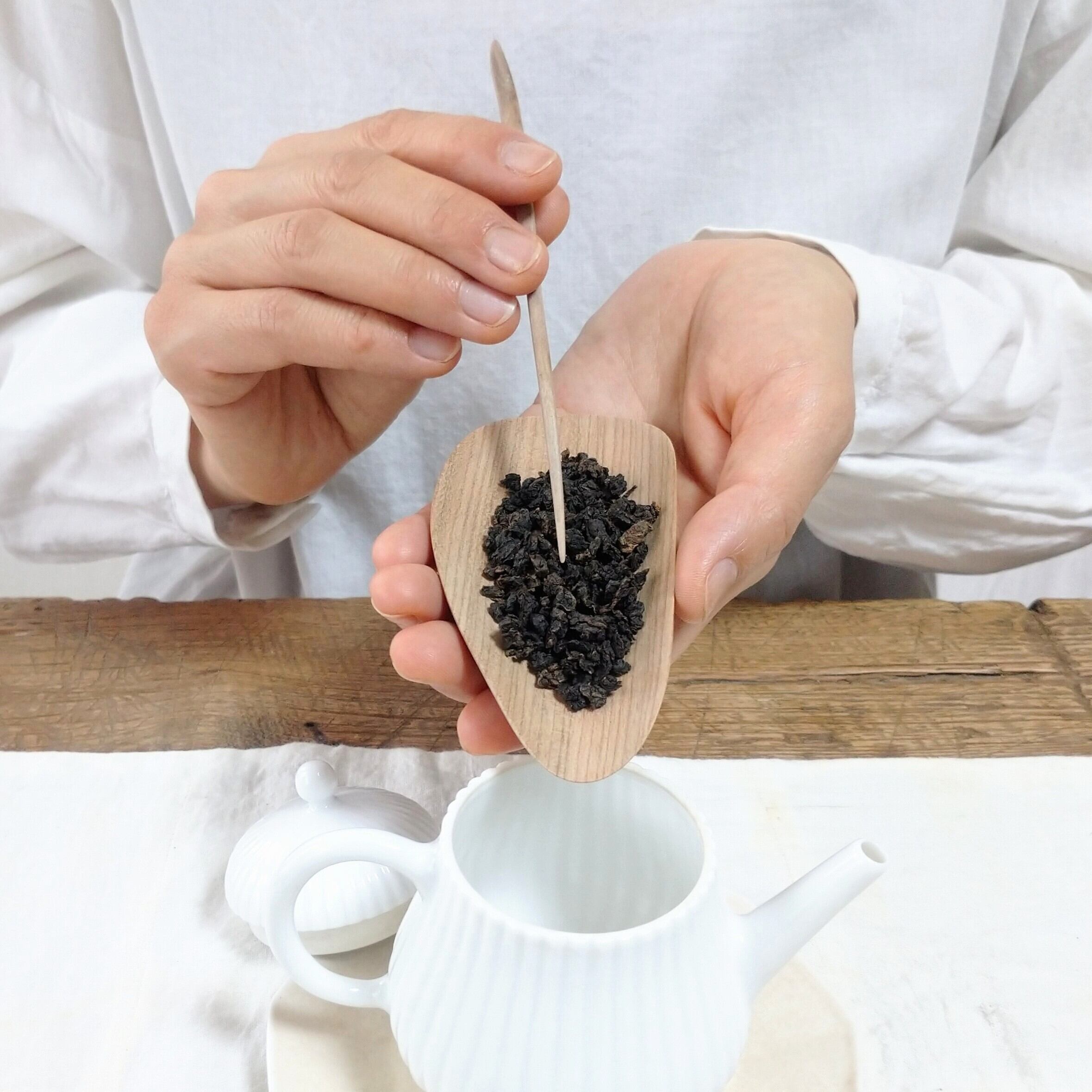 口の小さな茶壺には狭い側から、大きな茶壺や蓋碗には広い側から茶葉を入れると使いやすいと思います。