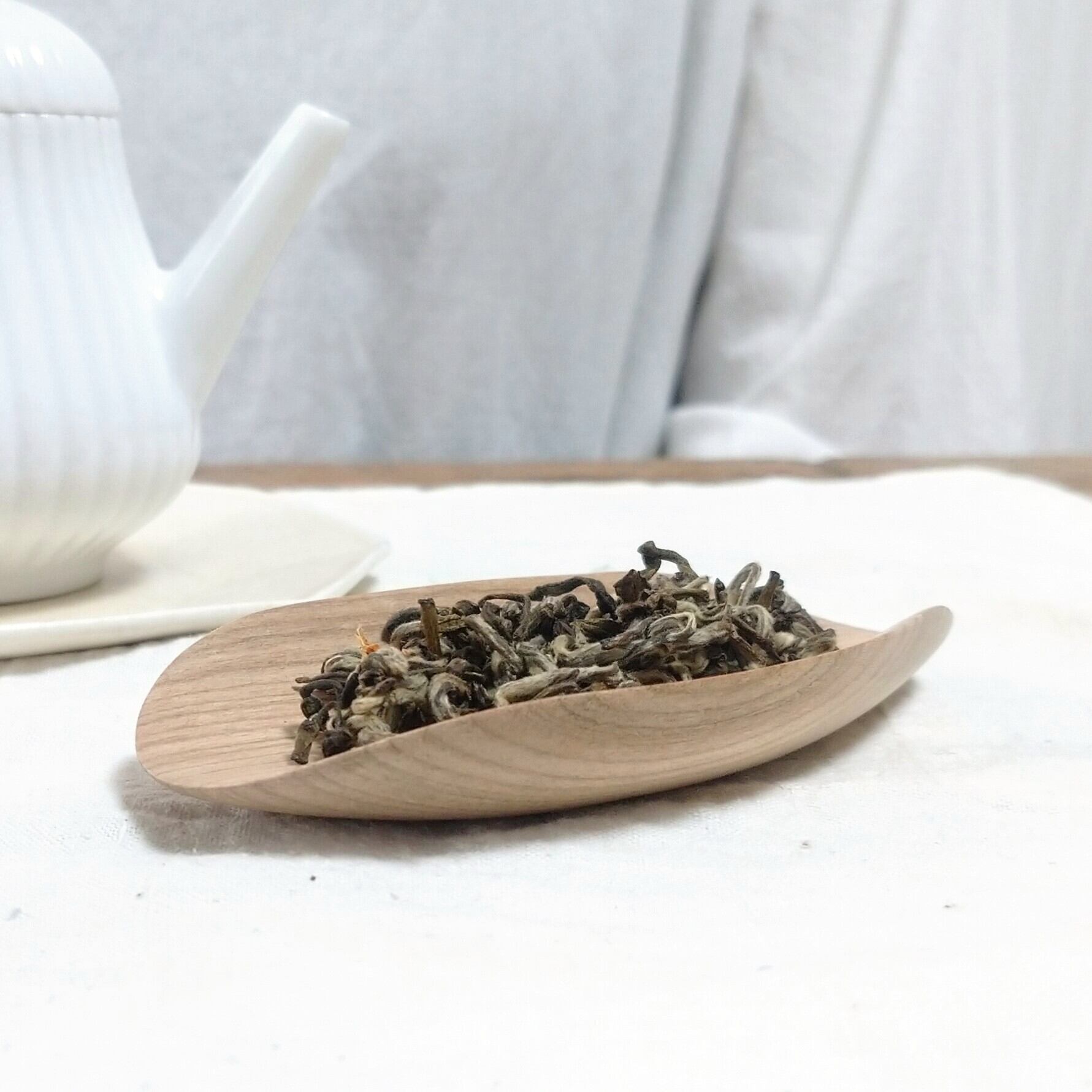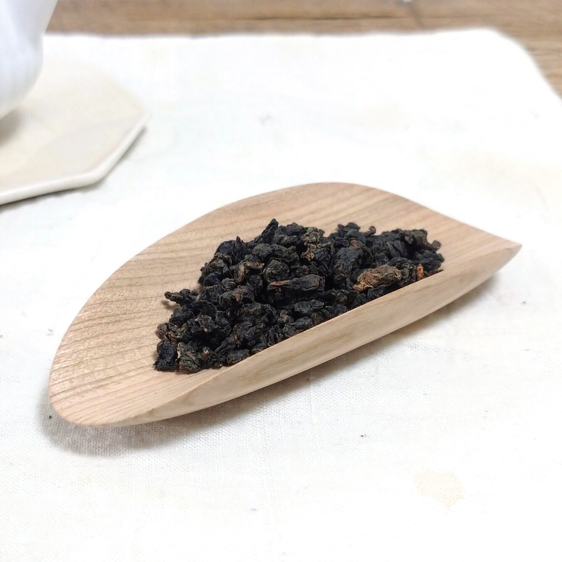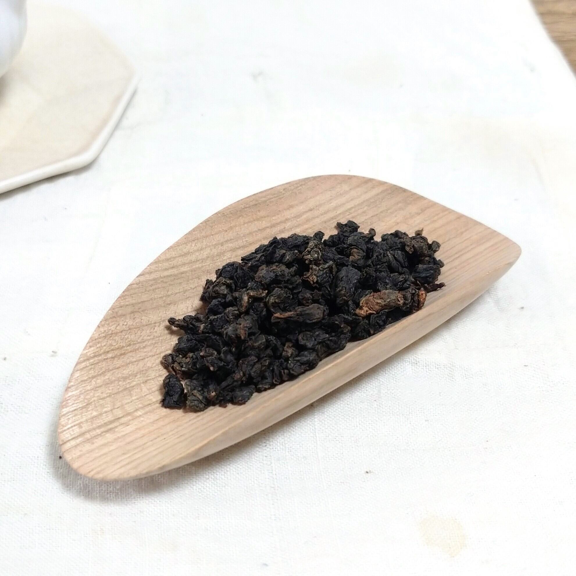 小さく浅めの茶則なので、小さめ~中程度の茶葉を載せるのに向いています。(写真はそれぞれ、白芽奇蘭を5g、茉莉花金螺茶を3g載せています。)