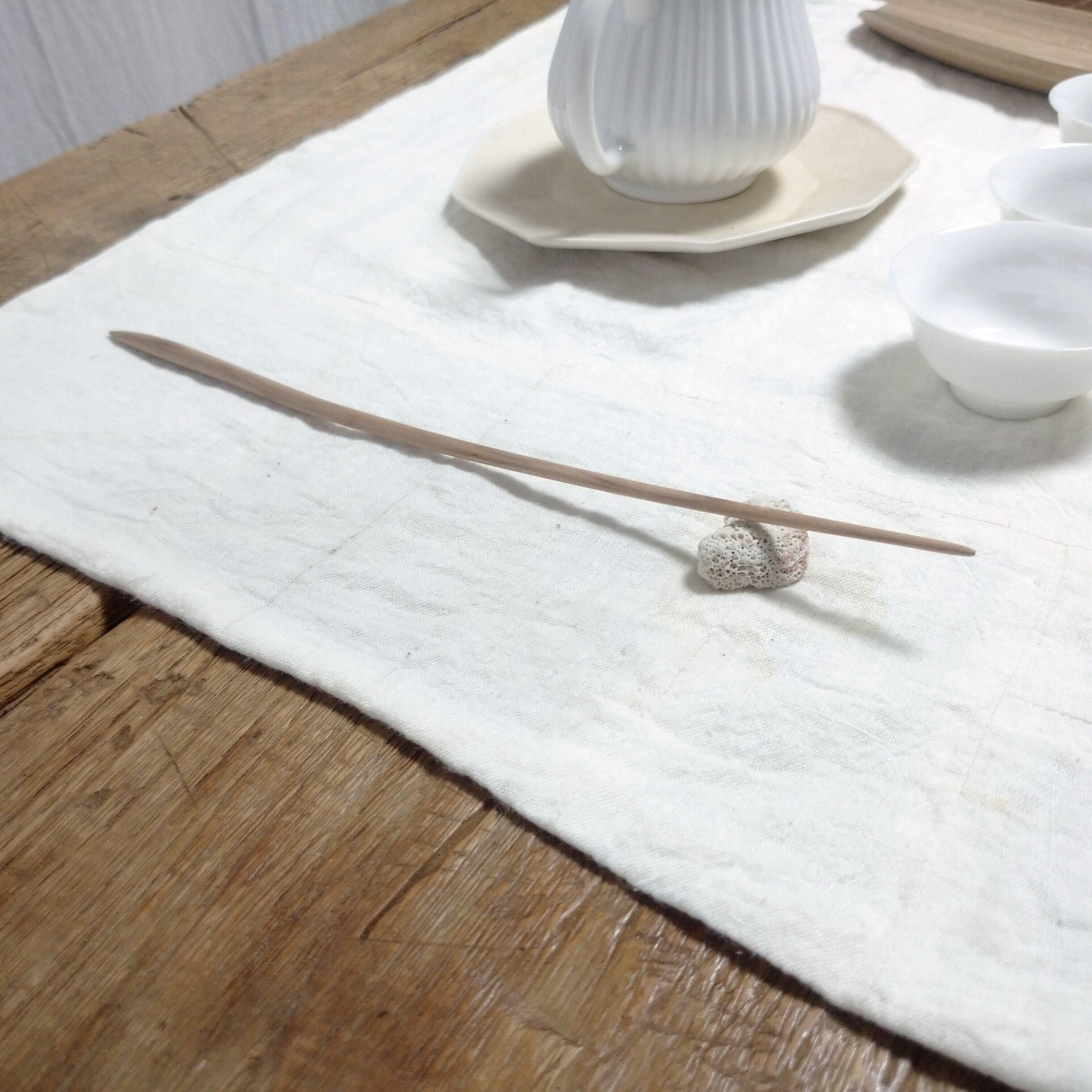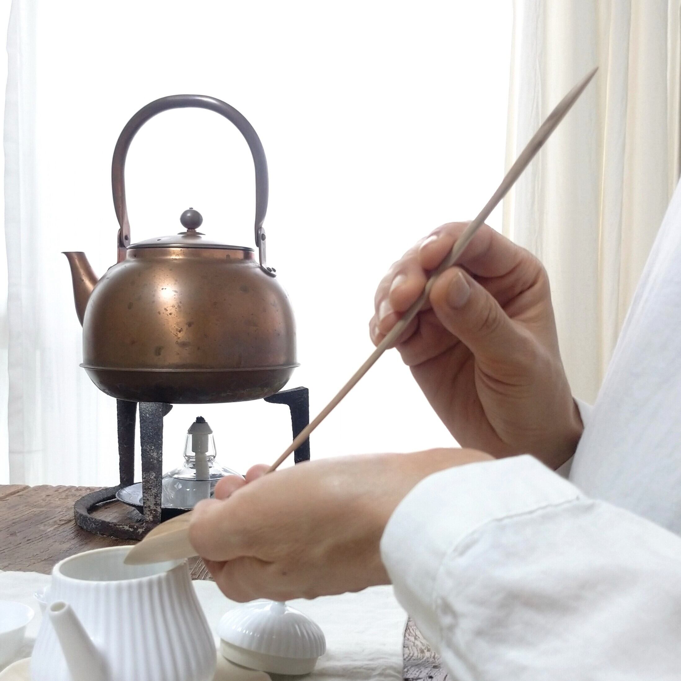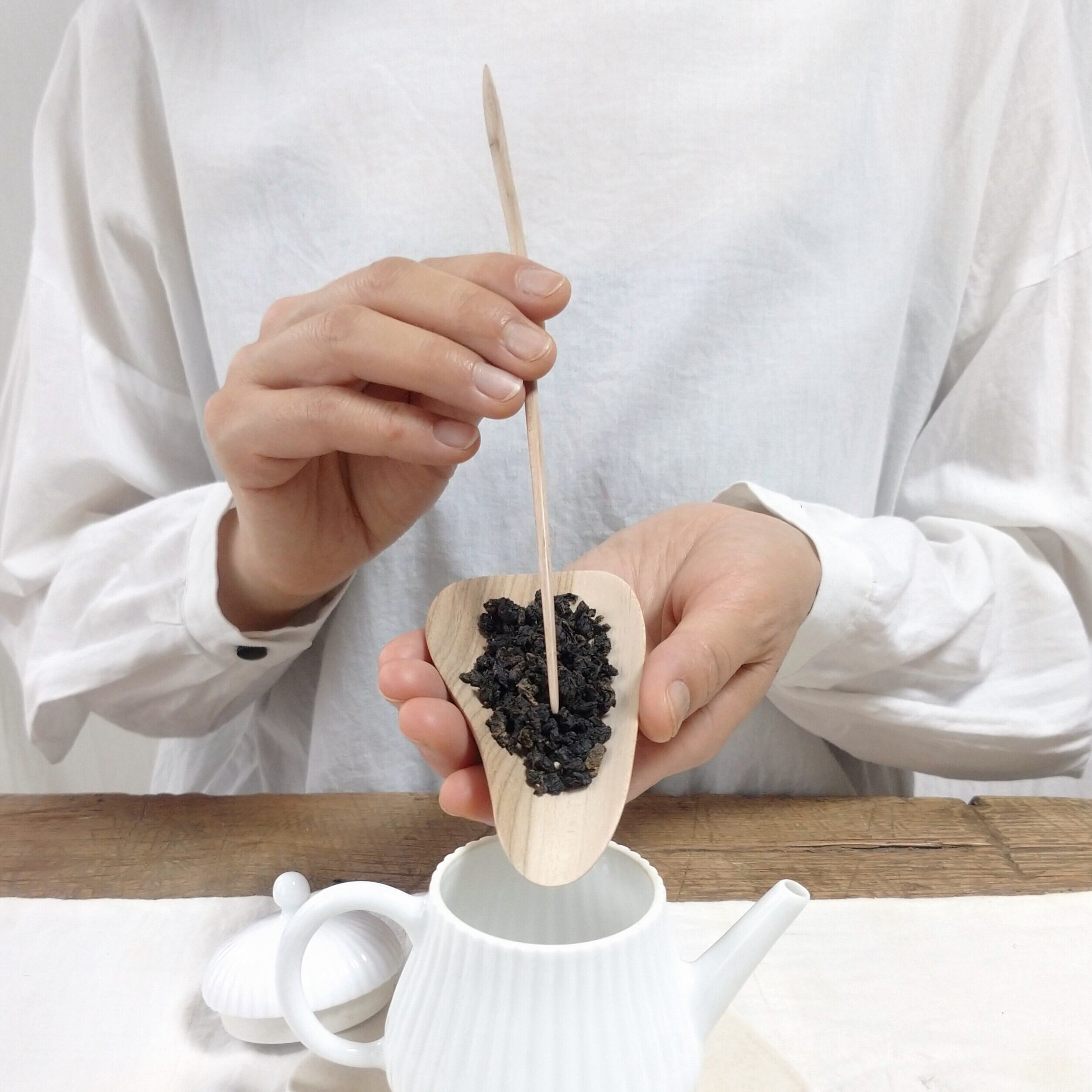 茶通は、茶壺の注ぎ口が詰まった時に使う道具とされていますが、他にも、茶則を使って茶壺に茶葉を入れる際に添えたり、一煎淹れた後に茶壺の中で偏った茶葉を馴らしたりすることができます。