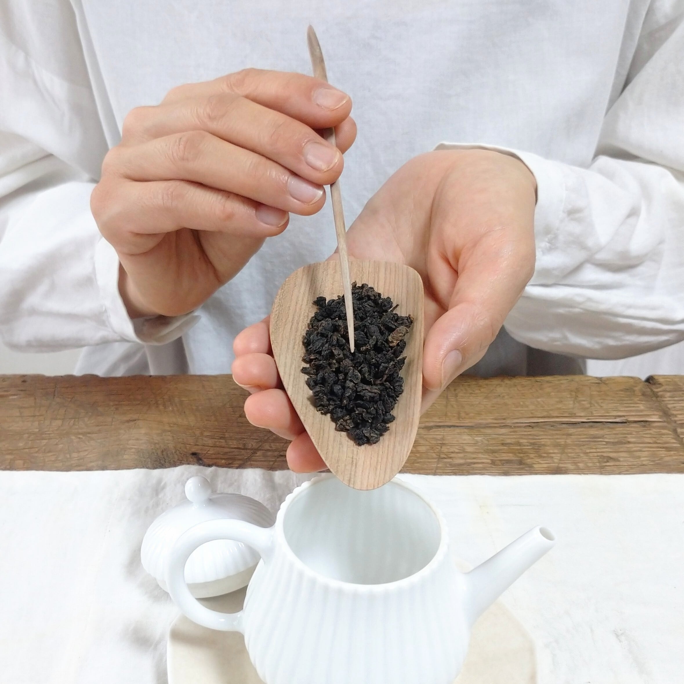 茶通は、茶壺の注ぎ口が詰まった時に使う道具とされていますが、他にも、茶則を使って茶壺に茶葉を入れる際に添えたり、一煎淹れた後に茶壺の中で偏った茶葉を馴らしたりすることができます。