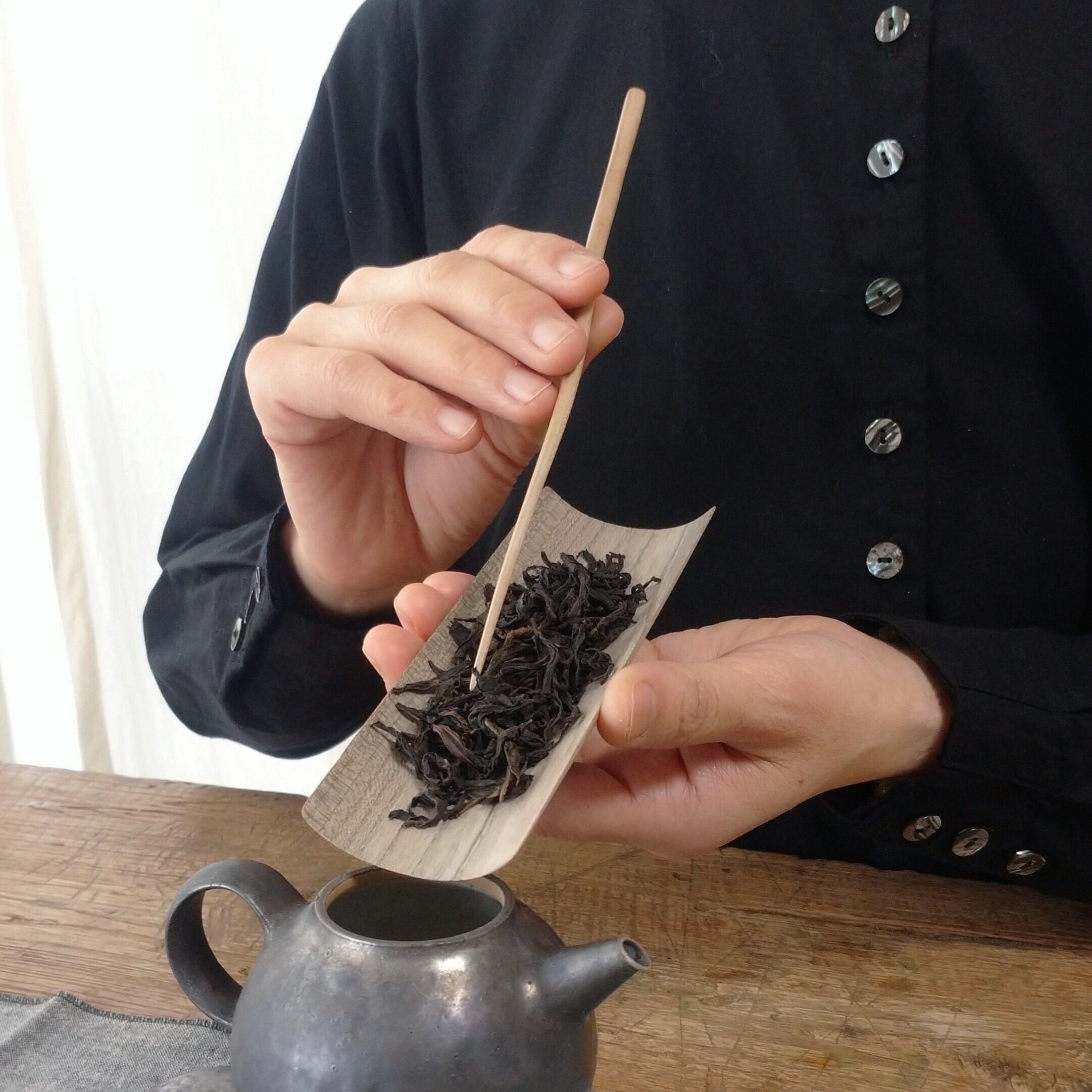 口の大きな茶壺や蓋碗に合わせて使うのに向いていますが、小さめの茶葉でしたら、口の小さな茶壺にも入れ易いと思います。