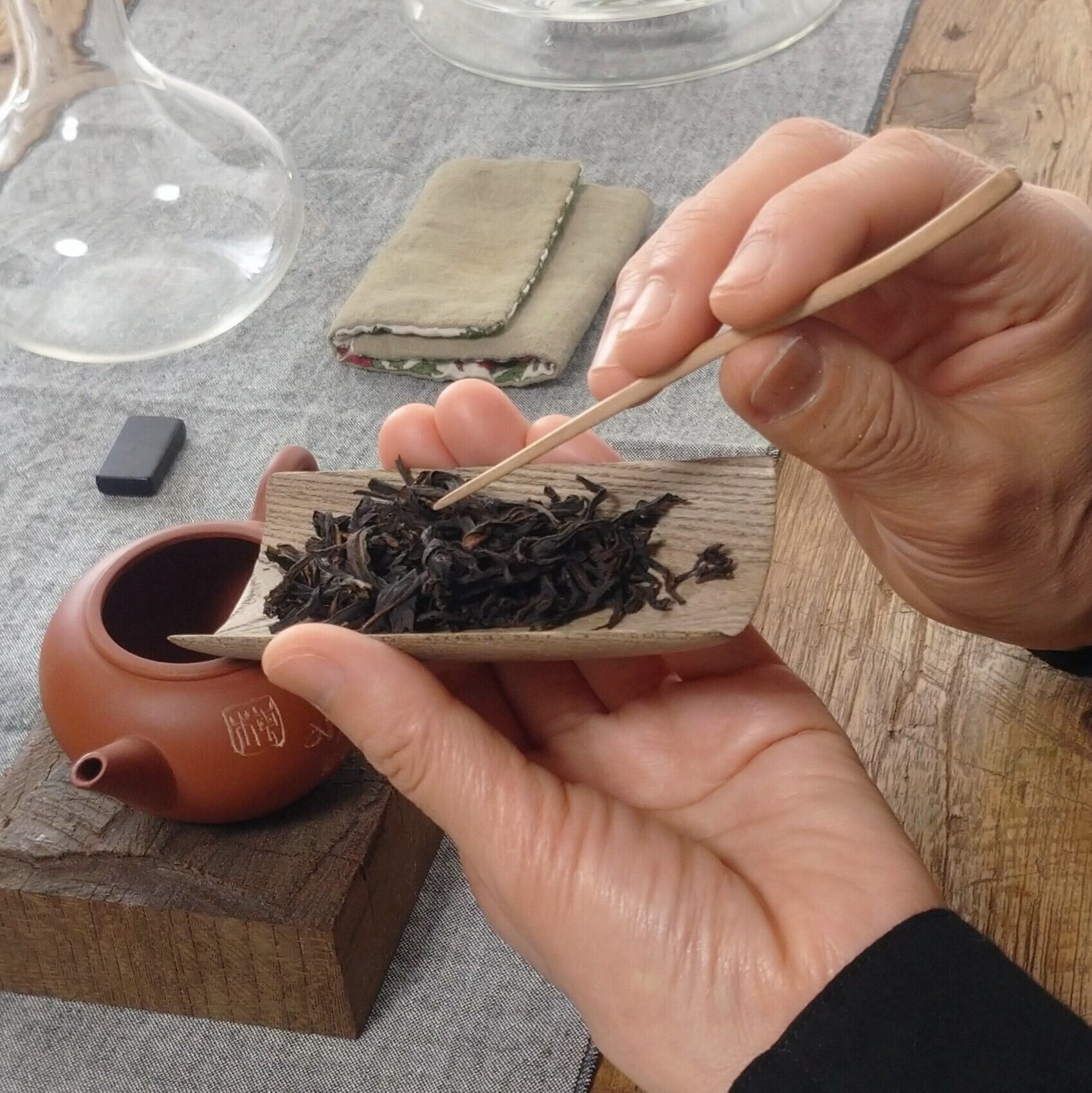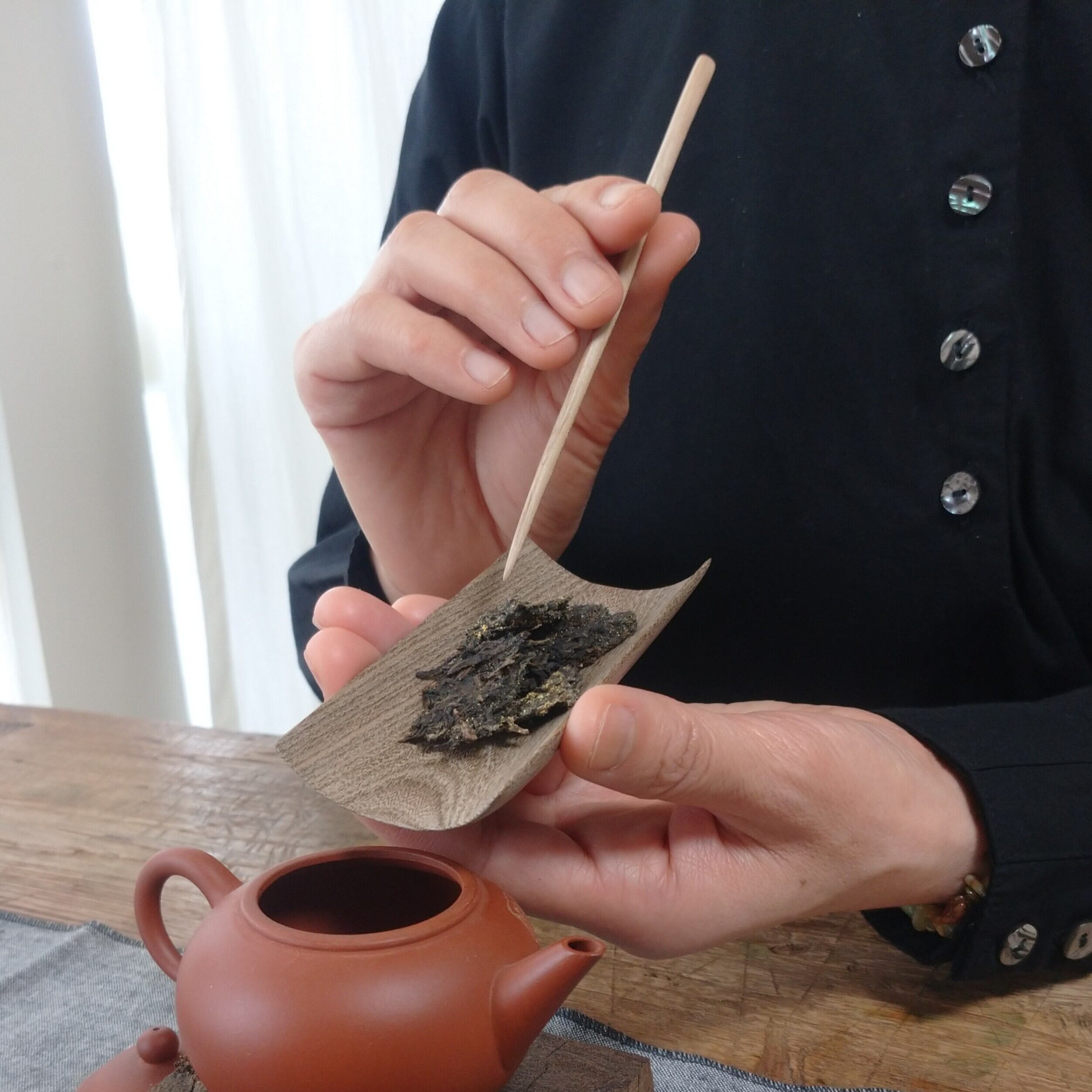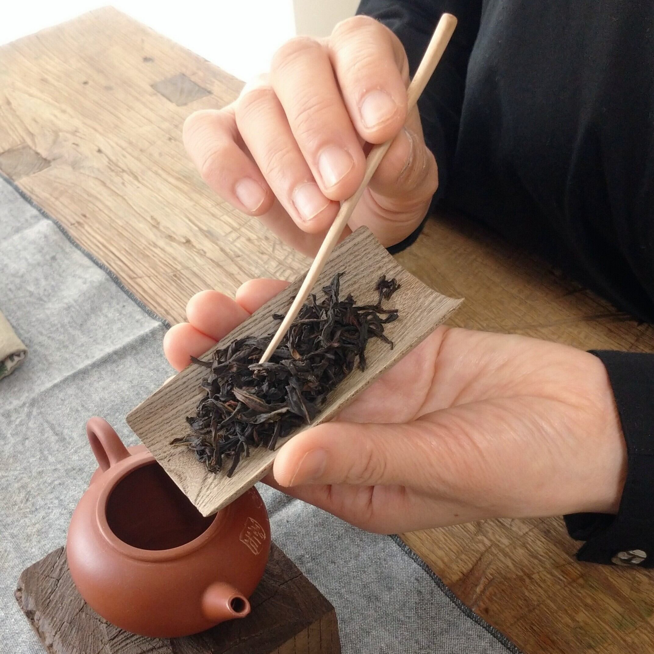 口の大きな茶壺や蓋碗に合わせて使うのに向いていますが、小さめの茶葉でしたら、口の小さな茶壺にも比較的入れ易いです。